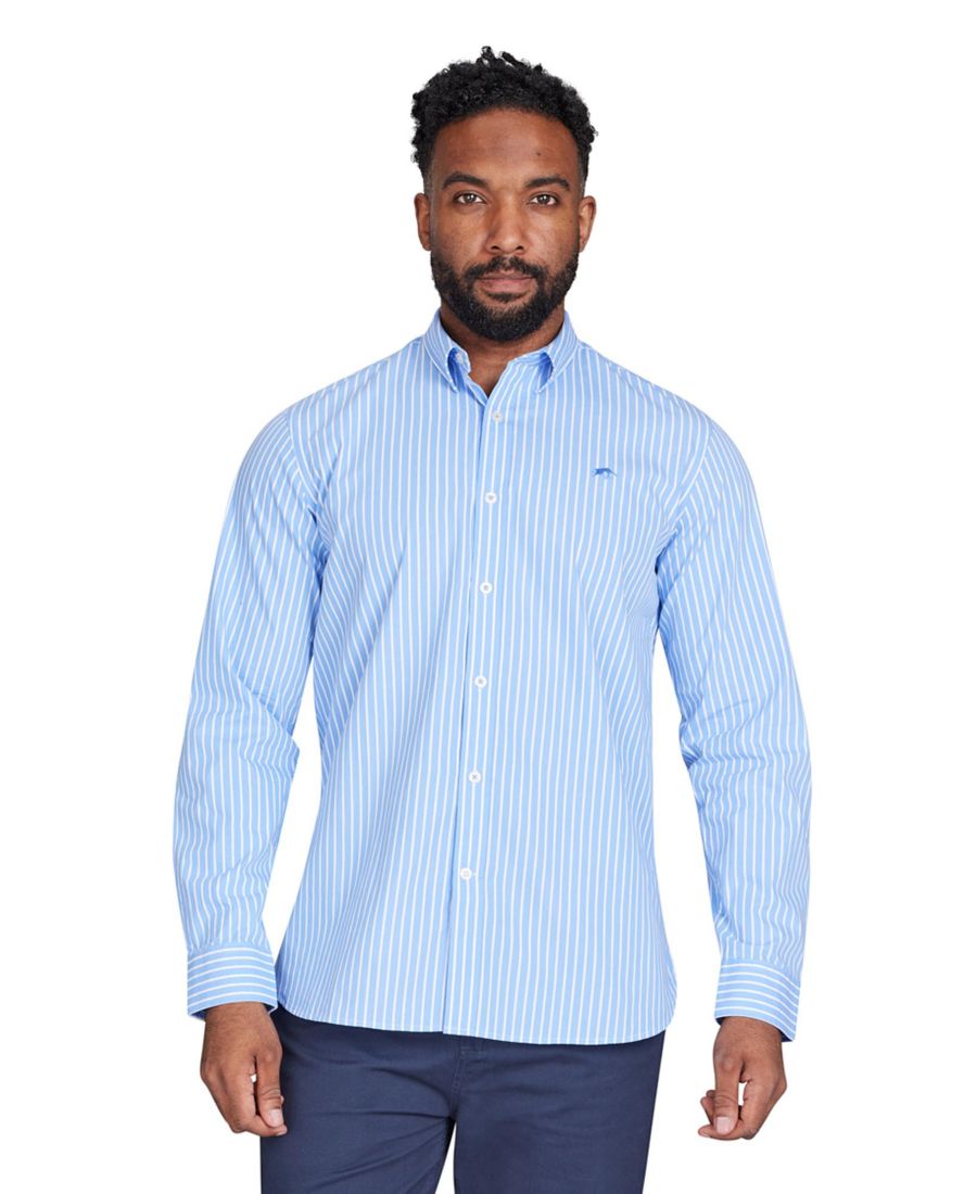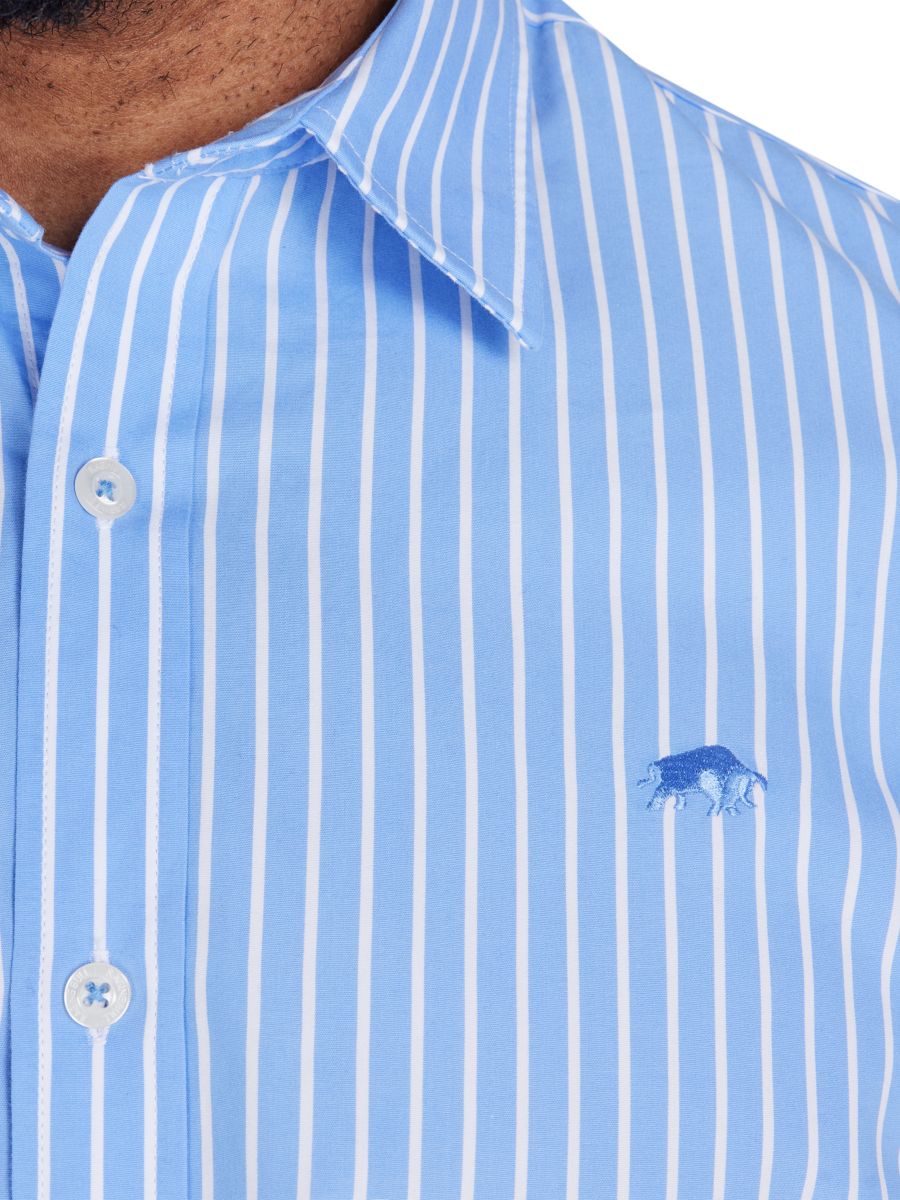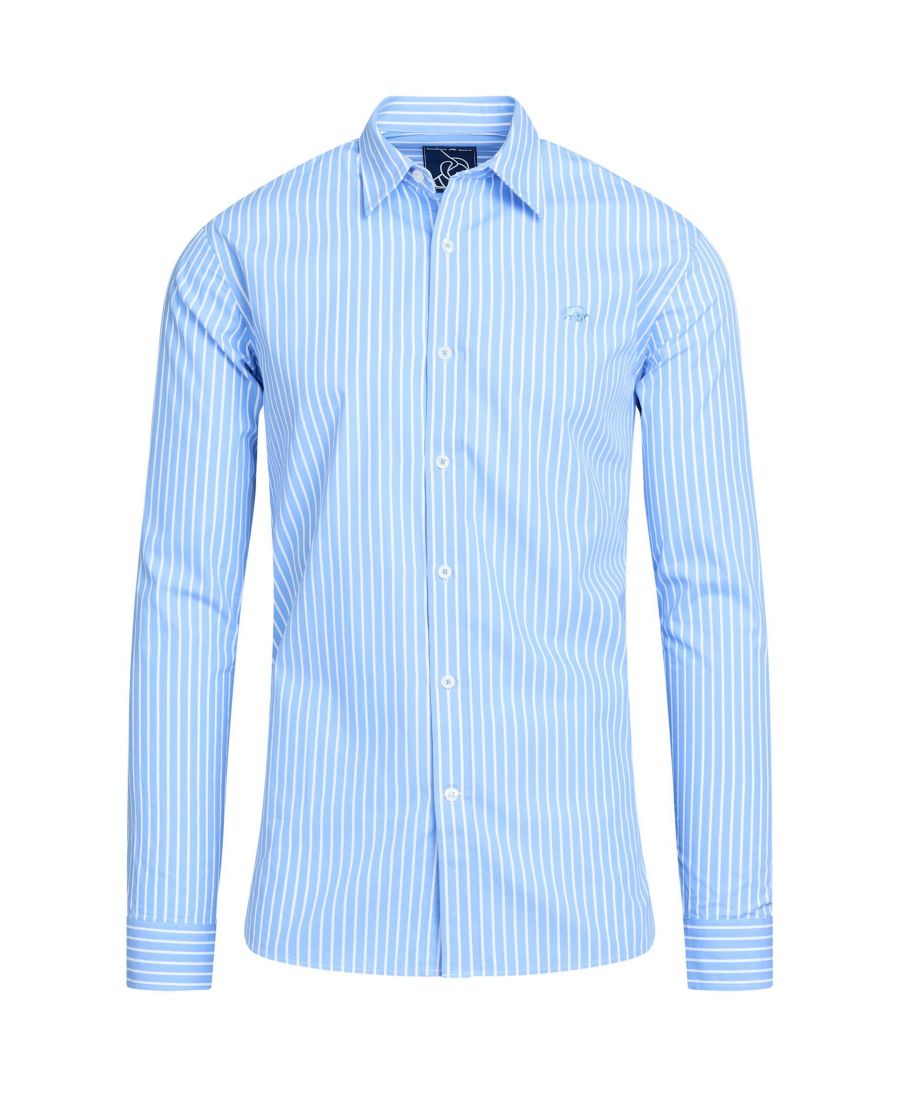 Эта классическая рубашка с длинными рукавами в полоску изготовлена из 100% хлопка и идеально подходит для офиса. Стильные вертикальные белые и светло-голубые полосы делают ее вневременным элементом гардероба. На левой стороне груди вышит фирменный логотип Raging Bull темно-синего цвета, а манжеты застегиваются на пуговицы. Качественная конструкция гарантирует долговечность. Доступна в широком ассортименте размеров, от маленьких до больших - до 6XL.