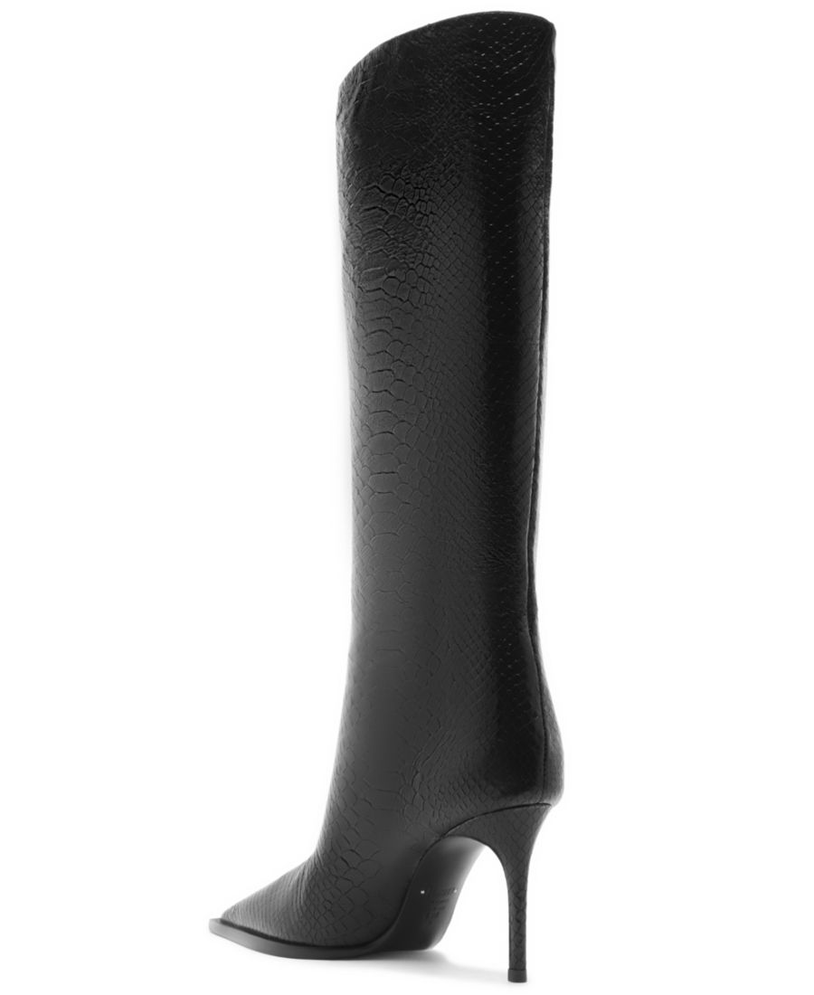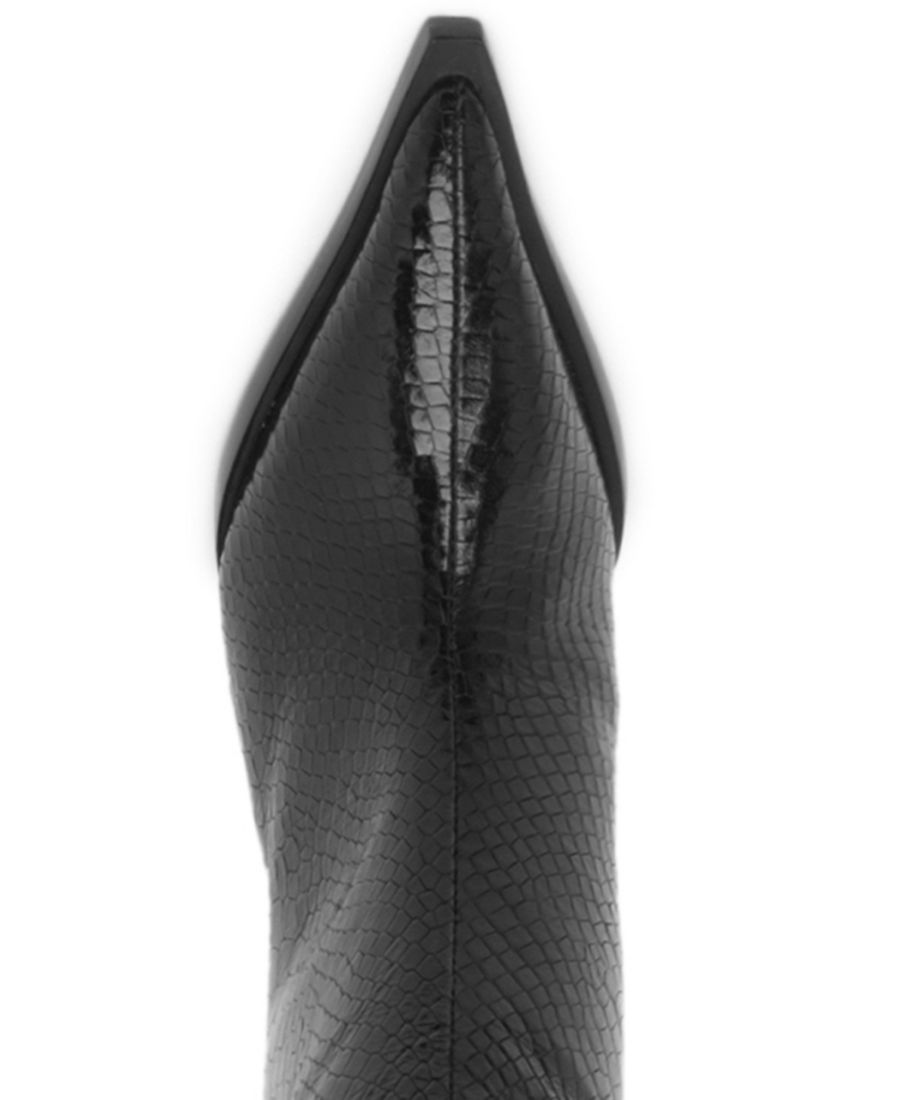 Эти высокие сапоги Мэри - воплощение силы, обтянутые змеиной кожей и подкрепленные острым и тонким шпильком. Острый носок добавляет им нужной доли дерзости. Изящные, соблазнительные и неотразимые - они созданы для тех, кто не следует правилам. Каждый шаг в них - это ощущение триумфа. Сочетайте их со структурированной мини-юбкой или объемной кожаной блузкой и произведите фурор.