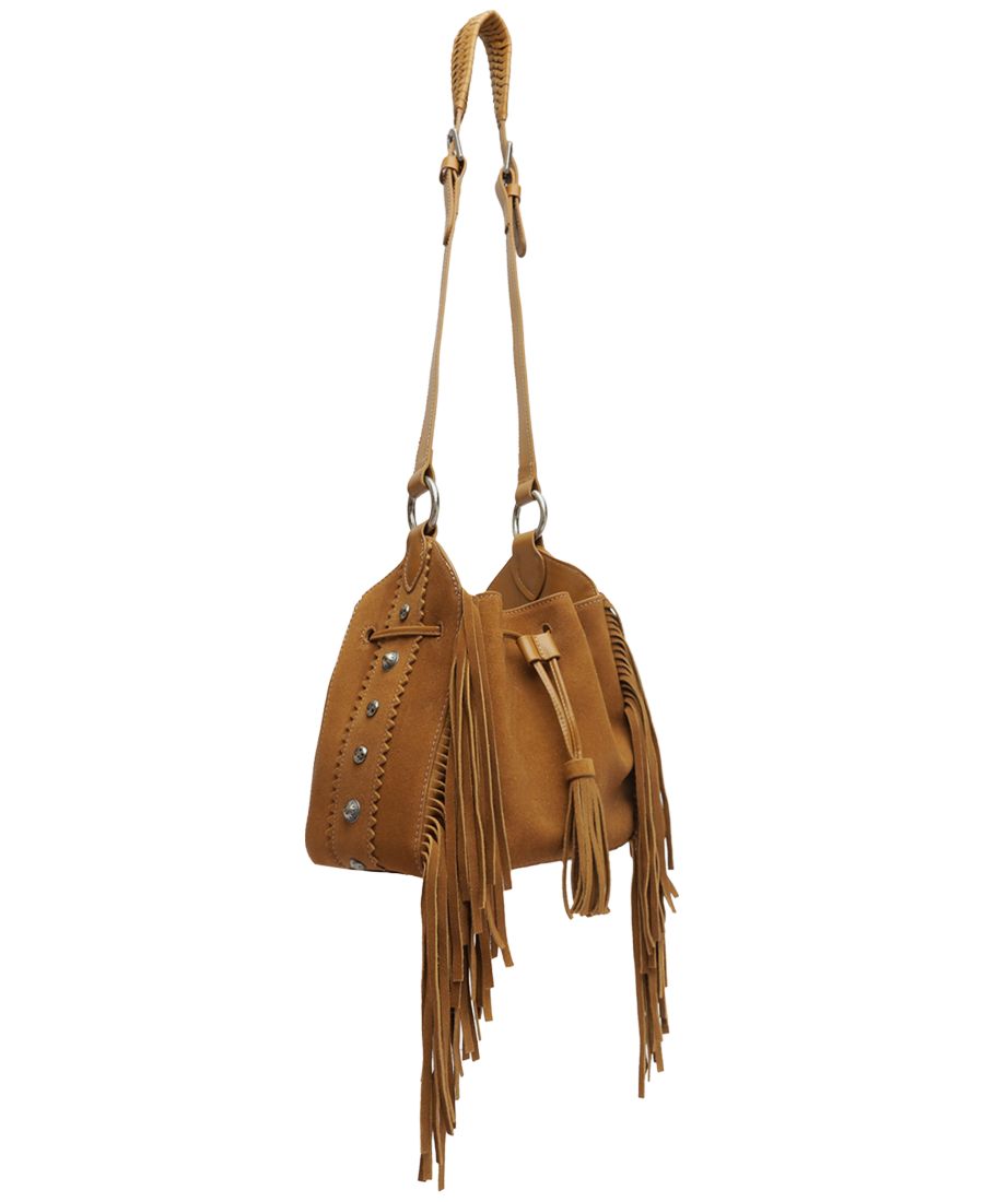 Подчеркните свой повседневный стиль с помощью этой маленькой сумки-ведра Arezzo Austin, выполненной из мягкой замши с фурнитурой золотистого цвета и игривой боковой бахромой. Сумка имеет магнитную застежку и шнурок с бахромой, а также внутренний накладной карман и плечевой ремень для удобства ношения без помощи рук. Размер подходит для всех моделей iPhone, это идеальное сочетание богемного стиля и функциональности.