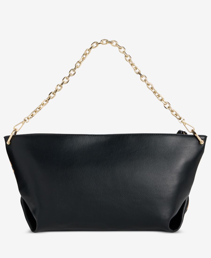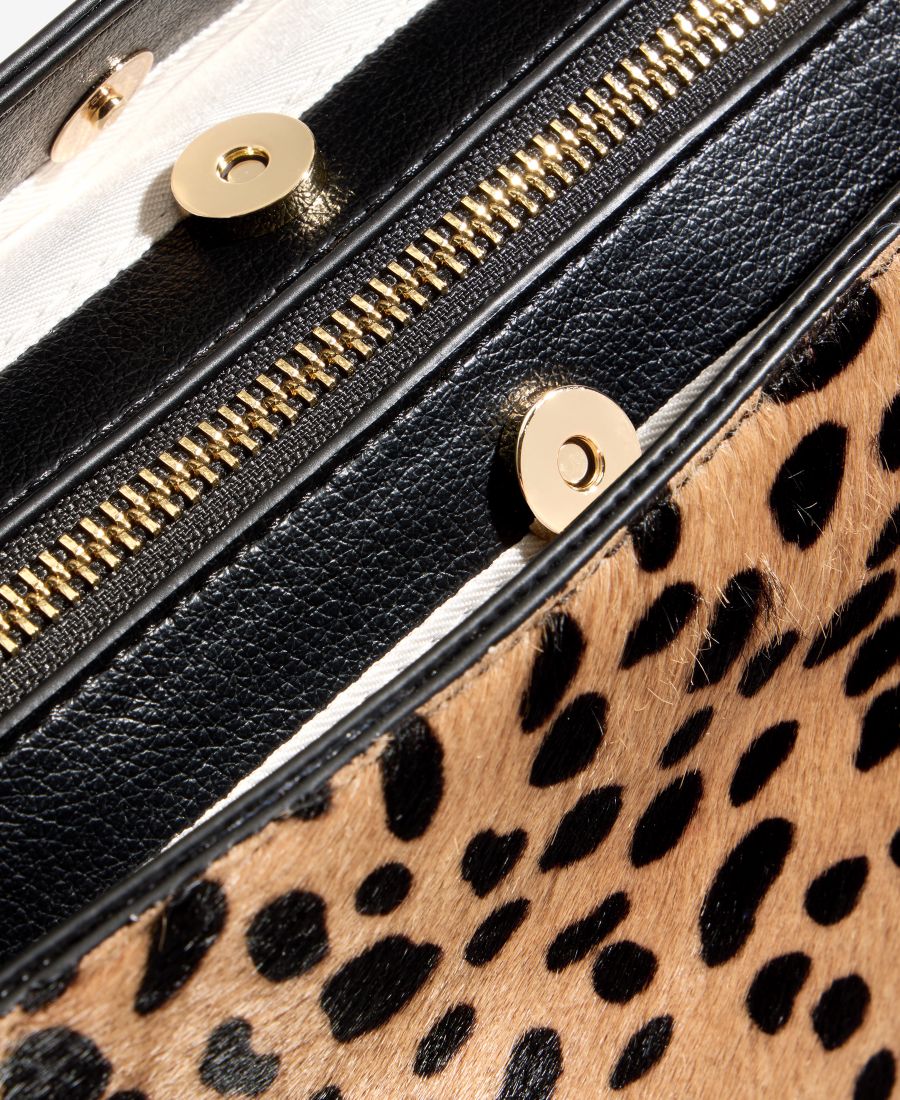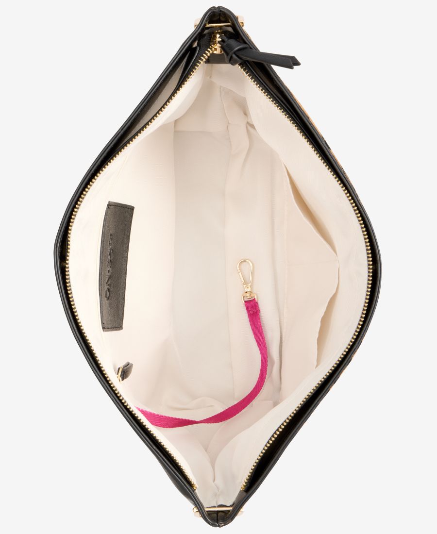 Внешняя фурнитура золотистого цвета; внутренний карман на молнии и держатель для телефона