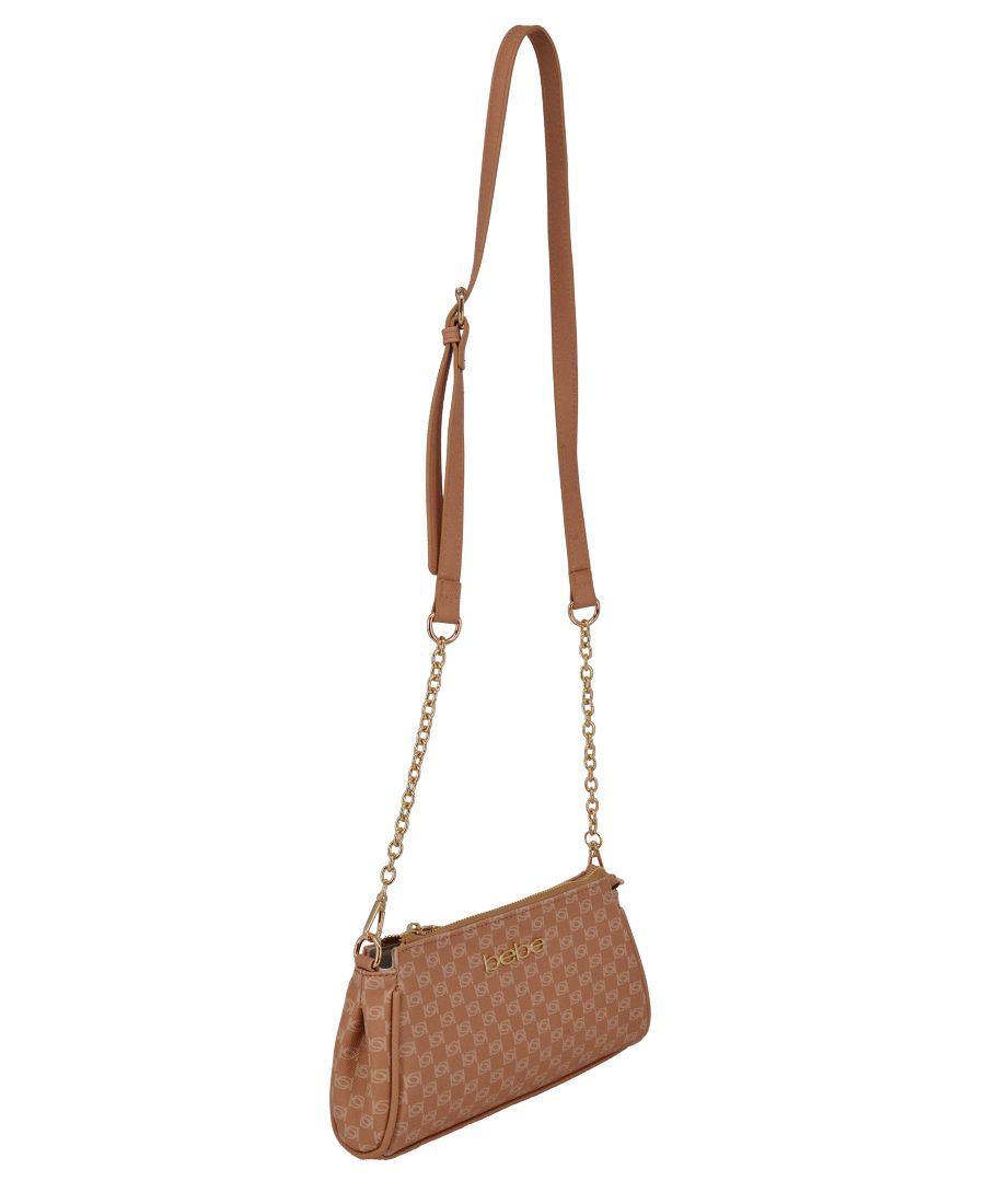 Сумка Adela Monogram Baguette Crossbody украшена фирменным мини-логотипом Bebe, имеет забавный брелок и регулируемый ремешок для универсального ношения. Ее элегантный дизайн позволяет вместить телефон и все необходимые вещи. Идеально подходит для бранча с друзьями или вечернего выхода в свет.