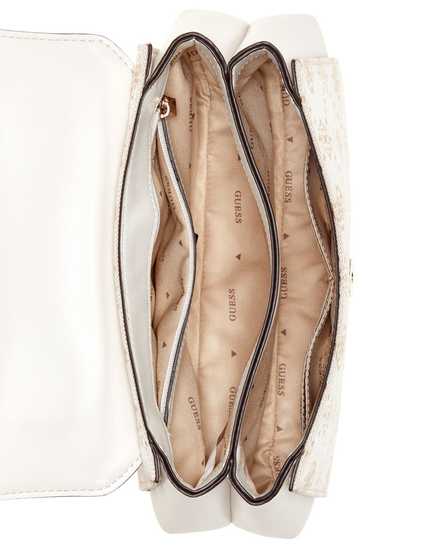 Эта элегантная сумка GUESS с откидной крышкой и верхней ручкой выполнена из фирменного жаккарда с гладкой отделкой. Магнитная застежка и съемный плечевой ремень сочетают в себе стиль и универсальную функциональность.