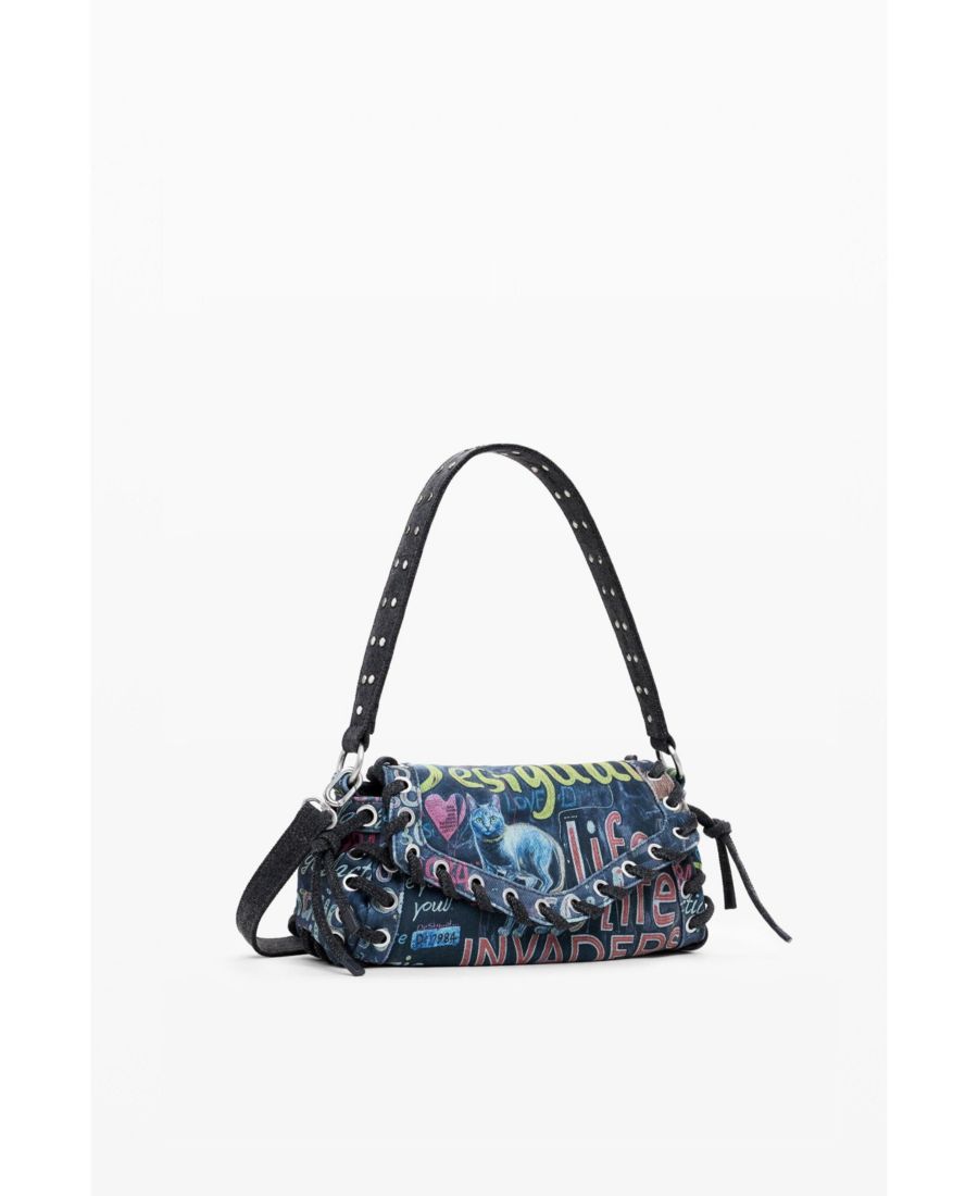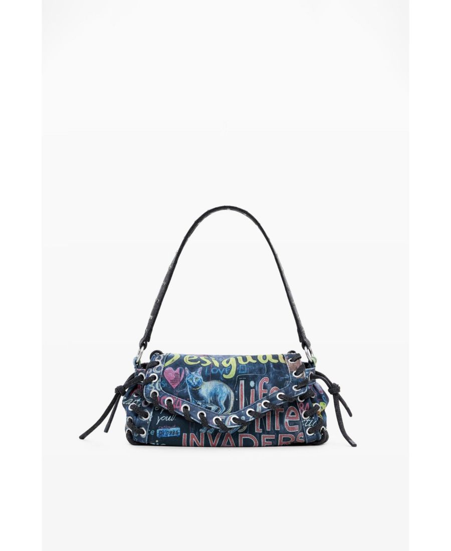 Удлиненная сумка через плечо из ткани, имитирующей джинсовую, с принтом в стиле граффити, сменными ручками и плетеной отделкой.