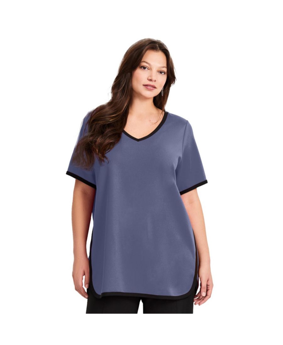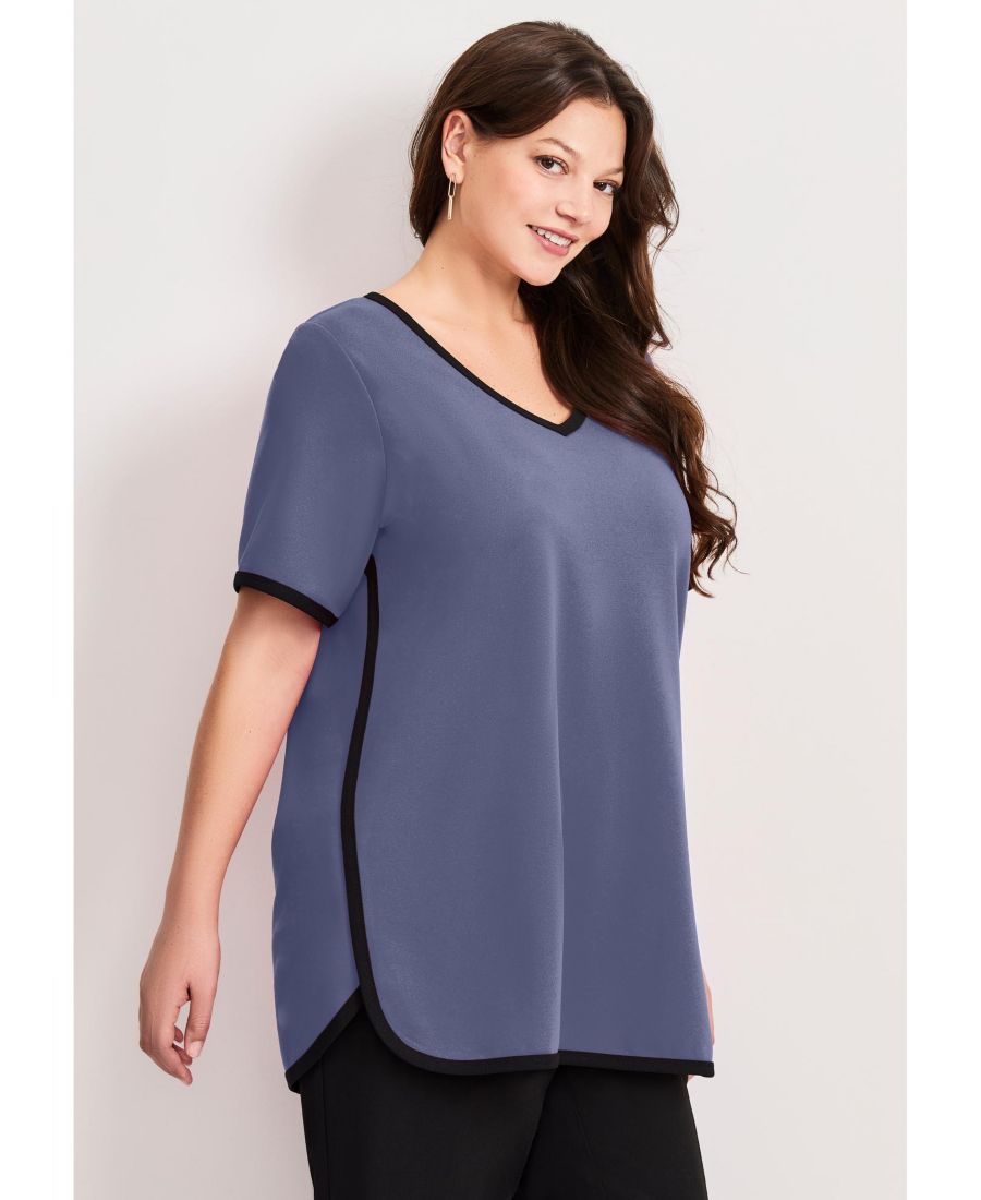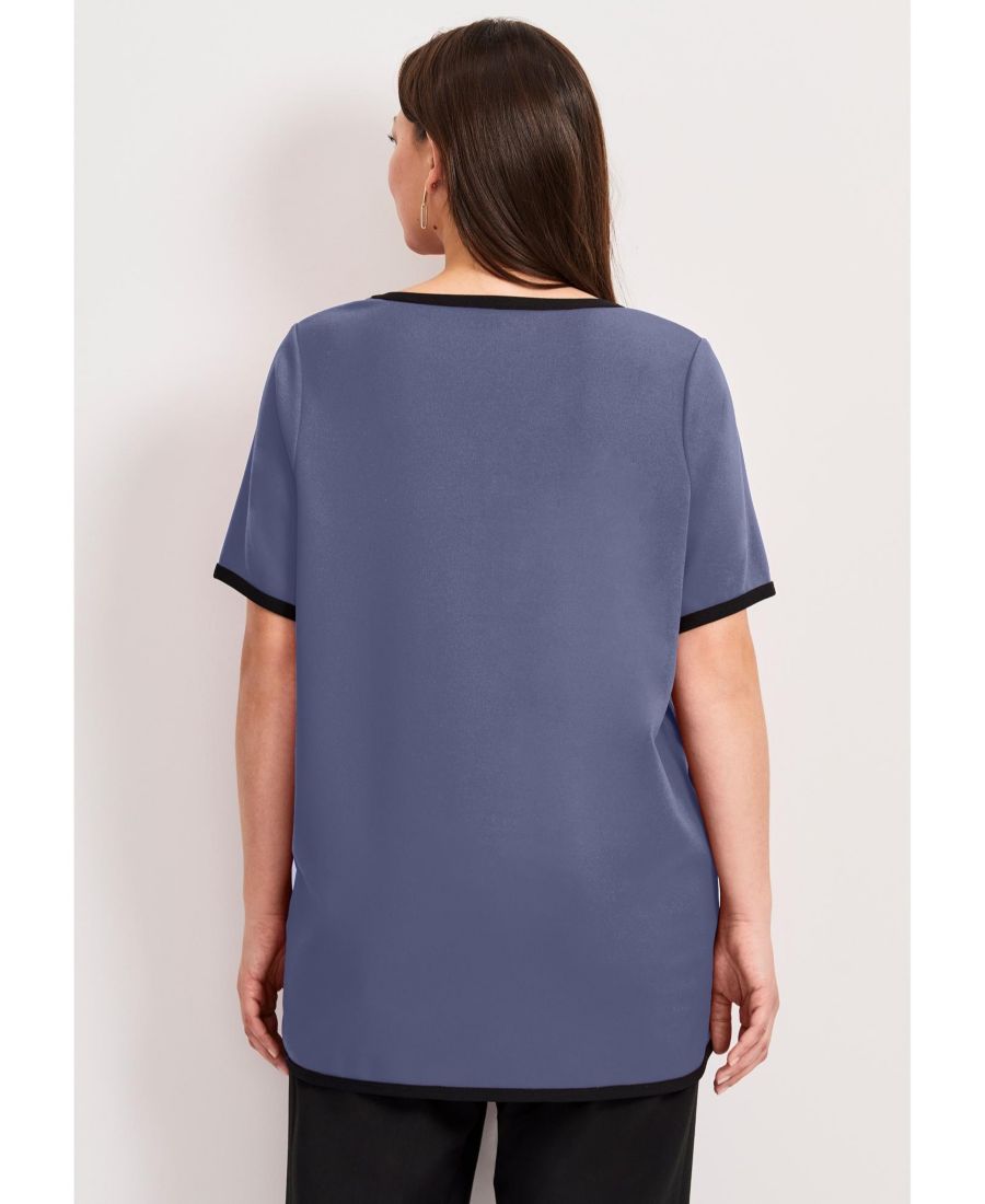 Этот топ свободного кроя с черной контрастной отделкой по вырезу горловины, рукавам и низу выглядит элегантно. V-образный вырез и короткие рукава подчеркивают классический, но в то же время удобный дизайн. Благодаря закругленному низу и легкой ткани, этот топ идеально подходит для сочетания с брюками или джинсами, создавая универсальный повседневный образ. ТКАНЬ: Трикотажный креп с легкой текстурой и мягкой на ощупь поверхностью. ПОСАДКА: Свободный крой. Короткие рукава. Закругленный нижний край. УХОД: Машинная стирка. Основные характеристики: ТРИКОТАЖНЫЙ КРЕП 97% ПОЛИЭСТЕР 3% ЭЛАСТАН. Длина: 63 см. Размеры для полных женщин 14-36. Avenue. Импортный товар.