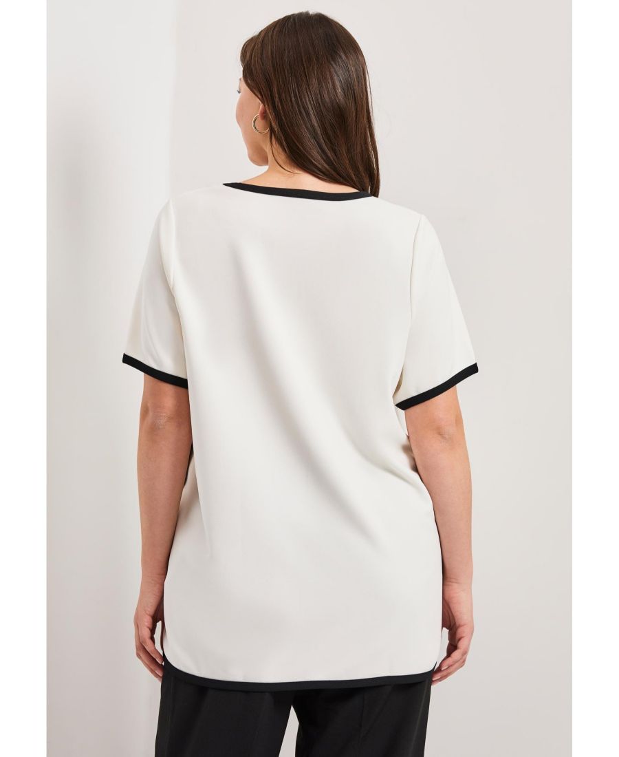 Этот топ свободного кроя с черной контрастной отделкой по вырезу горловины, рукавам и низу выглядит элегантно. V-образный вырез и короткие рукава подчеркивают классический, но в то же время удобный дизайн. Благодаря закругленному низу и легкой ткани, этот топ идеально подходит для сочетания с брюками или джинсами, создавая универсальный повседневный образ. ТКАНЬ: Трикотажный креп с легкой текстурой и мягкой на ощупь поверхностью. ПОСАДКА: Свободный крой. Короткие рукава. Закругленный нижний край. УХОД: Машинная стирка. Основные характеристики: ТРИКОТАЖНЫЙ КРЕП 97% ПОЛИЭСТЕР 3% ЭЛАСТАН. Длина: 63 см. Размеры для полных женщин 14-36. Avenue. Импортный товар.