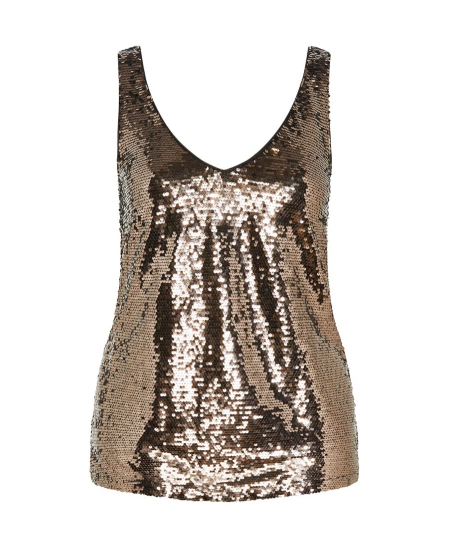 Свободный крой майки, надевается через голову, полностью на подкладке, ткань с пайетками по всей поверхности, эластичная, длина до бедра, сочетайте с кожаными брюками и туфлями на шпильках для вечера в городе.