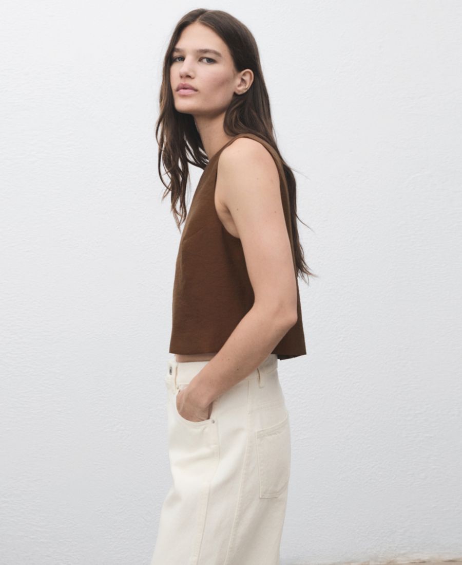 Современный по пропорциям, укороченный топ на пуговицах от Mango отличается универсальностью. Изготовленный из тканого материала, он имеет укороченный прямой крой, круглый вырез горловины, широкие бретели и застежку на пуговицы сзади.