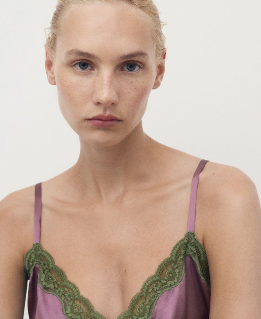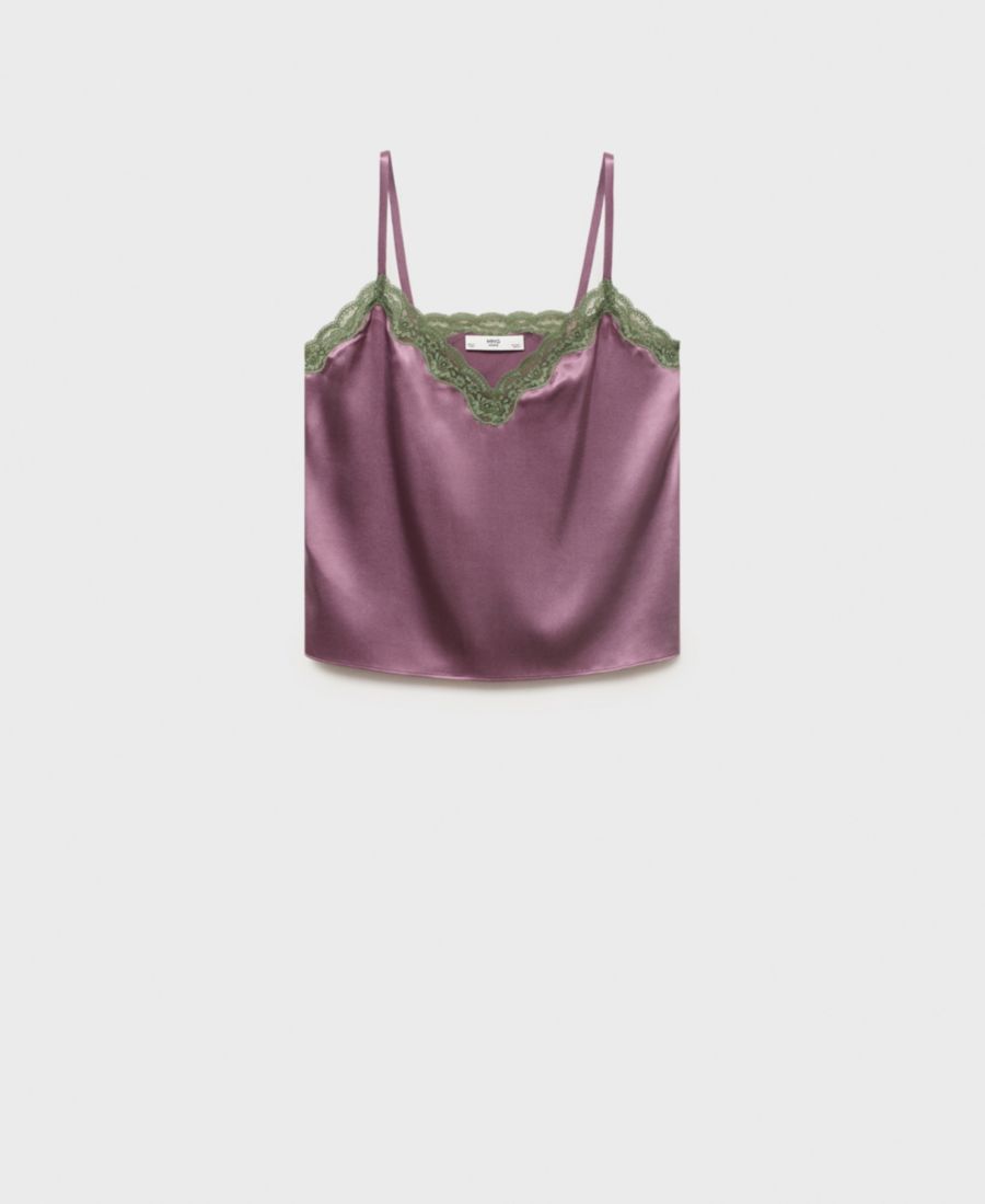 Женский шелковый топ с контрастным кружевом MANGO, Plum