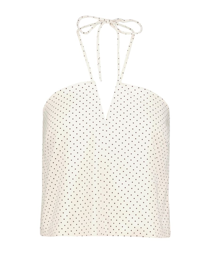 Топ с V-образным вырезом в горошек, с завязками на шее и регулируемым поясом.