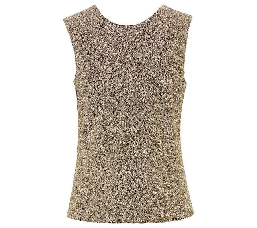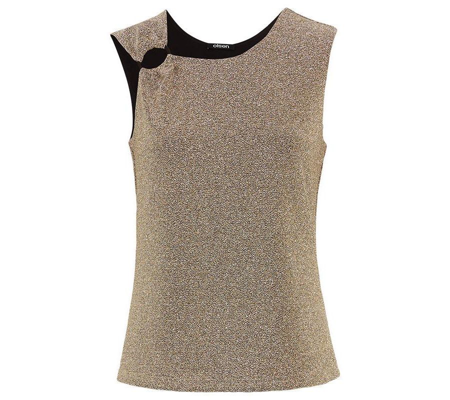 Эта блузка без рукавов, выполненная из эластичной ткани с мерцающими металлическими оттенками, призвана привлекать внимание.