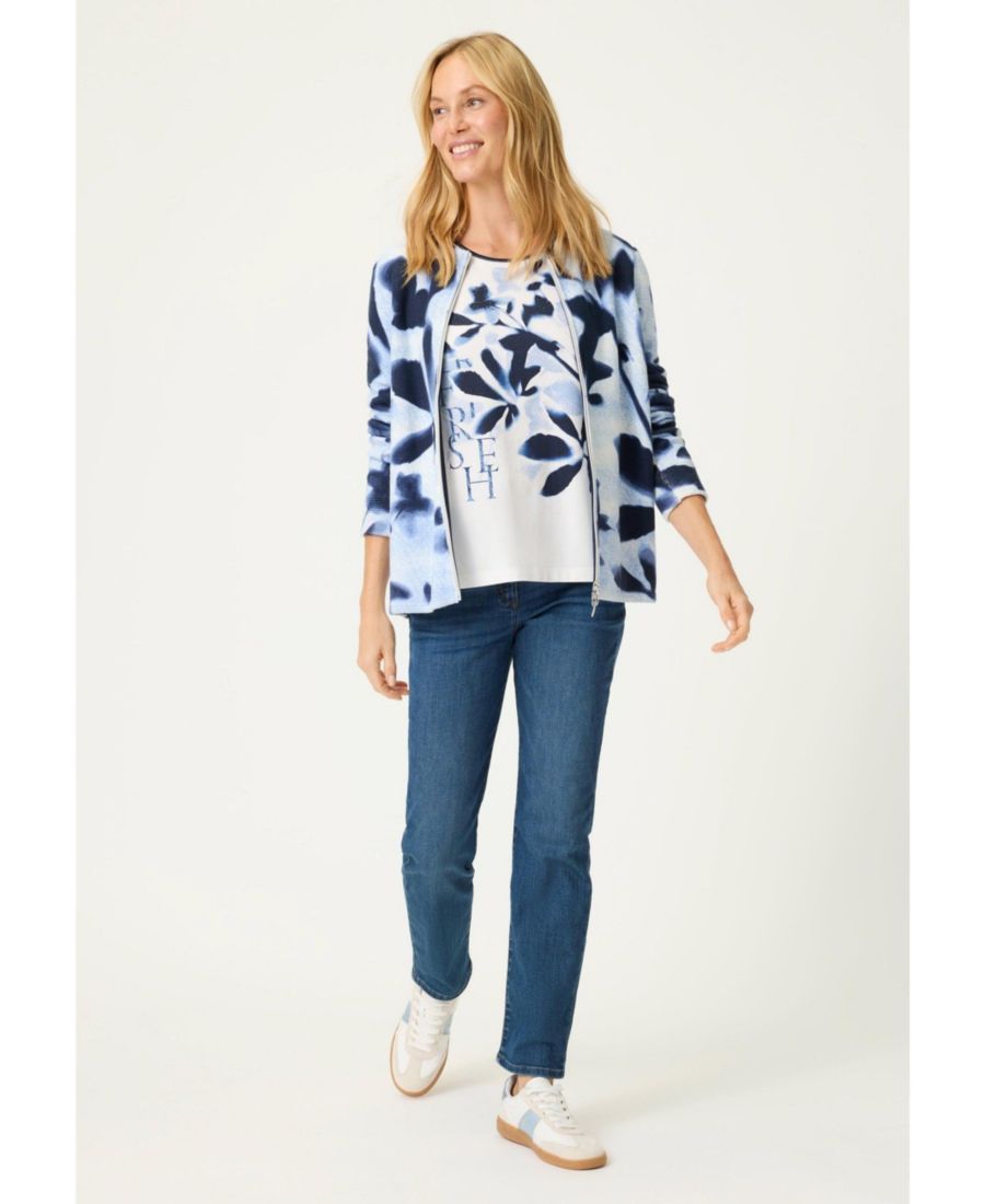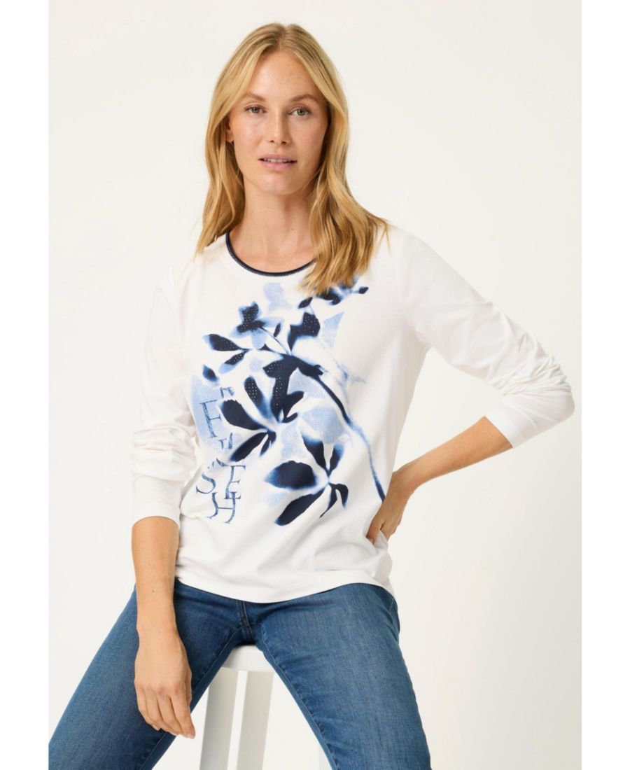 Прозрачные стразы подчеркивают цветочный принт, словно нежные капельки росы, что делает его идеальным дополнением к джинсам или классическим брюкам.