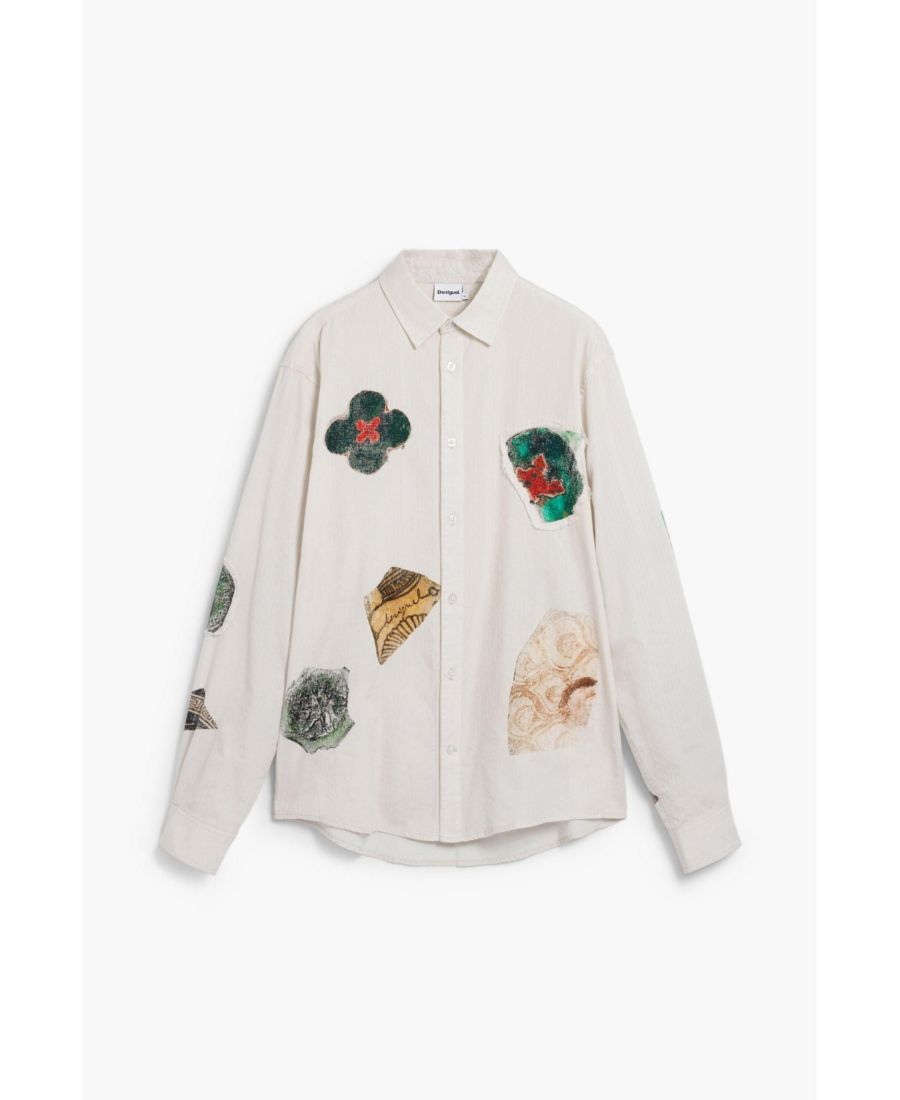 Рубашка стандартного кроя с мозаичными вышитыми деталями, выполненными в технике пэчворк.