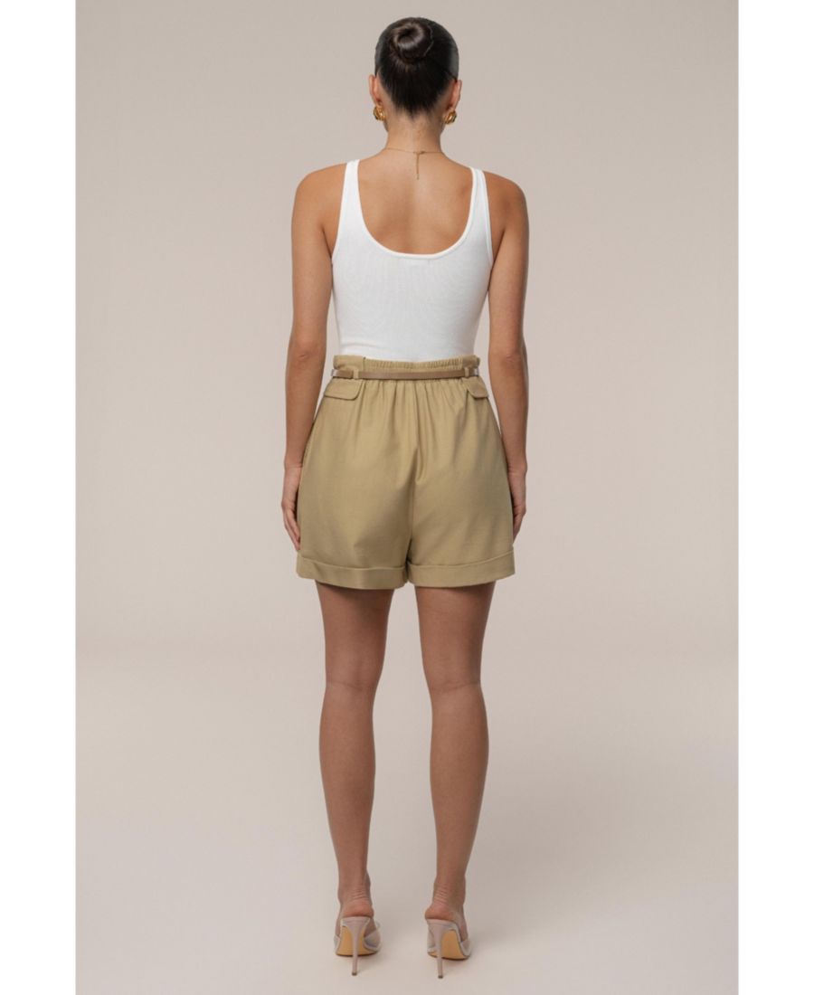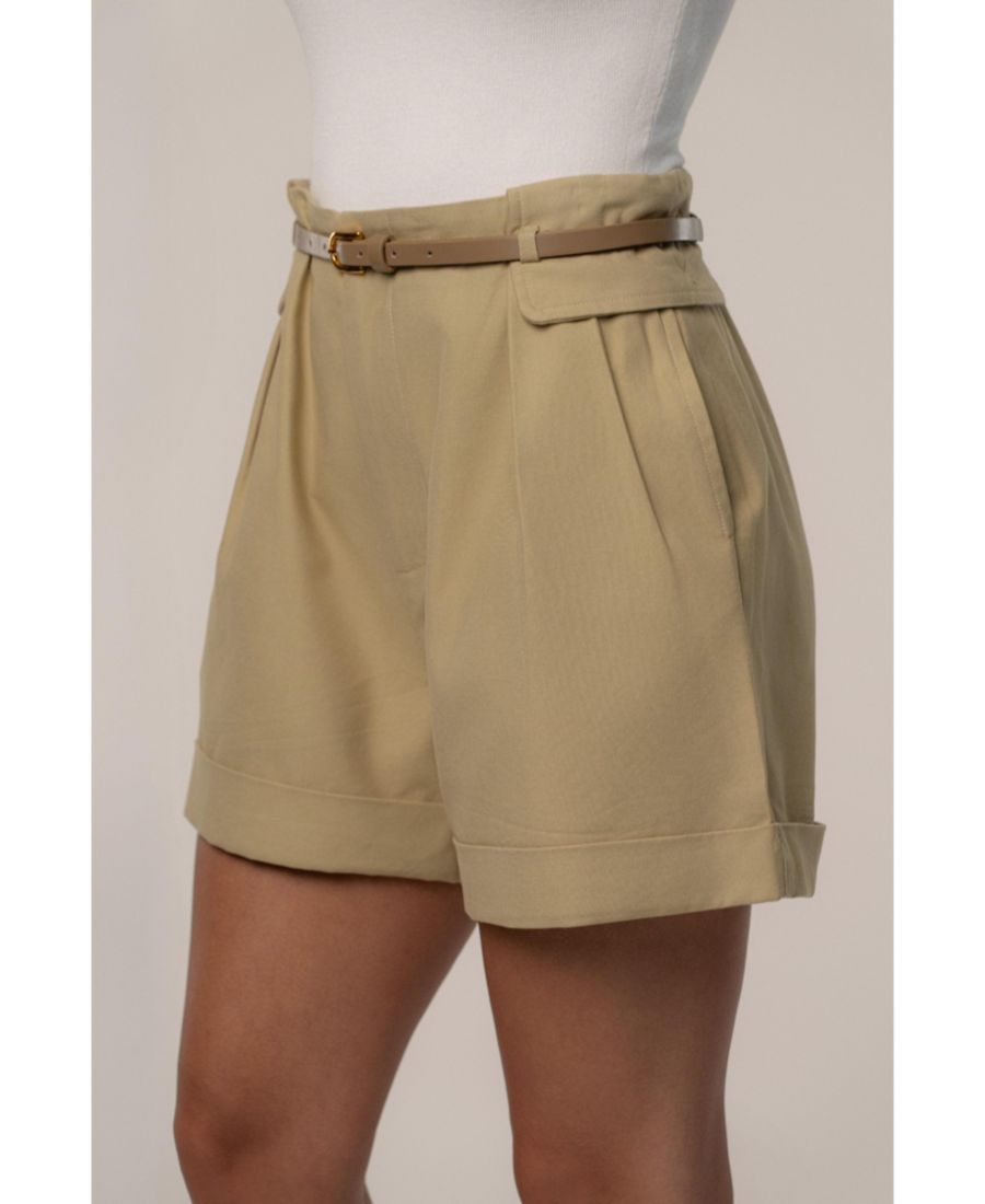 Сохраняйте безупречный стиль с нашими шортами-карго с поясом, созданными для изысканного и универсального образа. Эти шорты с высокой талией, функциональными боковыми карманами, аккуратной складкой и подвернутыми краями сочетают в себе структуру и стиль. Тонкий пояс с золотистой пряжкой добавляет элегантности, а гладкая ткань и эластичный пояс сзади обеспечивают комфорт в течение всего дня. Одинарная подкладка. Минимальная эластичность.