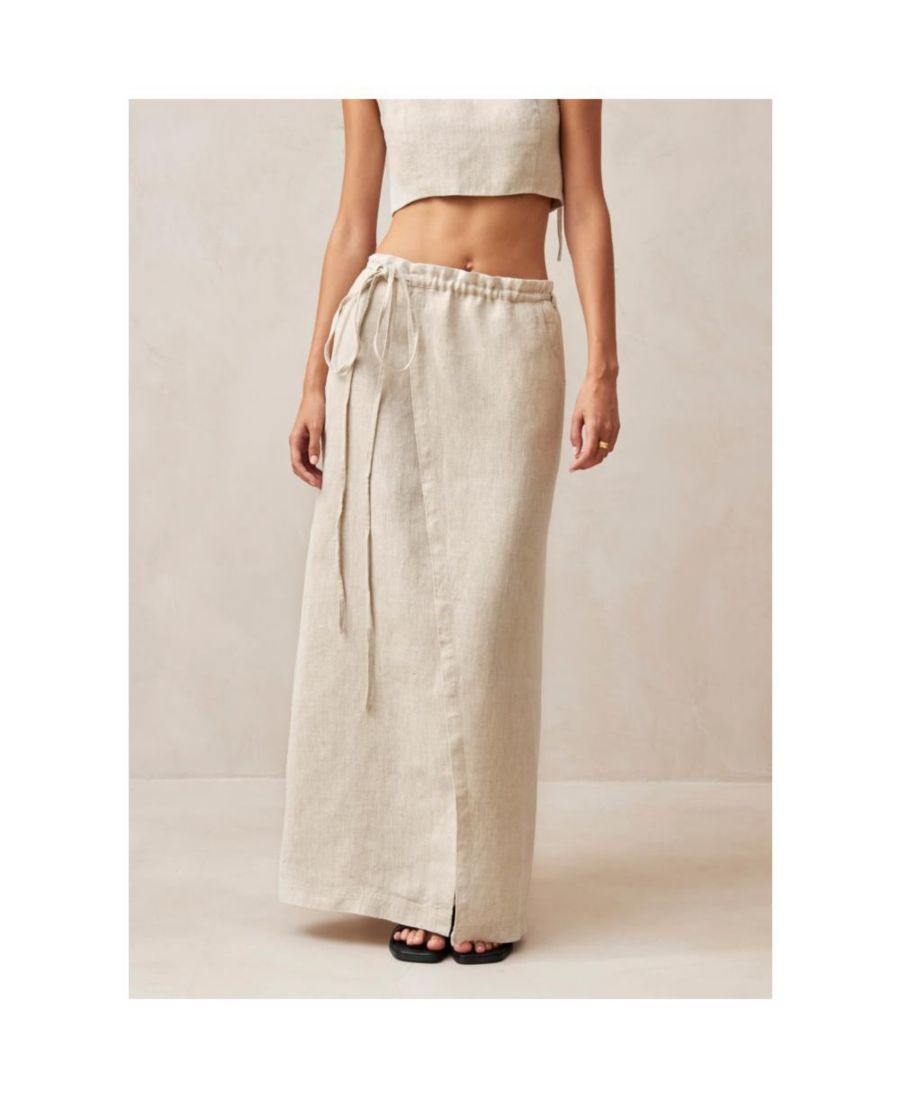 Юбка Maika сшита из льна и имеет силуэт макси. С запахом спереди, она завязывается тонкой лямкой, продетой через петли для ремня, и скрывает функциональные внутренние карманы по бокам.