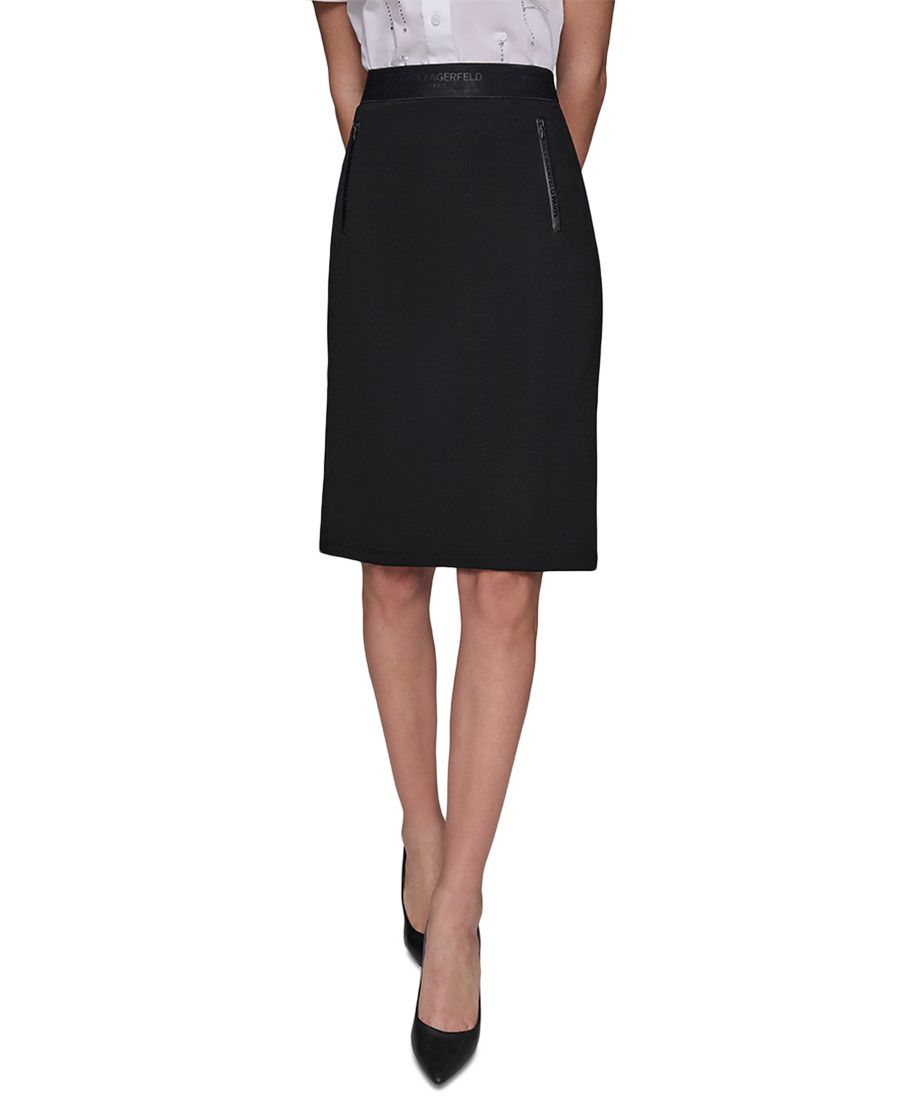 Элегантная юбка без застежек. Эта прямая юбка от KARL LAGERFELD PARIS отличается фирменным поясом и передними карманами на молнии.