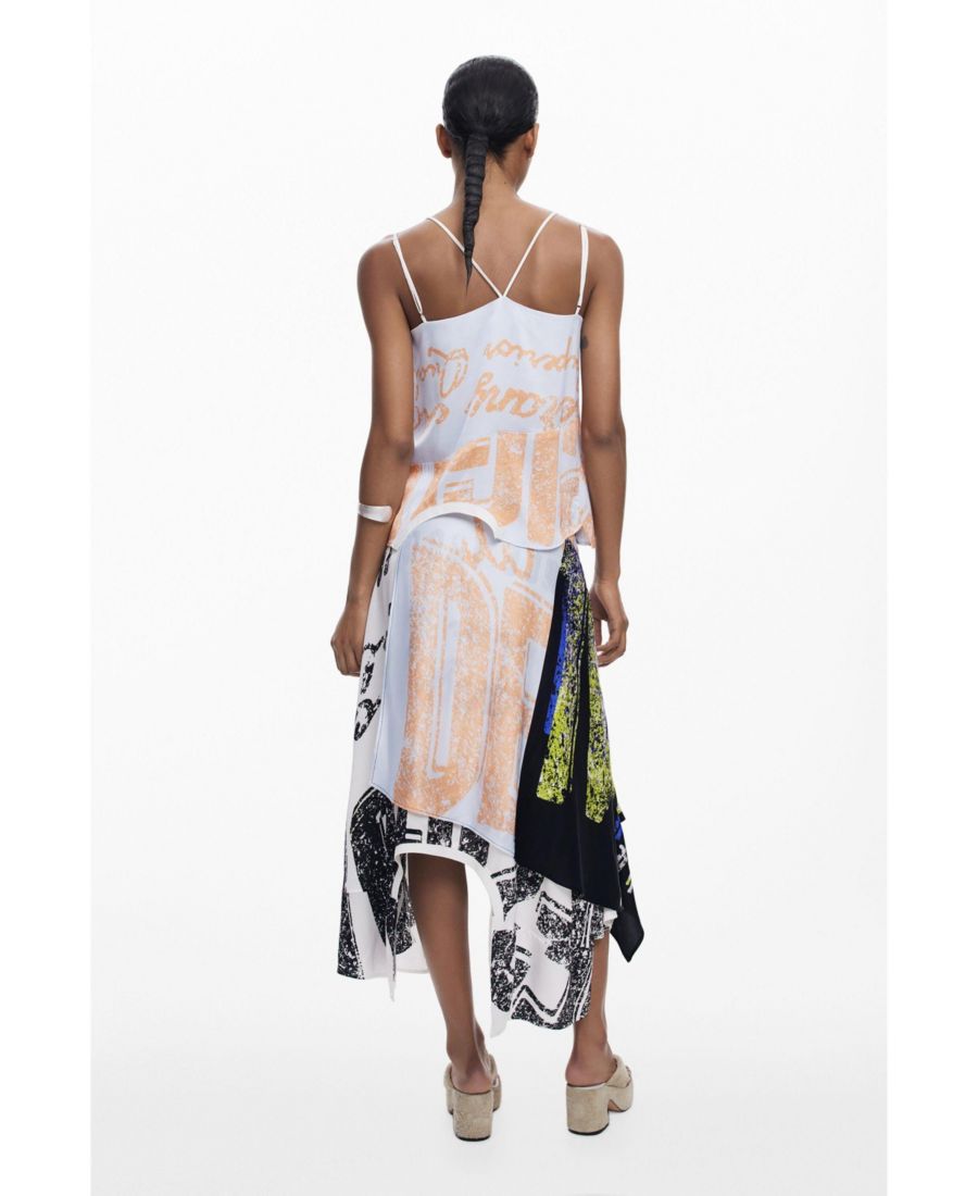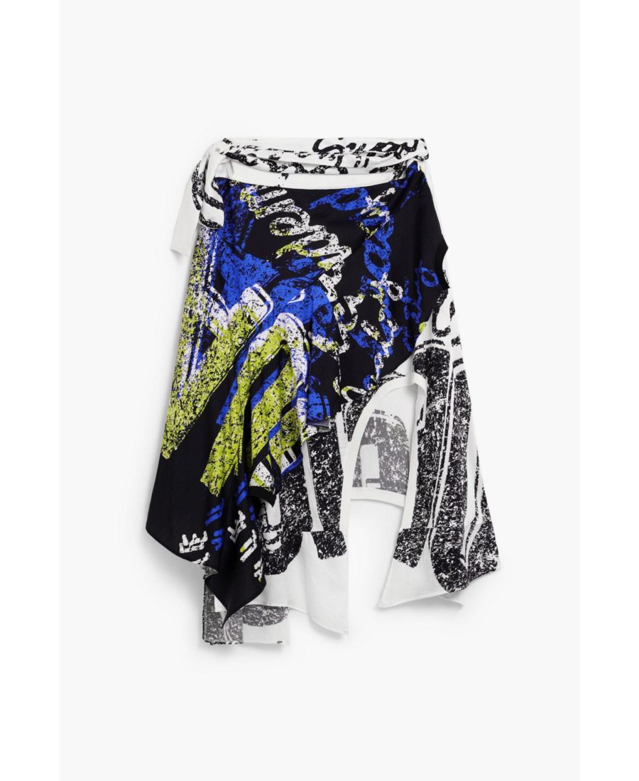 Юбка асимметричного дизайна разной длины, сочетающая в себе принт в виде надписей и спортивный стиль.