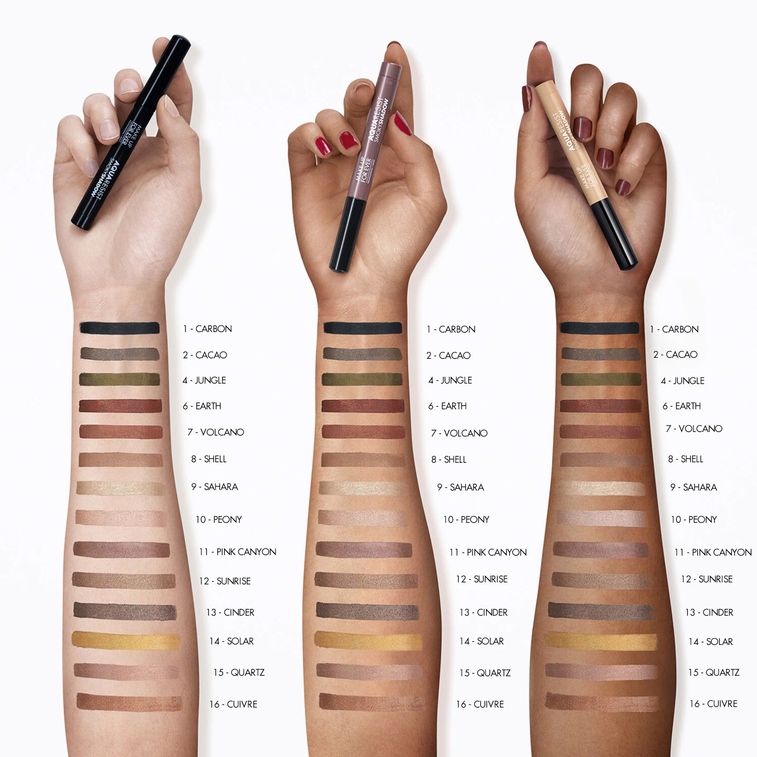 Первый карандаш для глаз 3-в-1: подводка, карандаш для глаз и тени от MAKE UP FOR EVER! Этот водостойкий карандаш обеспечивает стойкость до 24 часов. Идеально подходит для чувствительных глаз, имеет мягкую и шелковистую текстуру, которая тает на коже, создавая ощущение, будто вы ничего не нанесли, и идеально скользит. Для безупречного нанесения одним движением. С AQUA RESIST вы можете жить полной жизнью и излучать свою энергию окружающим. Раскройте эту стойкую силу, которая поможет вам превзойти ваши цели и воспользоваться всеми возможностями, которые предлагает жизнь. (1) Стойкость подтверждена инструментальными измерениями на 20 испытуемых. Веганский продукт: изготовлен из натуральных ингредиентов. Код продукта: 514495