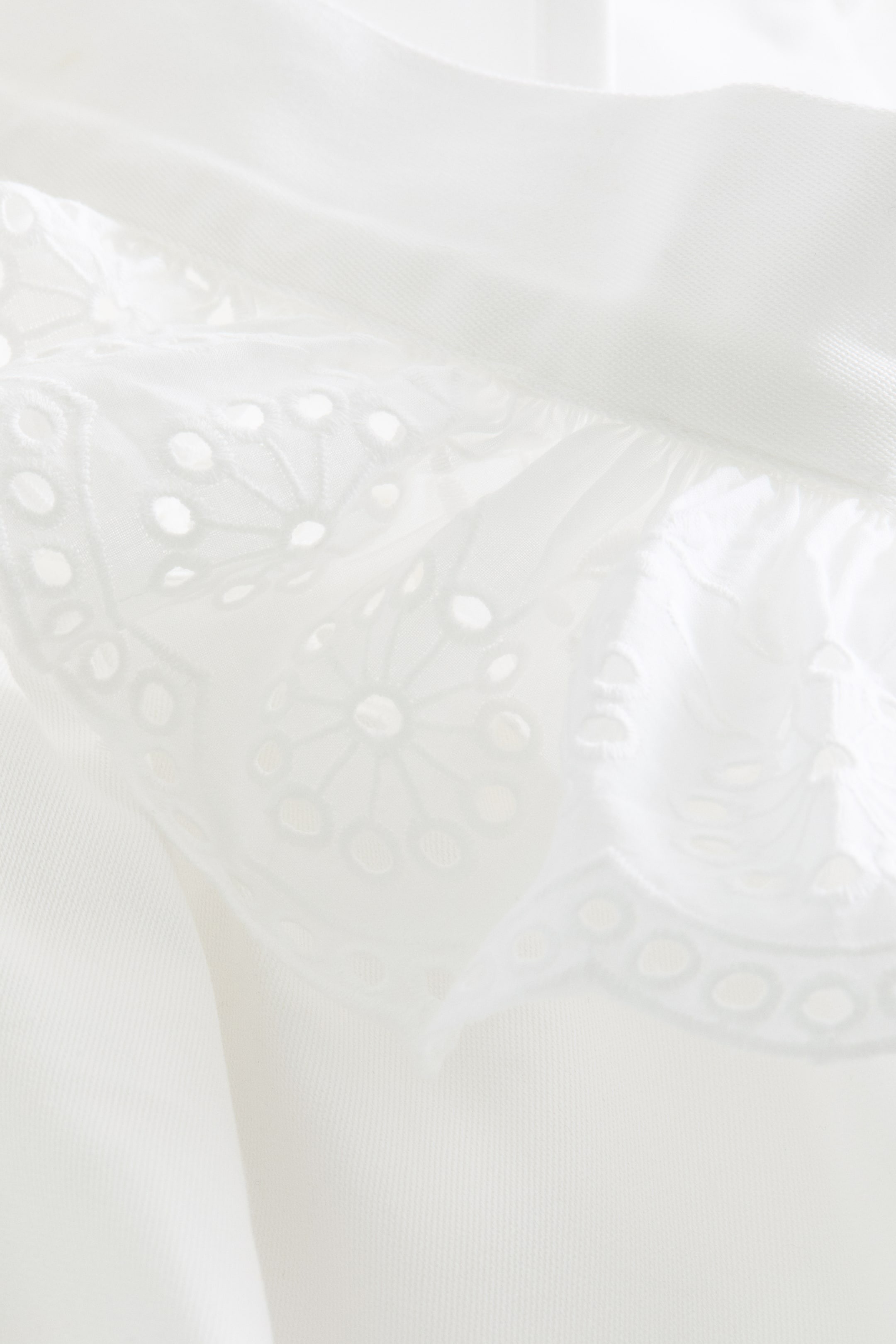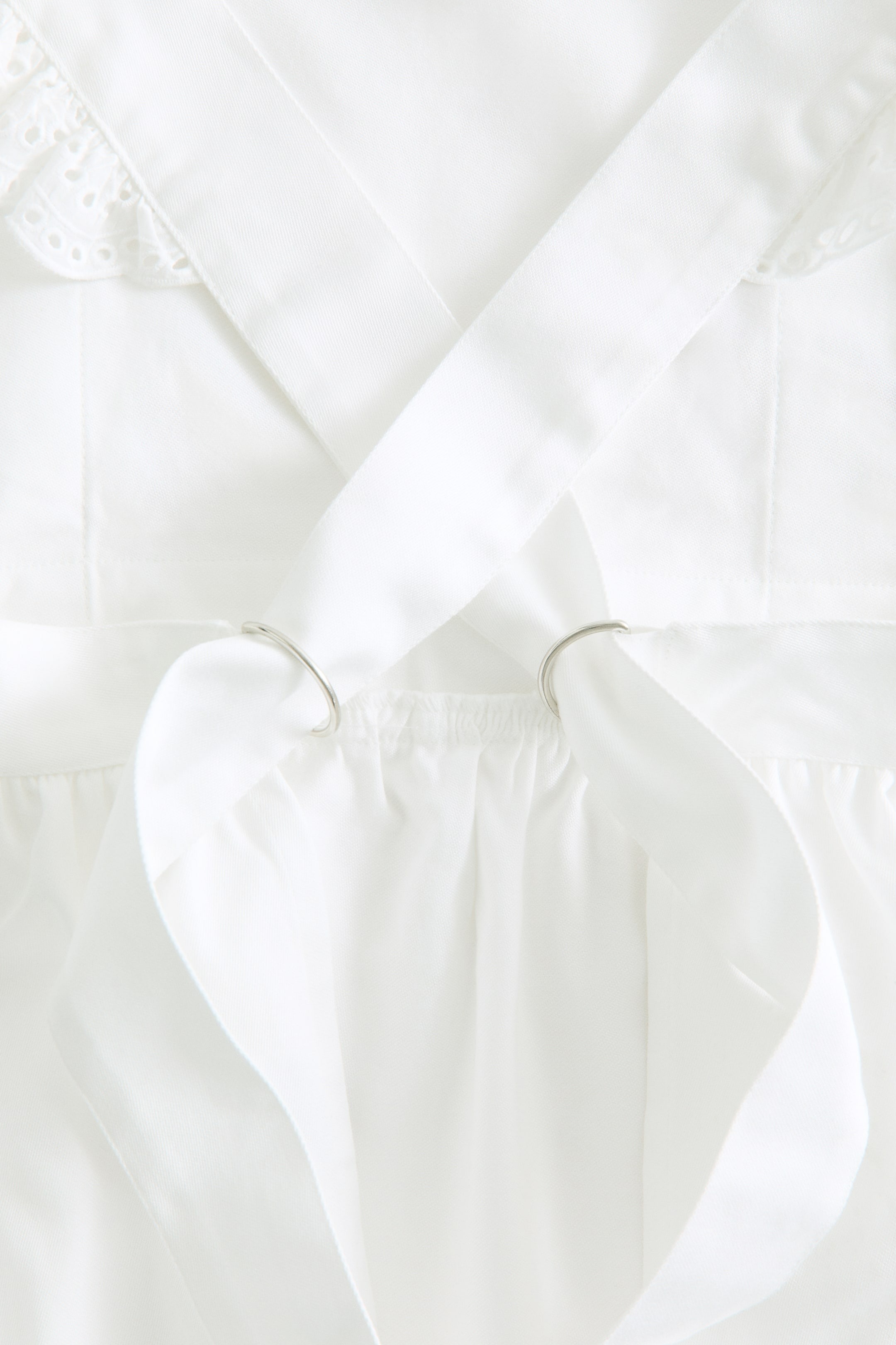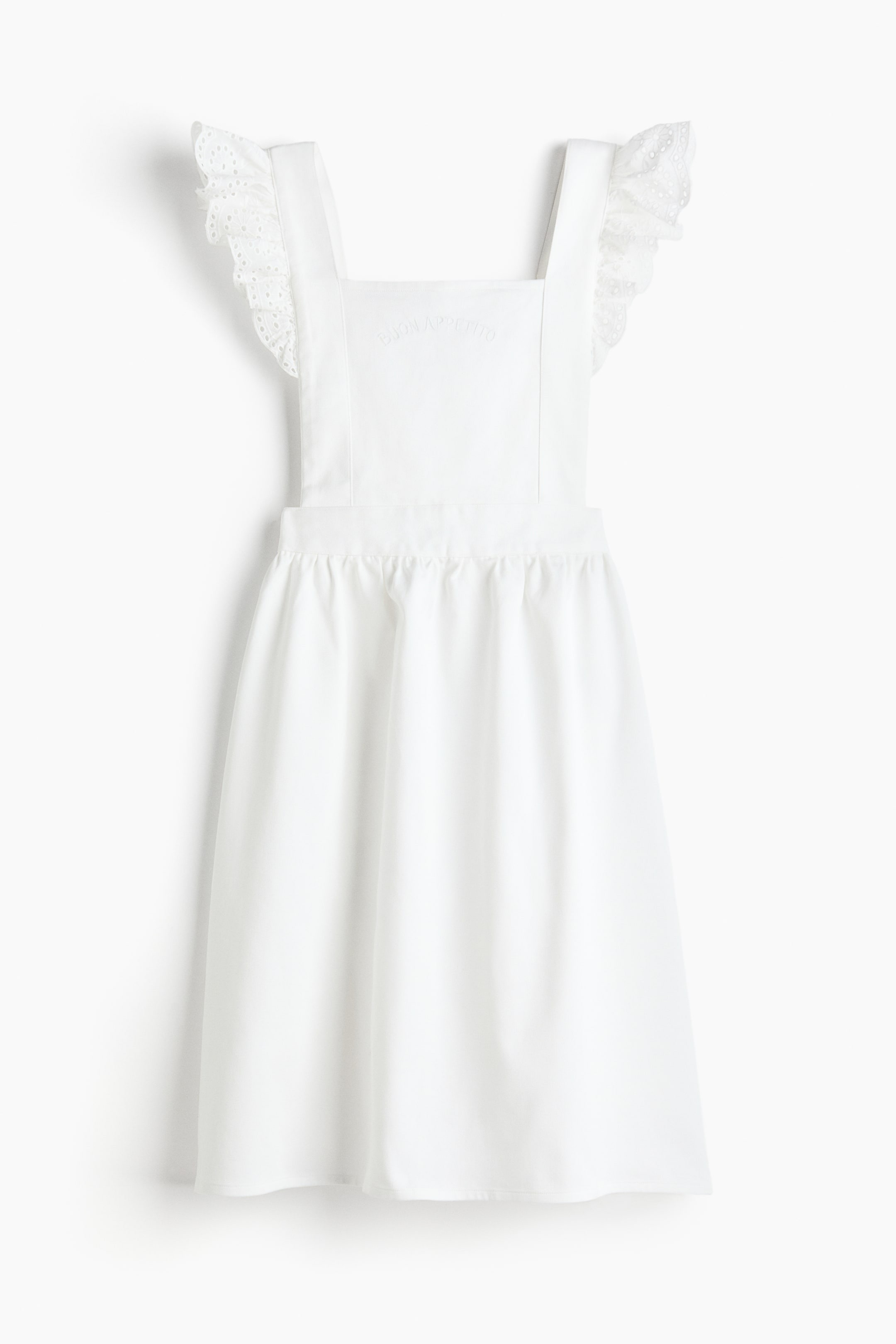 Хлопковый фартук. Лямки перекрещиваются сзади и завязываются на талии. Лямки украшены оборками с вышивкой бродери англез, вышитой надписью спереди и присборенным поясом.