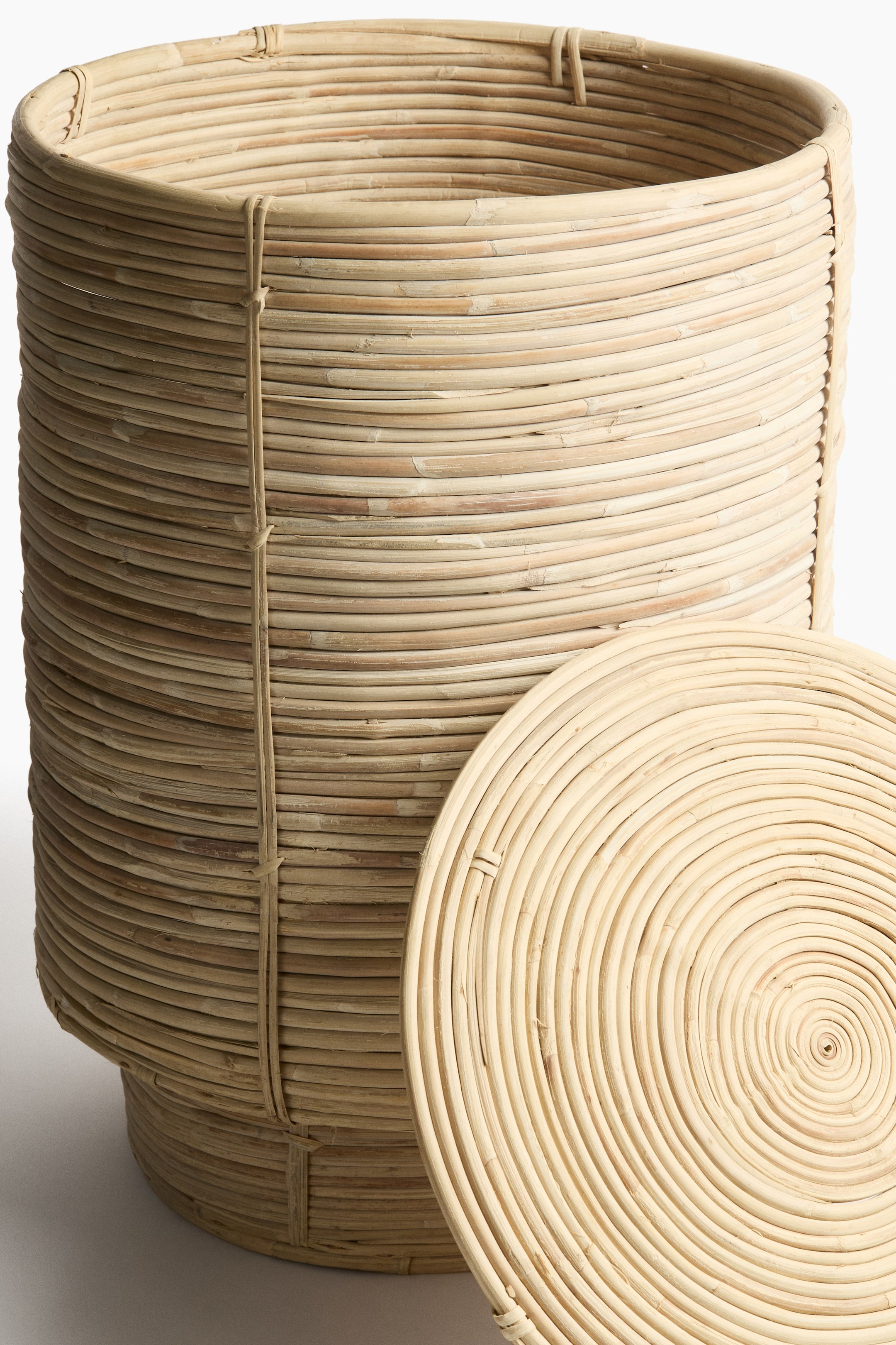 Плетеная корзина для белья с крышкой и низким основанием.