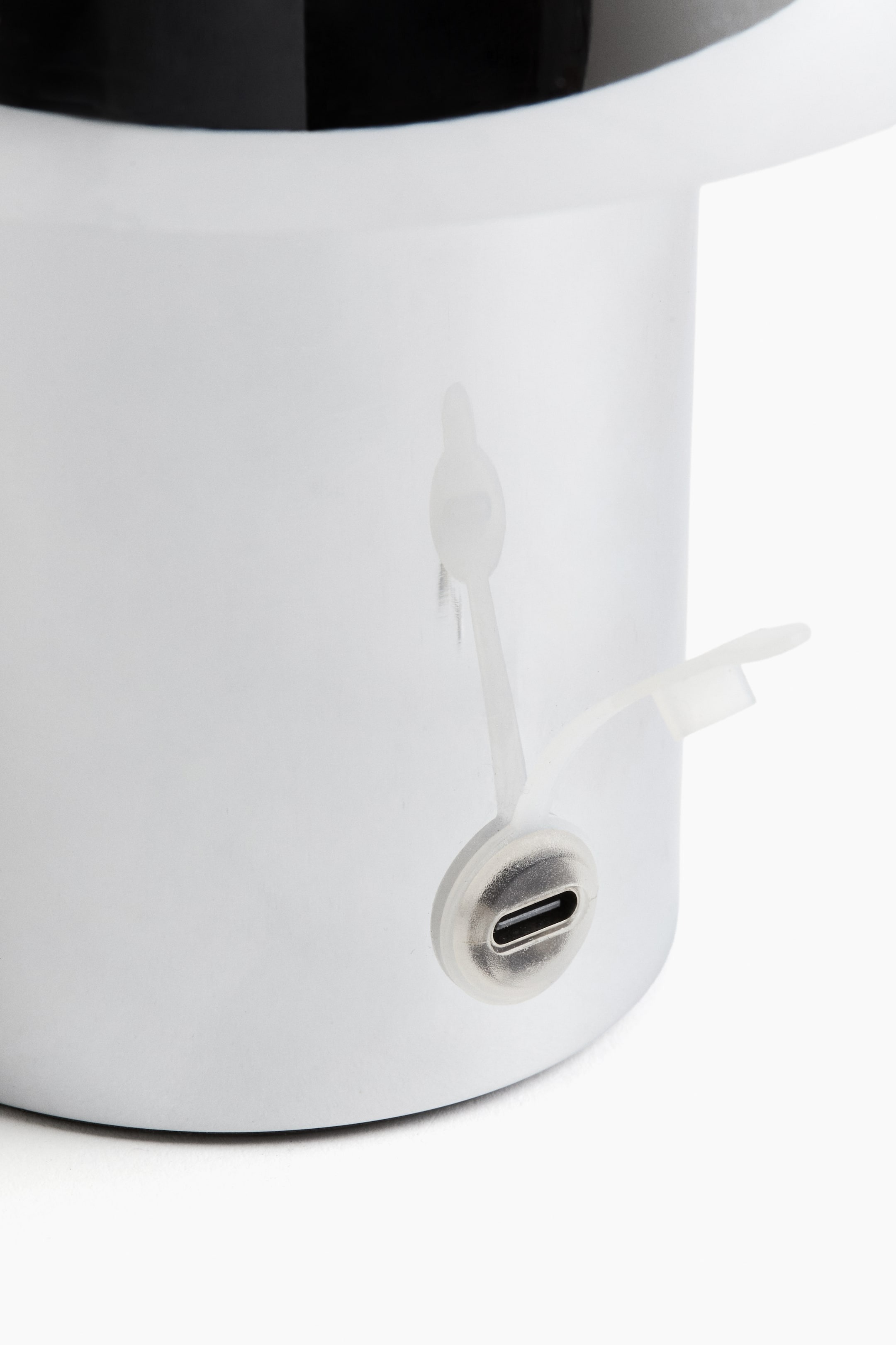 Металлическая настольная лампа изящной формы, напоминающей гриб. Выключатель расположен на основании.