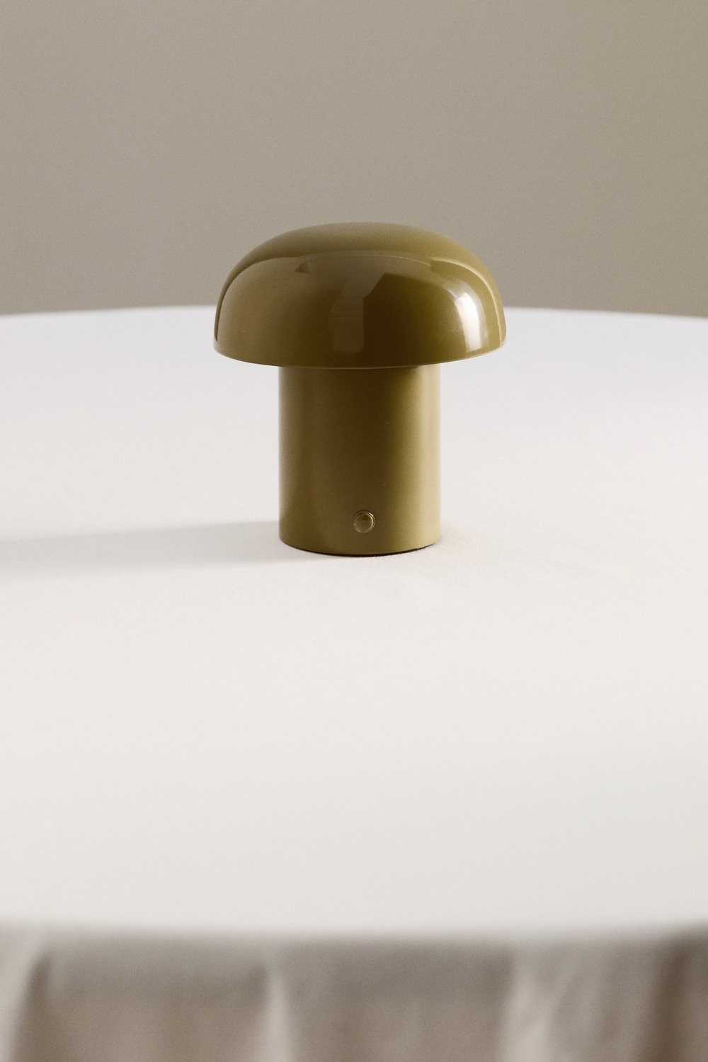 Металлическая настольная лампа изящной формы, напоминающей гриб. Выключатель расположен на основании.