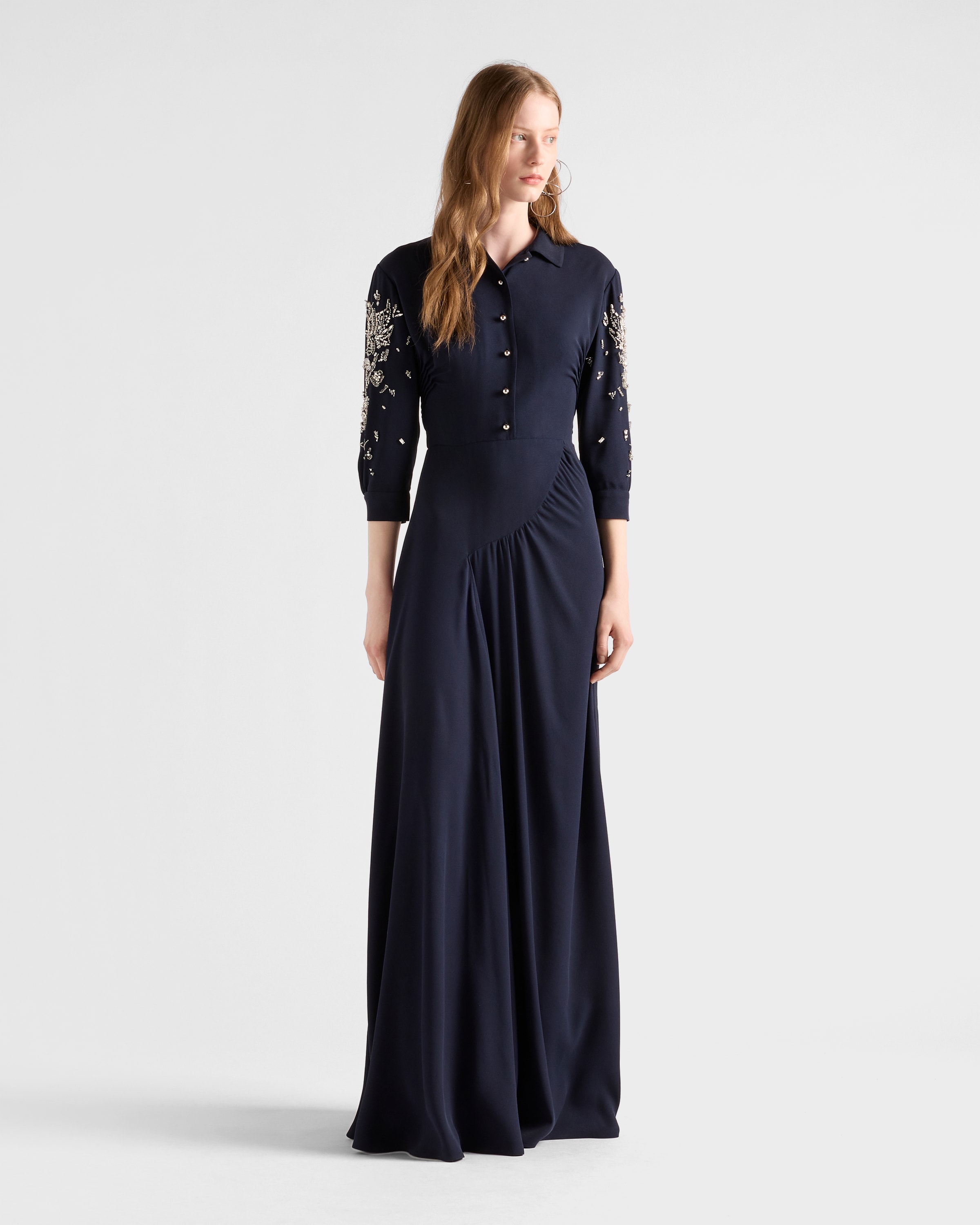 Длинное вышитое платье из сабле Prada, темно-синий