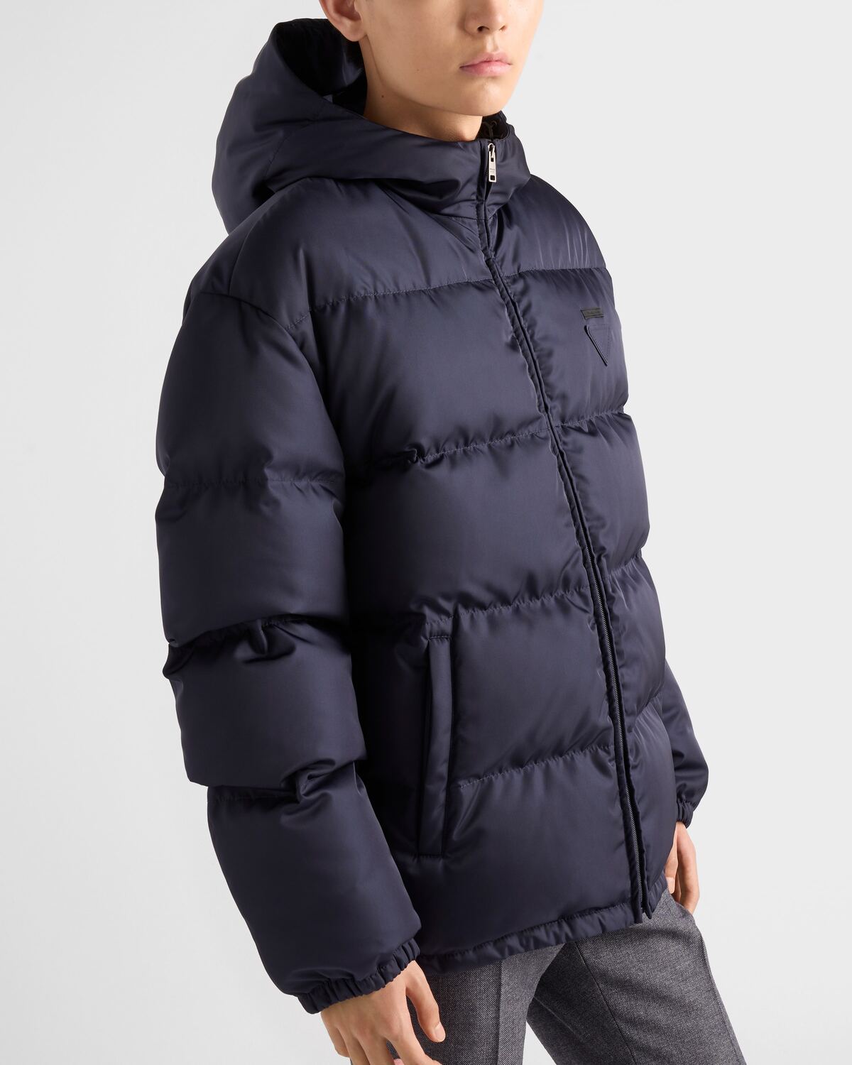 Пуховик средней плотности с капюшоном из переработанного нейлона Re-Nylon Prada, синий