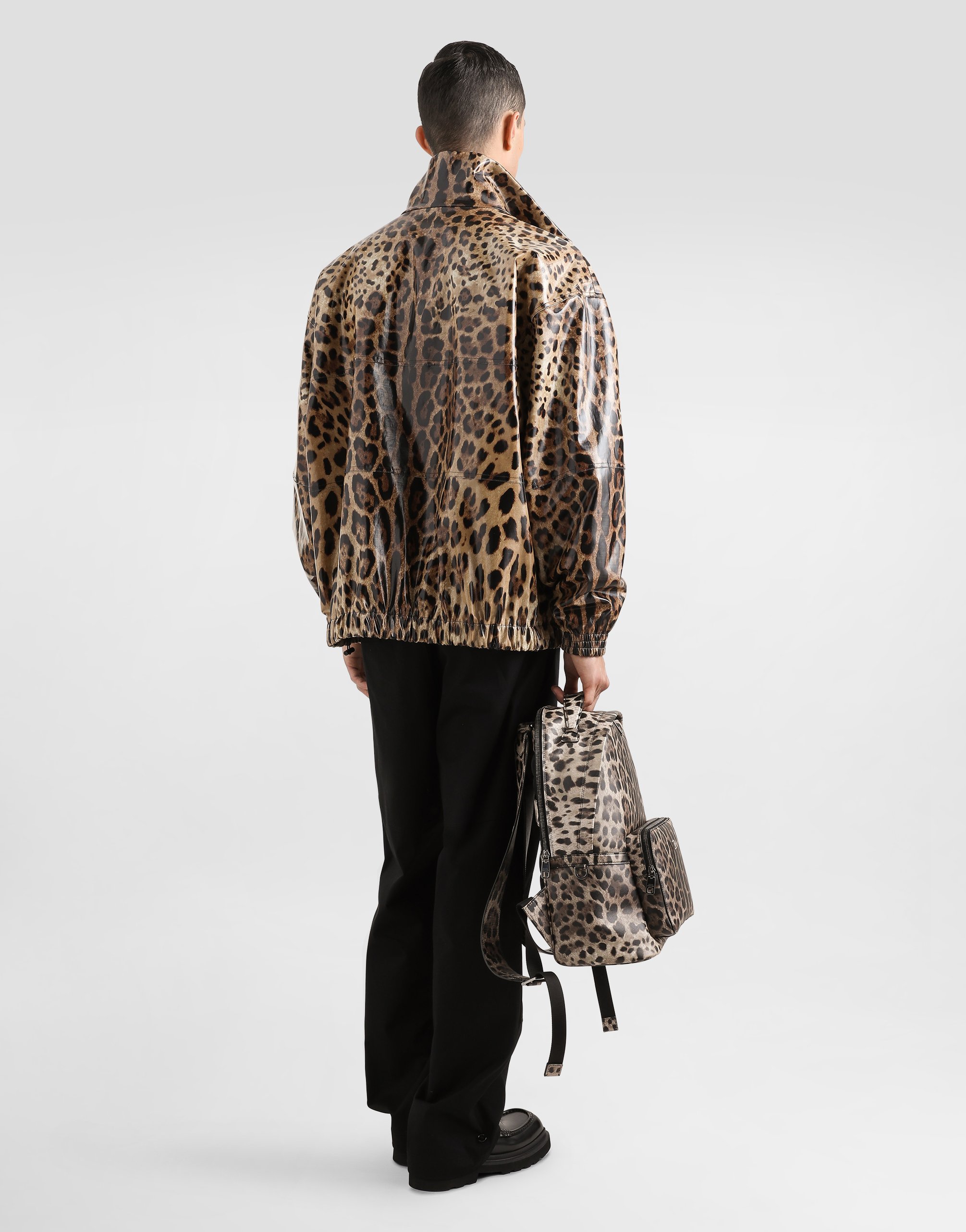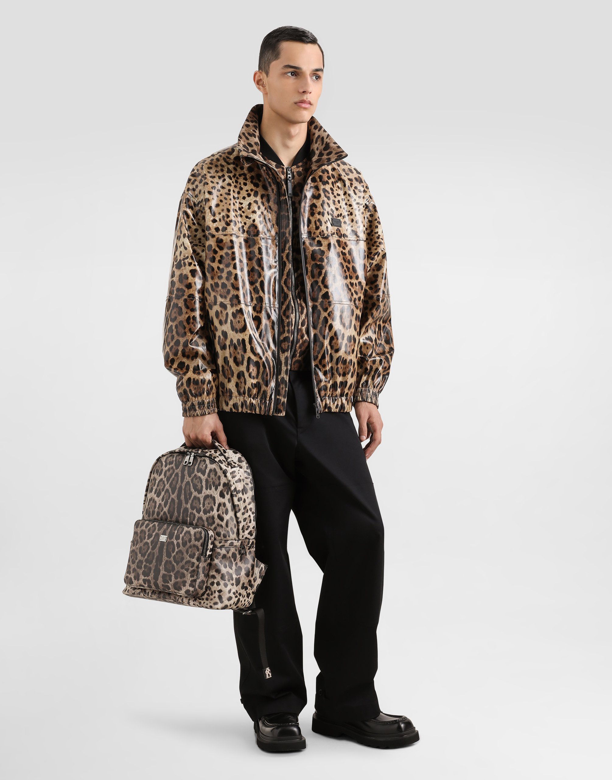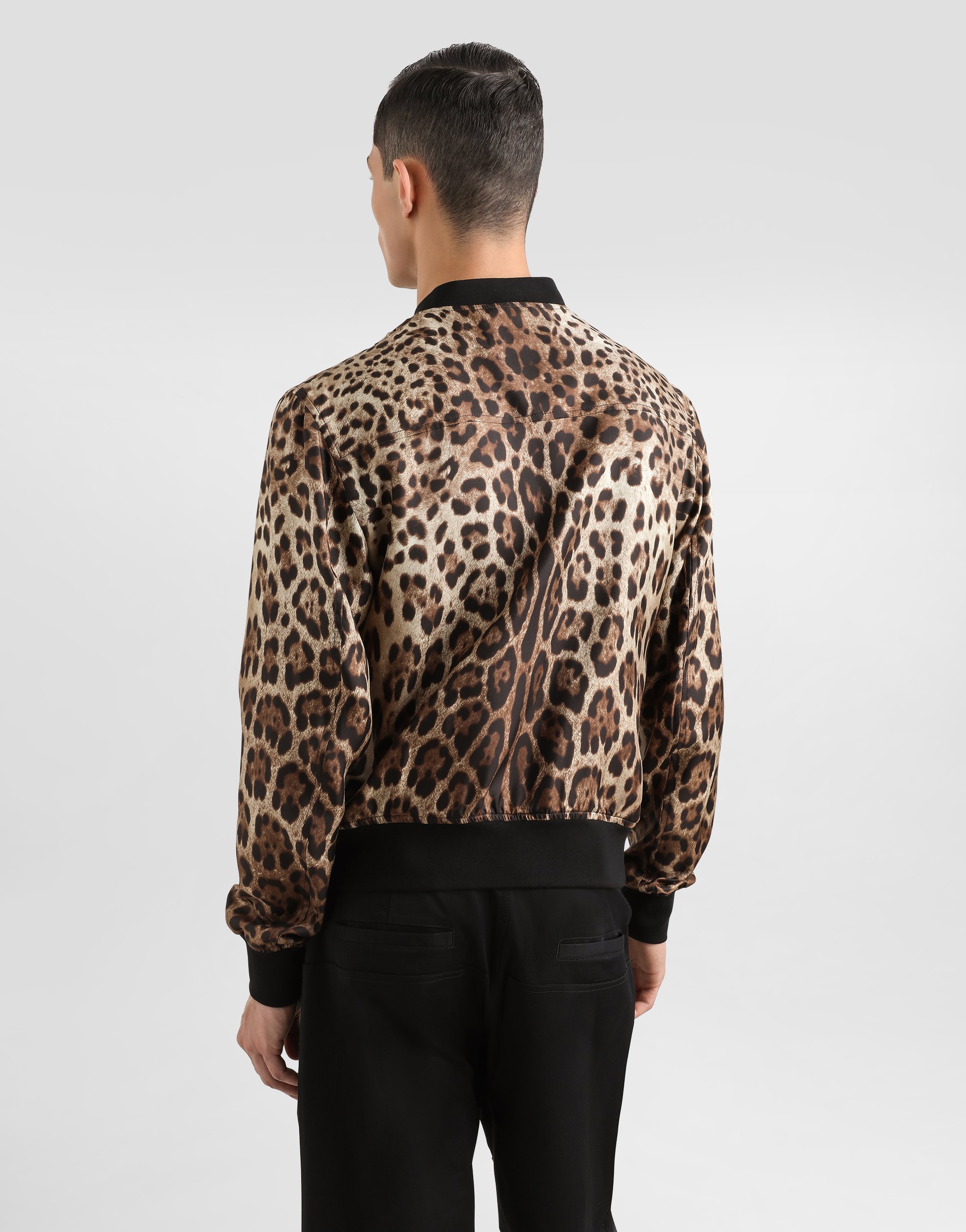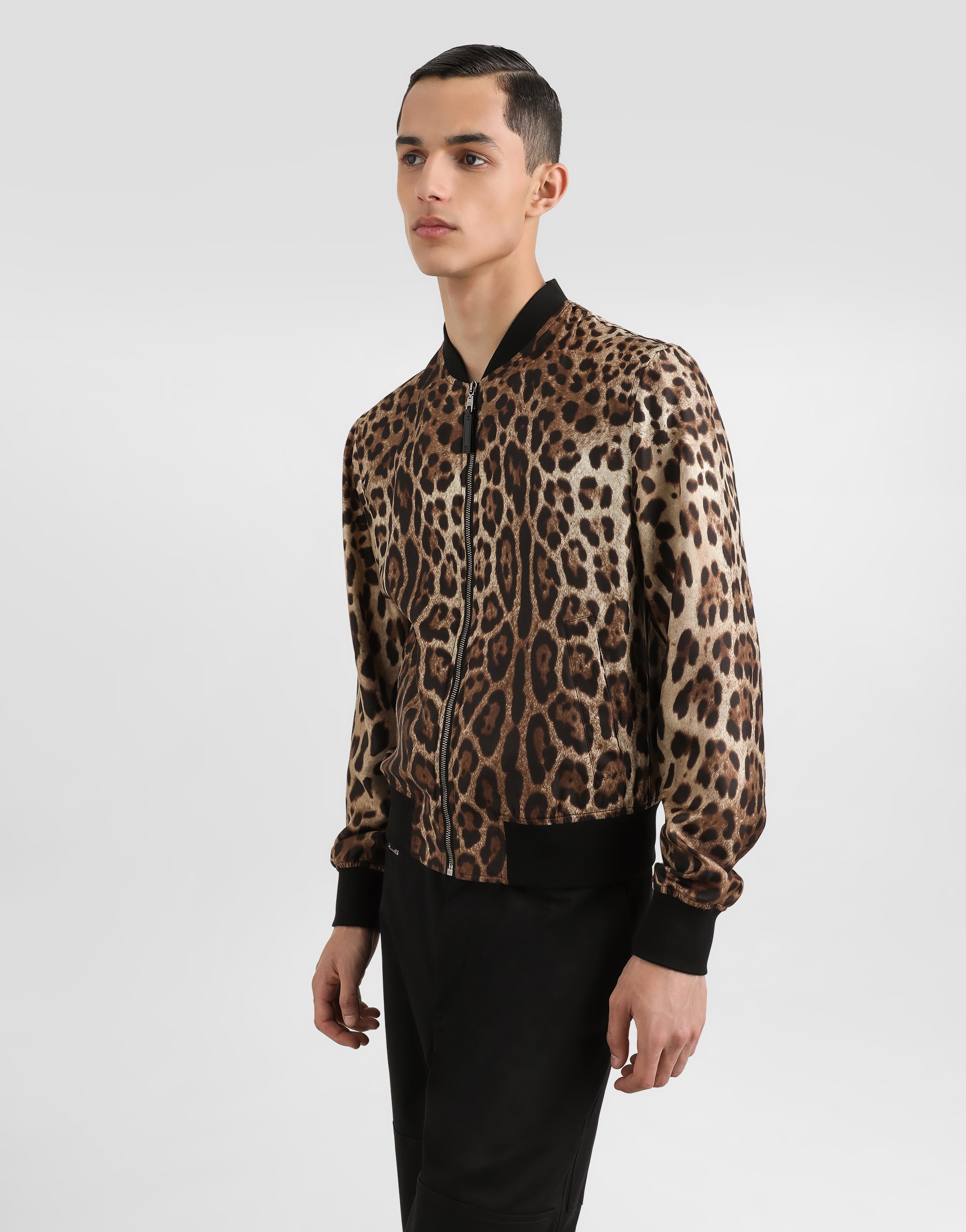 Бомбер из технической ткани с силиконовой нашивкой и логотипом Dolce & Gabbana с леопардовым принтом: • Леопардовый принт • Застежка-молния спереди • Наружные карманы на молнии • Воротник, низ и манжеты из трикотажа с эластичной нитью • Без подкладки • Длина изделия от шва воротника сзади - 63 см (для размера IT 48) • Сделано в Италии