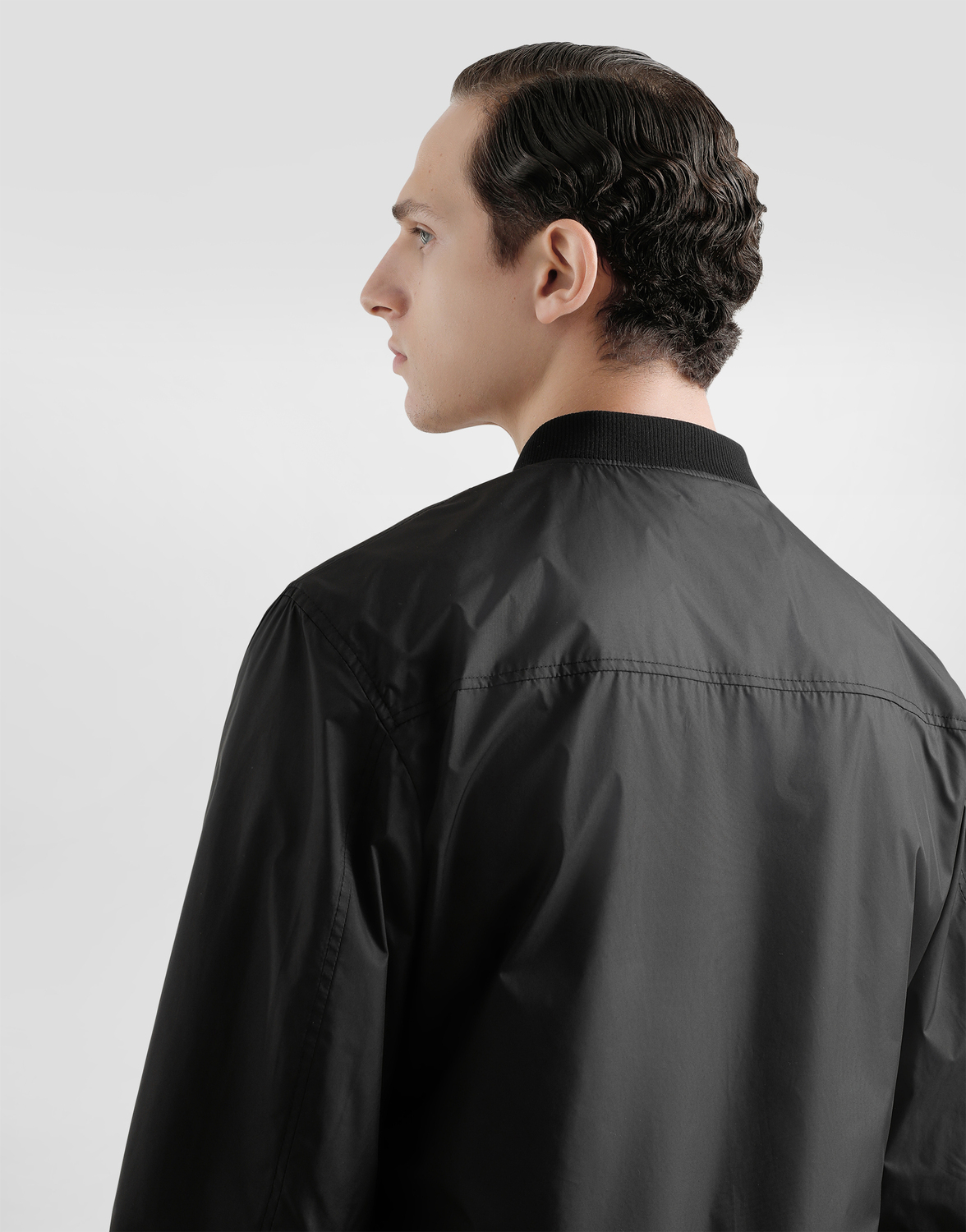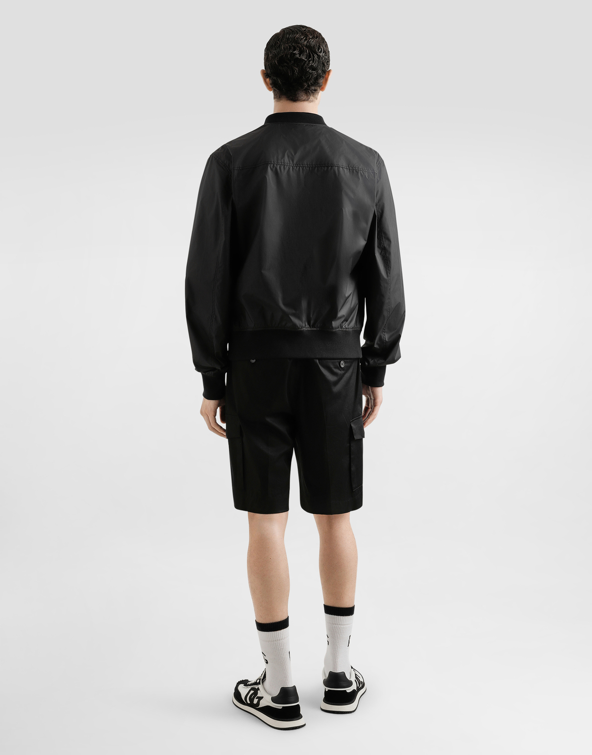 Бомбер из технической ткани с резиновым ярлыком и логотипом Dolce & Gabbana: • Черный • Застежка на молнию спереди • Наружные карманы на молнии • Воротник, подол и манжеты из эластичного трикотажа • Без подкладки • Длина изделия - 63 см от заднего шва воротника для размера IT 48 • Сделано в Италии