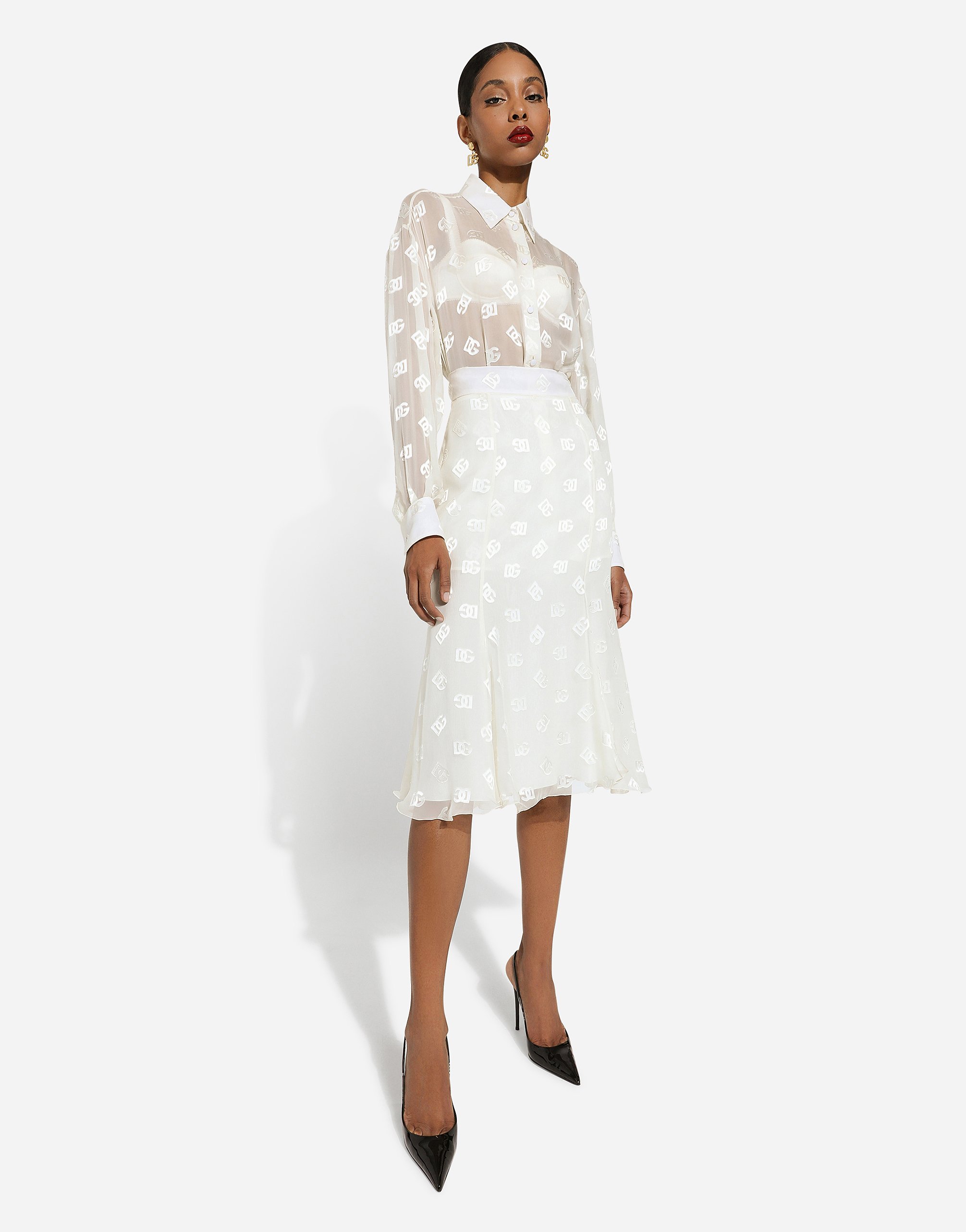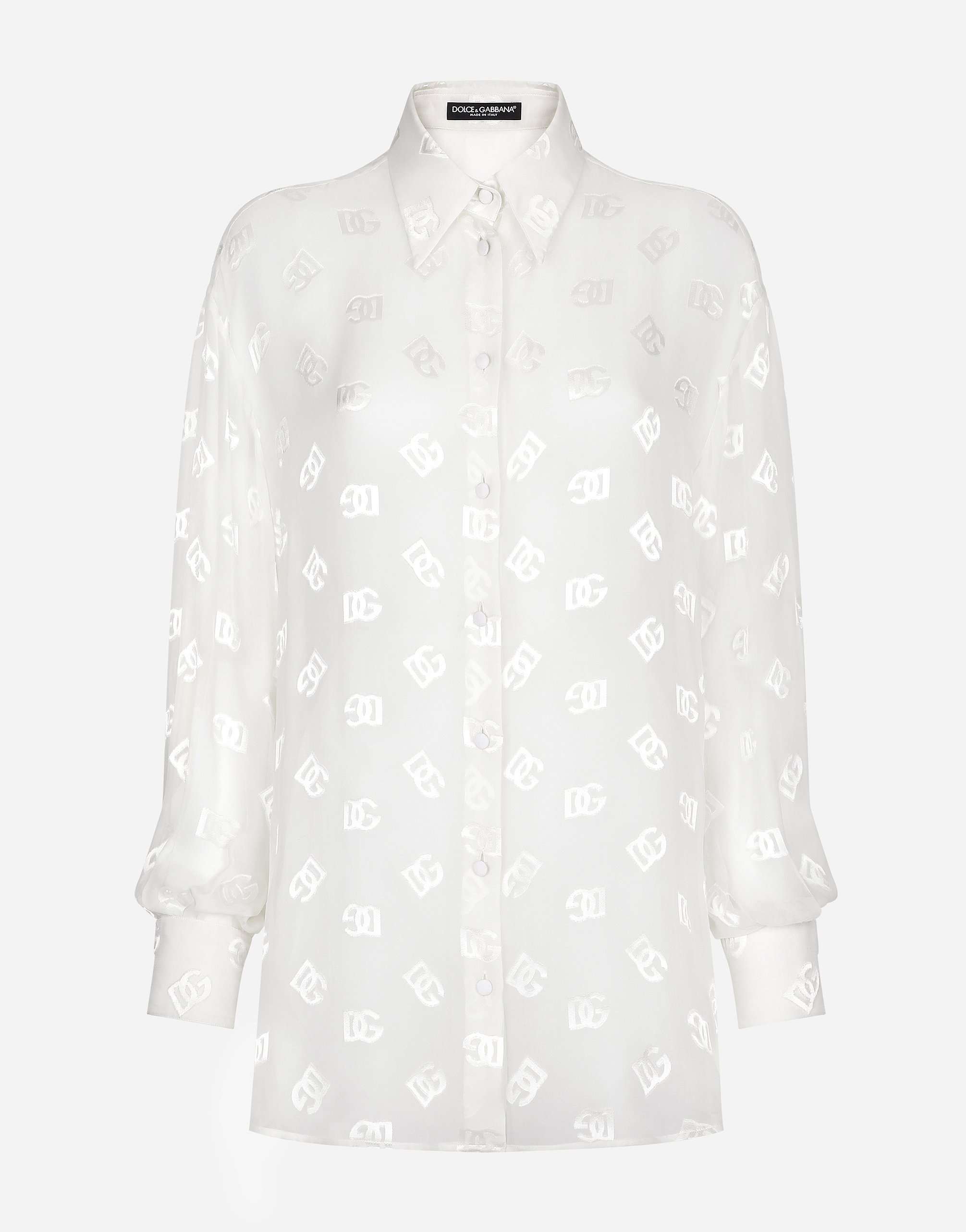 Сорочка из шелкового сатина dévoré с логотипом DG: • Белый цвет • Воротник-рубашка • Длинные рукава • Прямой крой • Застежка на пуговицы с фирменным нижним краем • Изделие имеет длину 77 см от шва воротника сзади для размера IT 40 • Модель высокая • Сделано в Италии