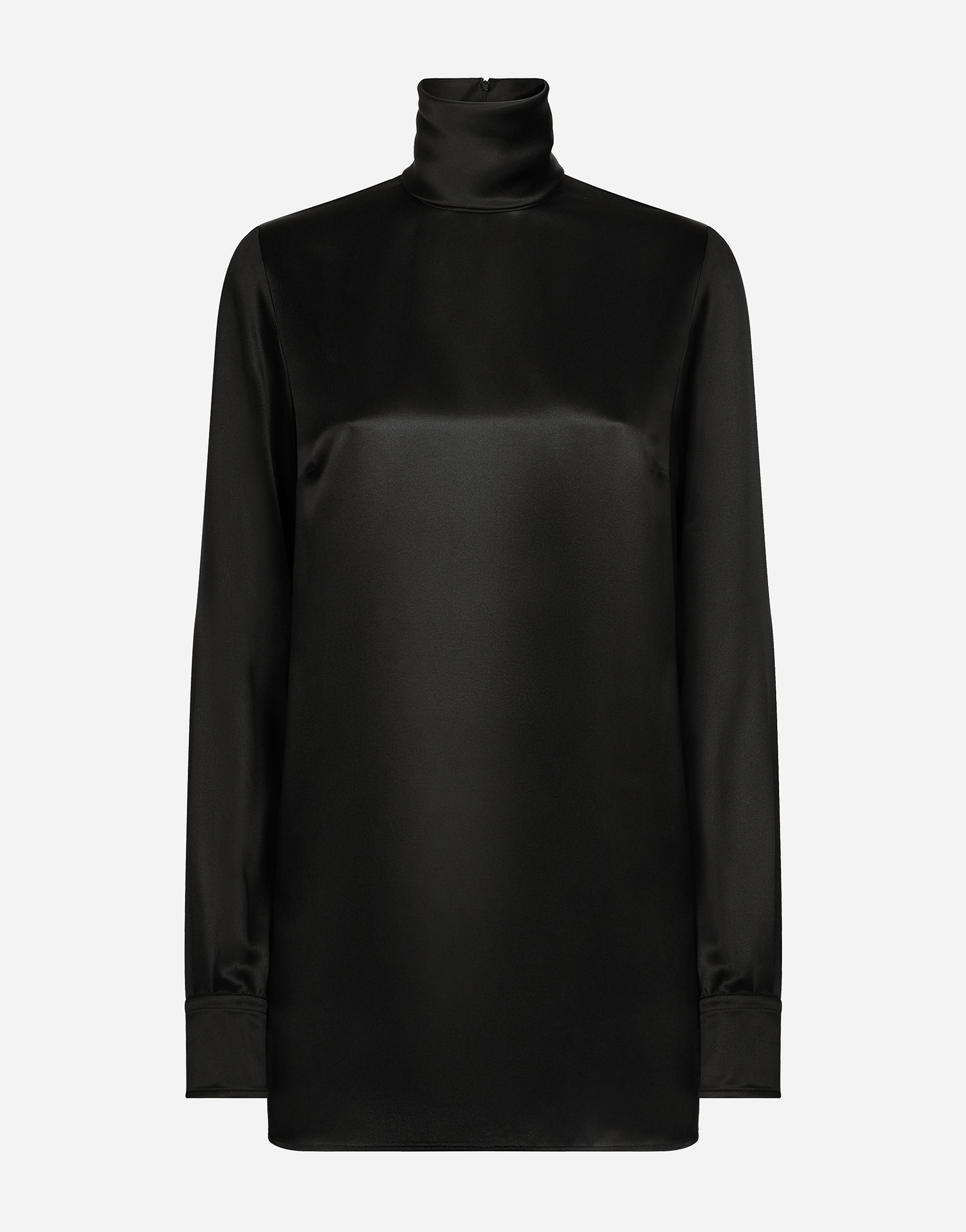 Блузка из шелкового сатина: • Черная • Высокий ворот • Длинные рукава • Манжеты в стиле рубашки • Без подкладки • Молния на затылке • Длина изделия от середины спины - 75 см (размер IT 40) • Модель: рост 175 см, размер IT 40 • Сделано в Италии