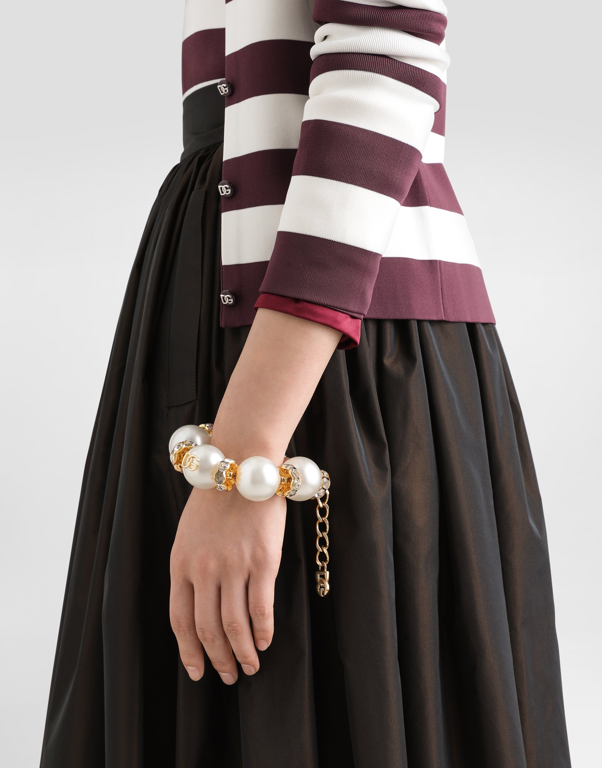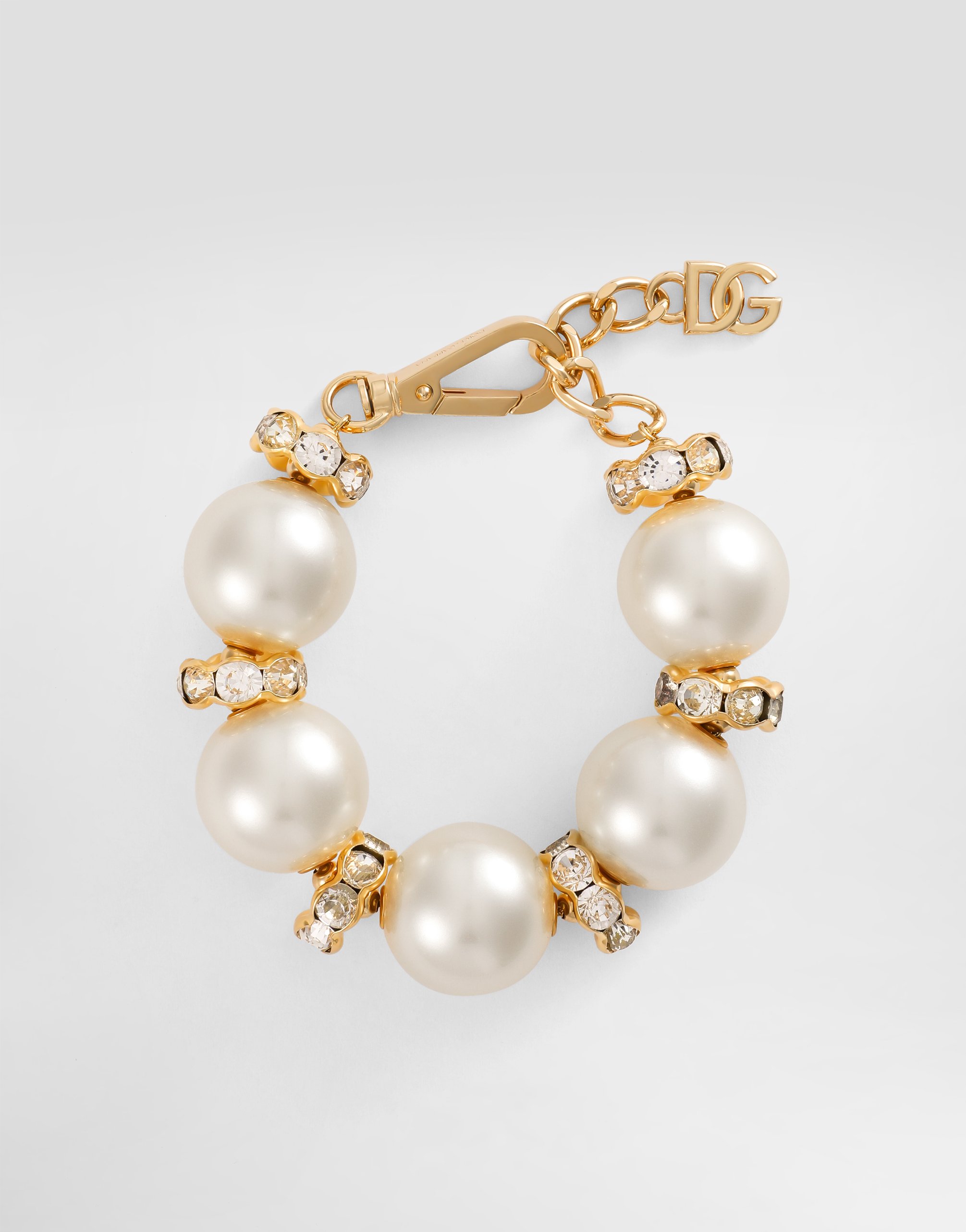 Браслет с макси-сферами из акрилового стекла, украшенный стразами и логотипом DG: • Золотой цвет • Длина: 26 + 5 см • Застежка-карабин • Не содержит никеля, гипоаллергенные материалы • Гравированный логотип • Сделано в Италии