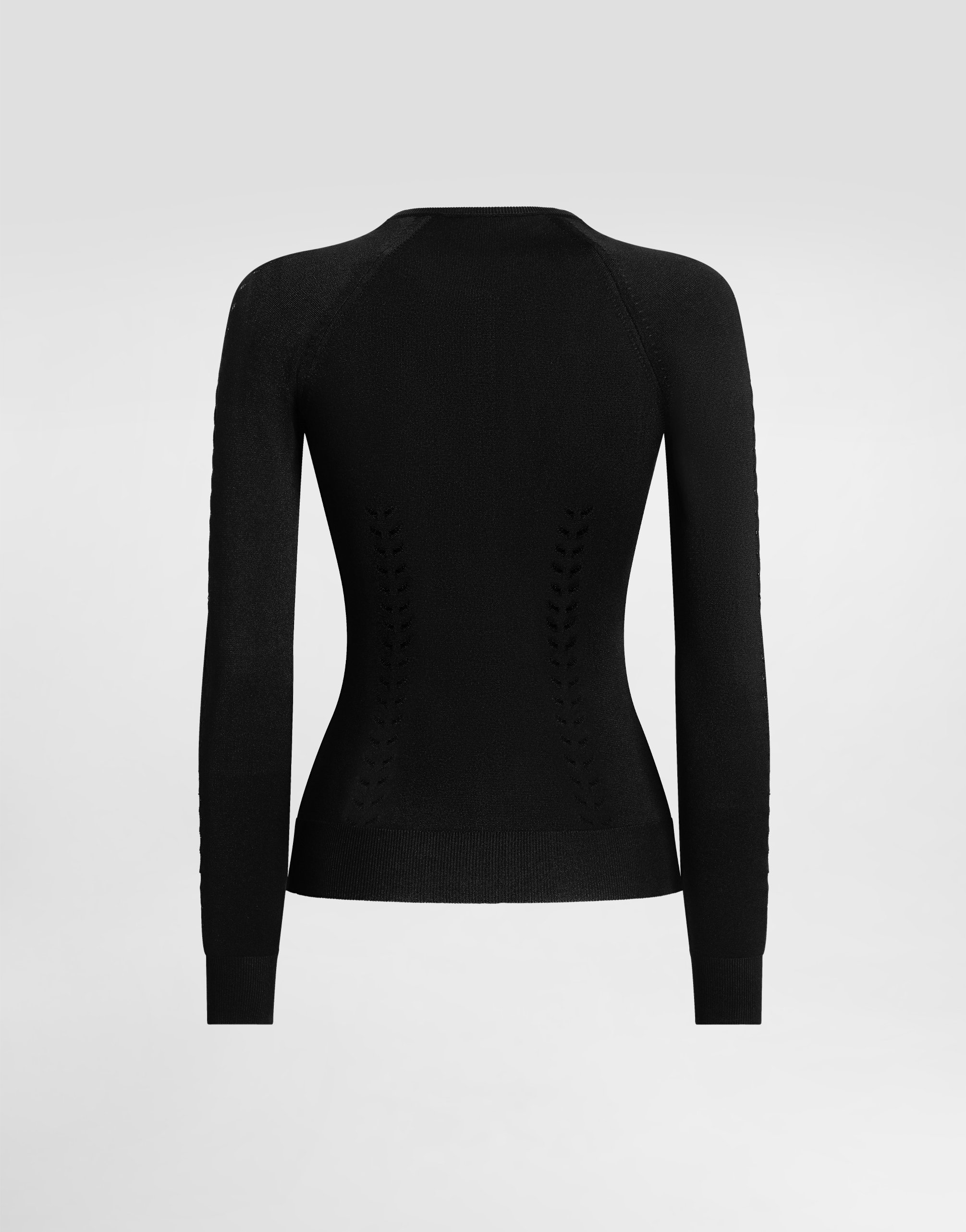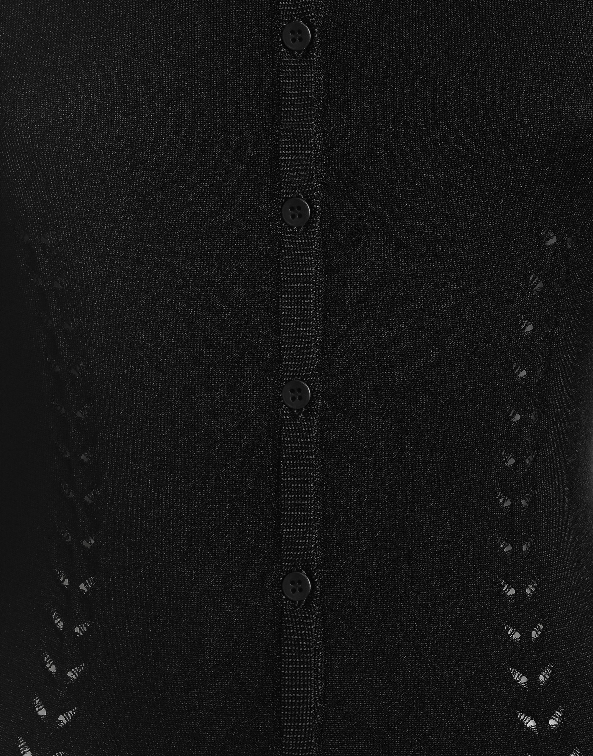 Кардиган из вискозы с отделкой строчкой: • Черный • Вязка 18-ой толщины • Круглый вырез • Длинные рукава • Ребристая отделка • Покрой реглан • Приталенный силуэт • Застежка на пуговицы • Длина изделия от плечевого шва - 60 см (для размера IT 40) • Модель: рост 175 см, размер IT 40 • Сделано в Италии