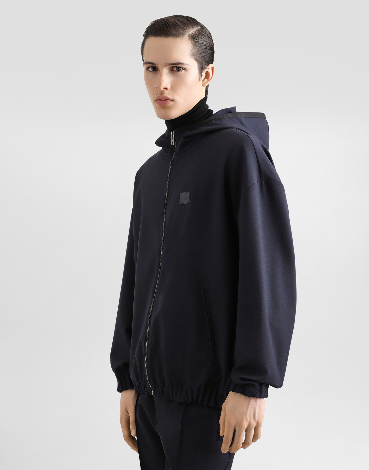 Шерстяная куртка с капюшоном и тоном меткой с логотипом Dolce & Gabbana: • Синий цвет • Свободный крой • Длинные рукава • Застежка на молнию • Эластичный пояс и манжеты • Передние прорезные карманы и два внутренних кармана • Лейбл TRAVEL • На подкладке • Длина изделия от шва воротника сзади по размеру IT 48 - 69 см • Сделано в Италии
