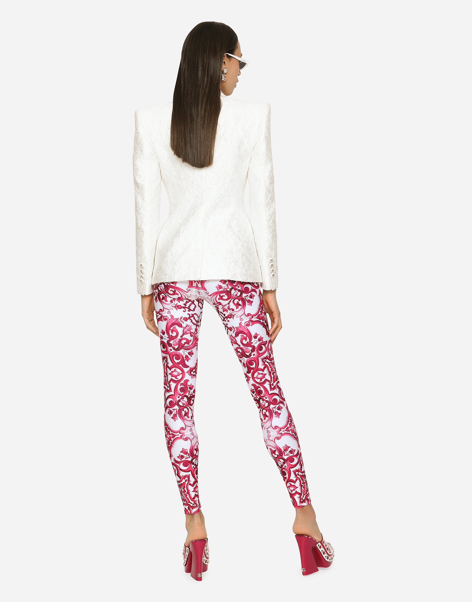Блейзер Turlington из жаккарда: • Белый • Однобортный • Лацканы с острыми концами • Длинные рукава • Карманы с клапанами • Подкладка из эластичного шелкового сатина • Застежка на пуговицу, обтянутую лентой canneté, и логотип DG • Длина изделия от шва воротника сзади - 70 см (для размера IT 40) • Рост модели - 175 см, на ней размер IT 40 • Сделано в Италии