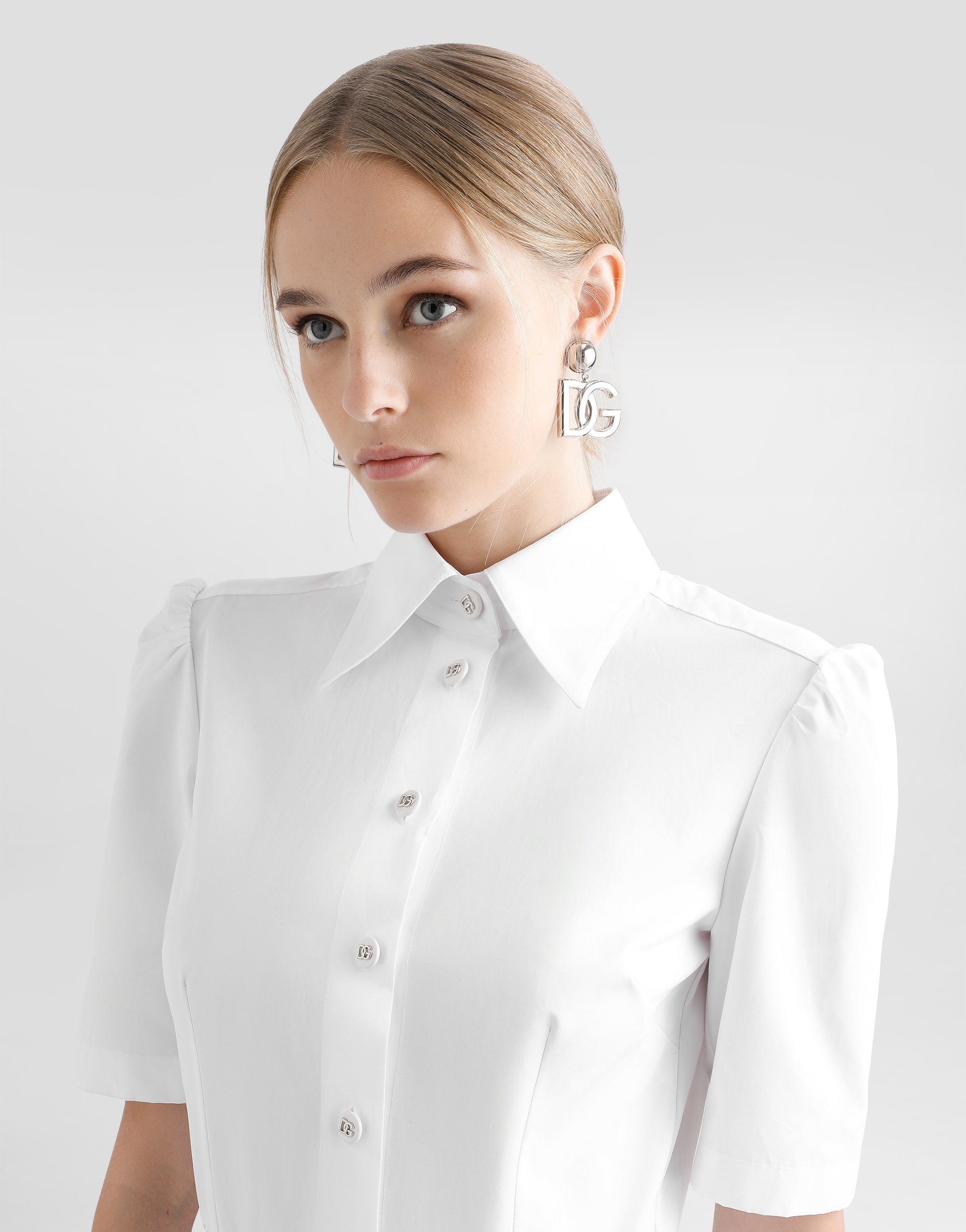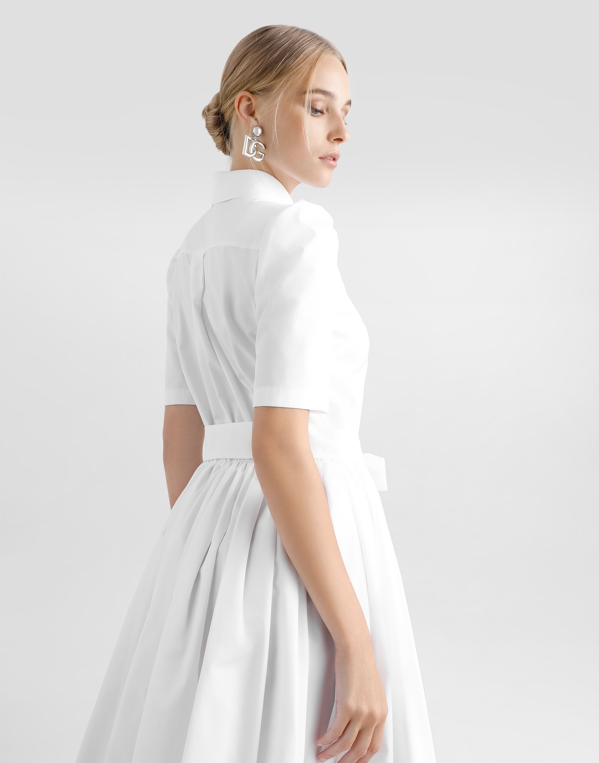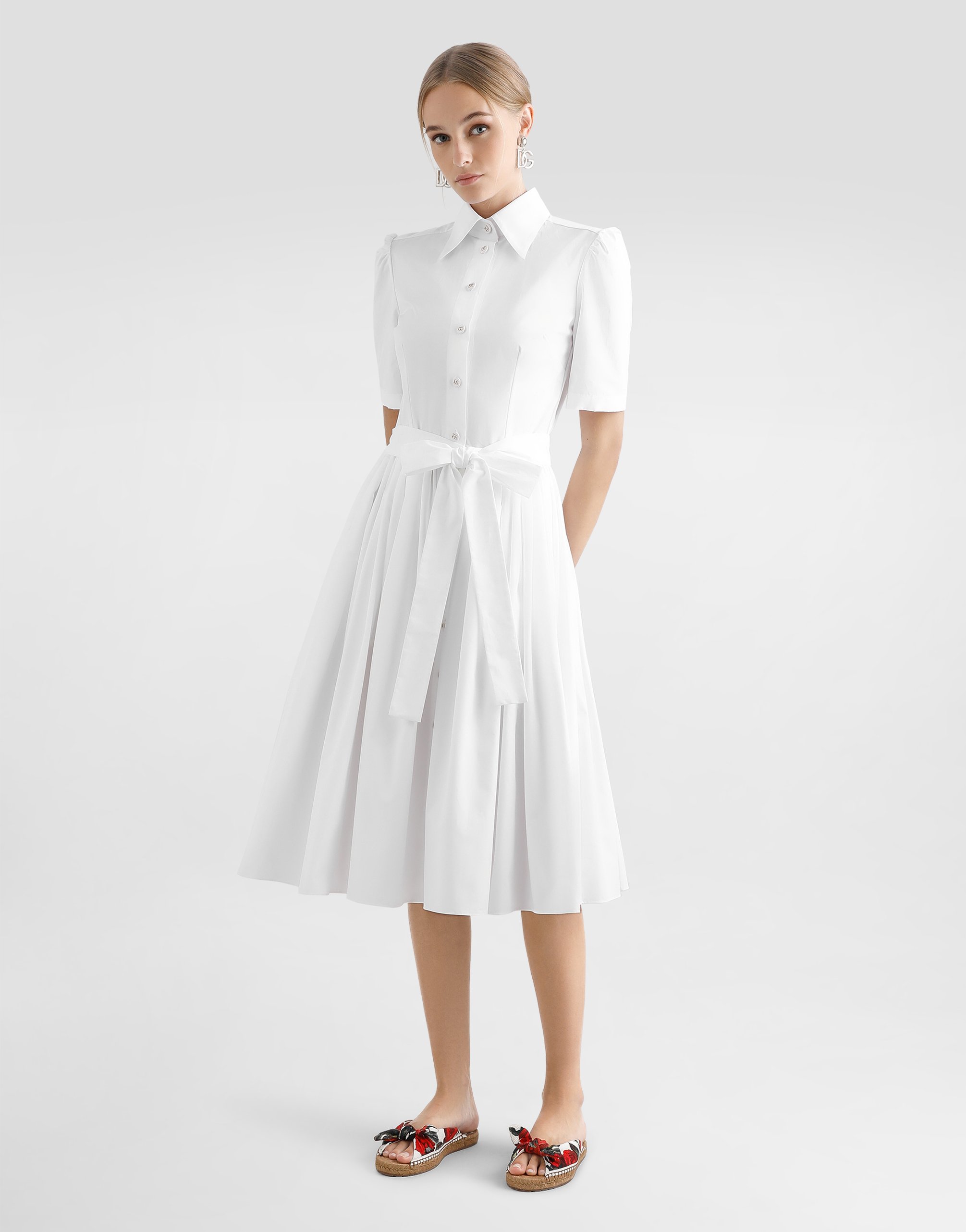 Хлопковое поплиновое платье-рубашка миди длины: • Белый цвет • Воротник-рубашка • Короткие рукава • Пояс на талии • Без подкладки • Пуговицы с логотипом DG спереди • Длина изделия - 110 см по спинке для размера IT 40 • Модель ростом 175 см, размер IT 40 • Сделано в Италии