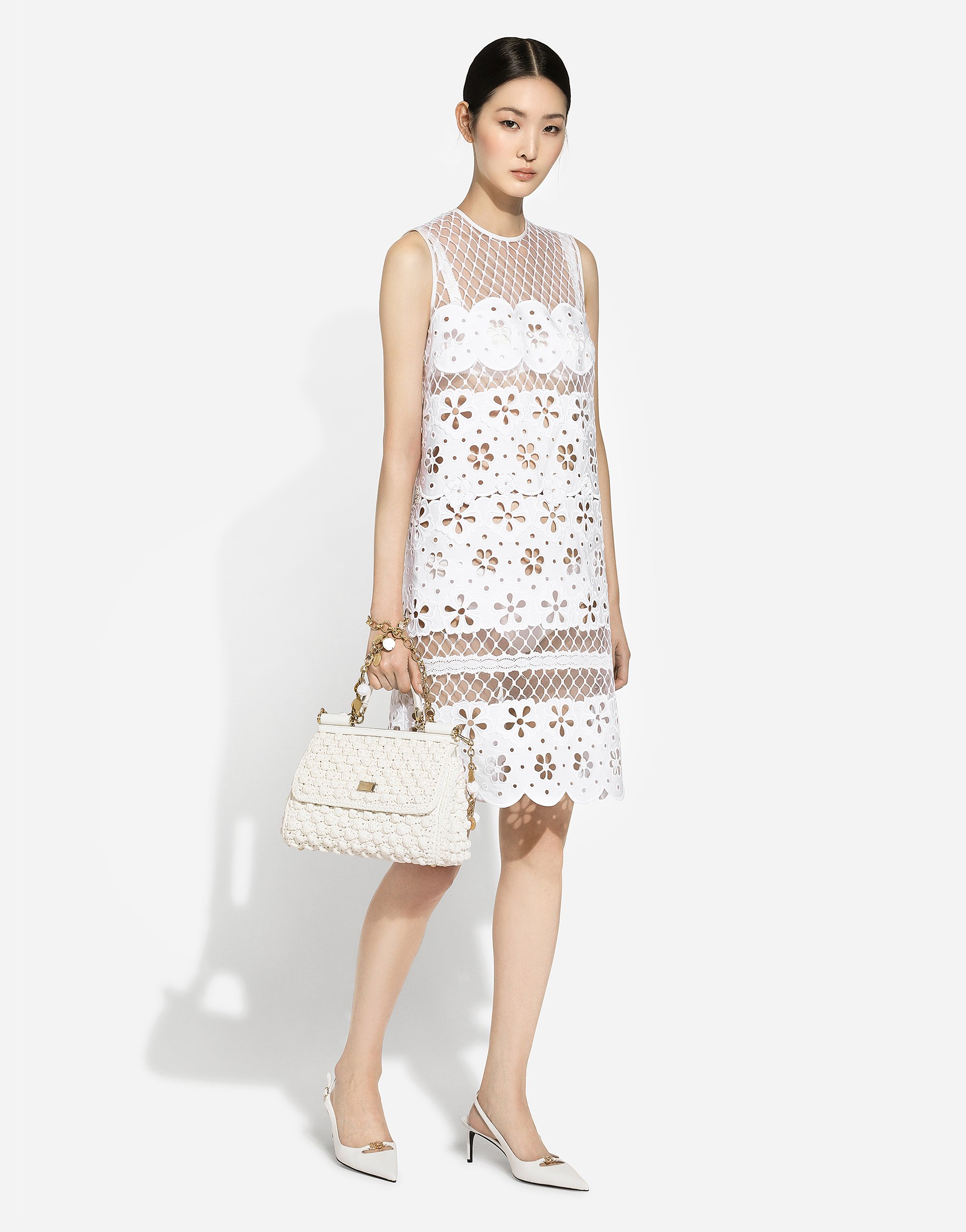 Итальянские летние дни 1960-х годов, безупречная чистота белого, утонченная элегантность светского общества той эпохи. Образы коллекции FW24/25 Capri воплощают все это безупречно. Модели варьируются от воздушных силуэтов из поплина или платьев и юбок «мешок» до верхней одежды из броката и рубашек из ткани с цветочной инкрустацией. Знаковые сумки - Logo Bag, Sicily Bag и Dolce Box - дополняют образы, а обувь украшена вышивкой с мотивами, вдохновленными кристально чистым морем Капри.