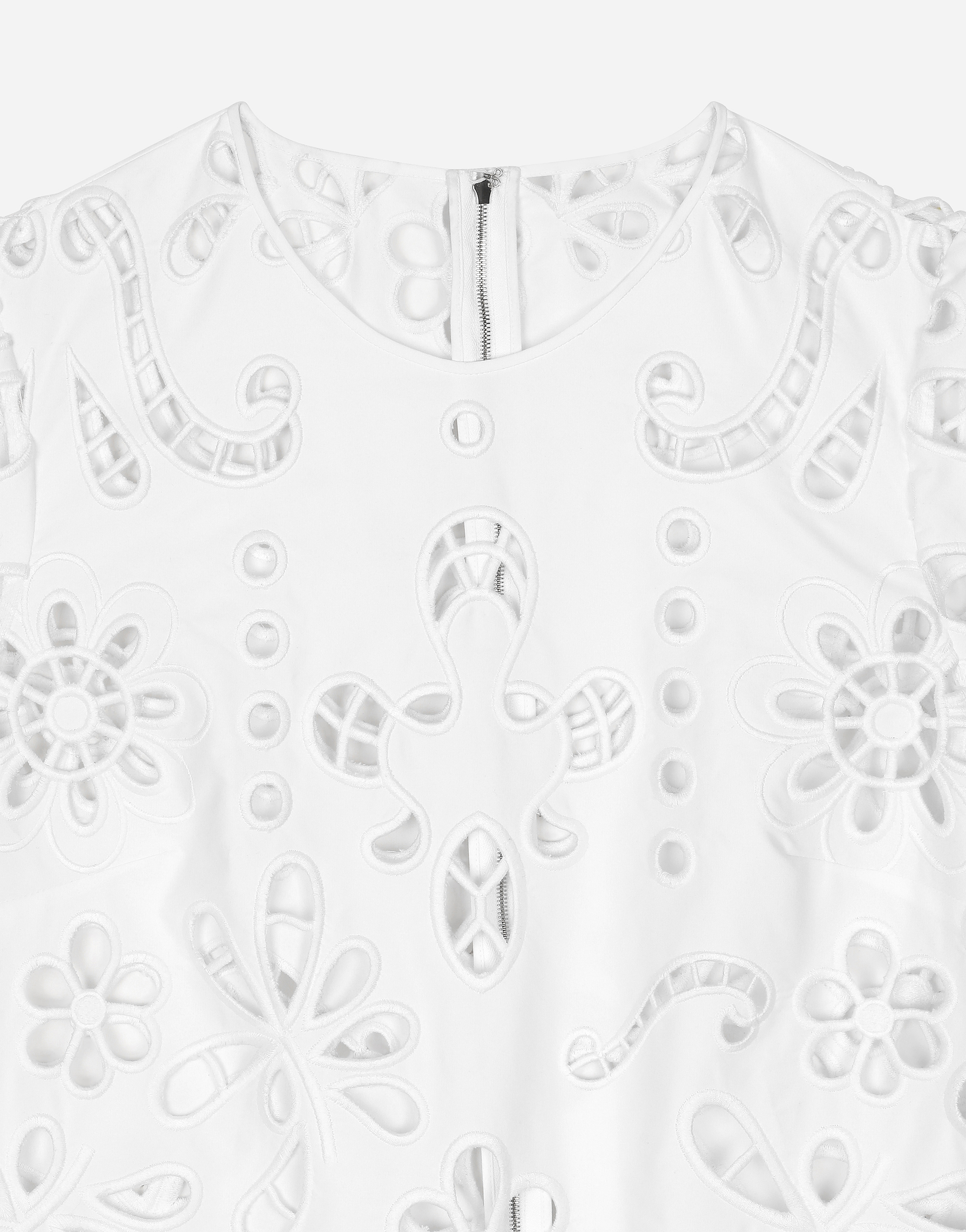 Миди-платье А-силуэта из хлопкового поплина с вырезными деталями: • Белый цвет • Круглый вырез • Рукава 3/4 с объемом • Без подкладки • Застежка сзади на молнию и крючок • Длина изделия по спинке - 89 см (размер IT 40) • Модель ростом 175 см, на ней размер IT 40 • Сделано в Италии