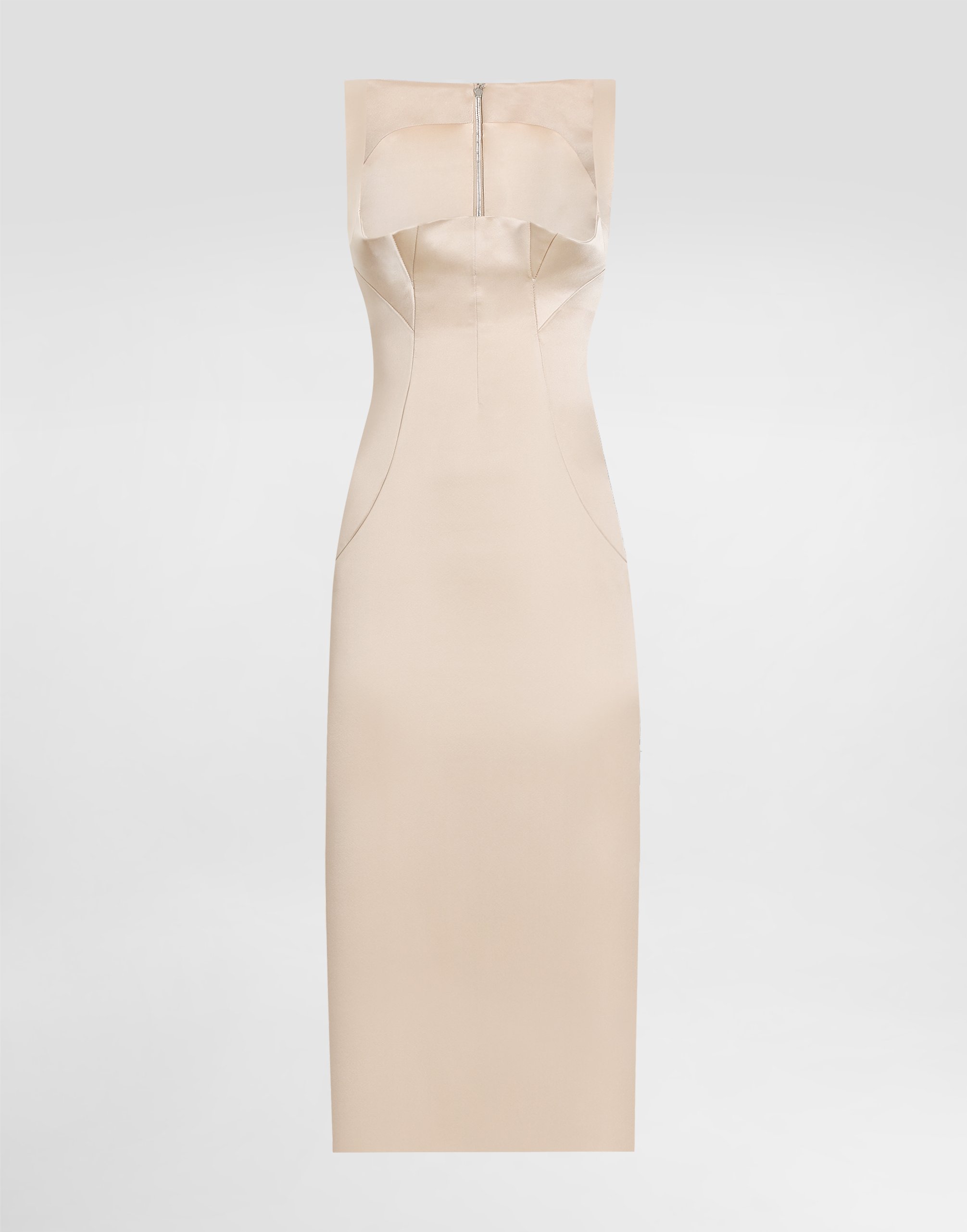 Приталенное платье-миди из эластичного атласа: • Бежевый цвет • Глубокий квадратный вырез • Без рукавов • Подкладка из эластичного шелкового атласа • Застежка сзади на молнию и крючок • Длина изделия от талии вниз - 75 см (для размера IT 40) • Модель ростом 175 см, размер IT 40 • Сделано в Италии