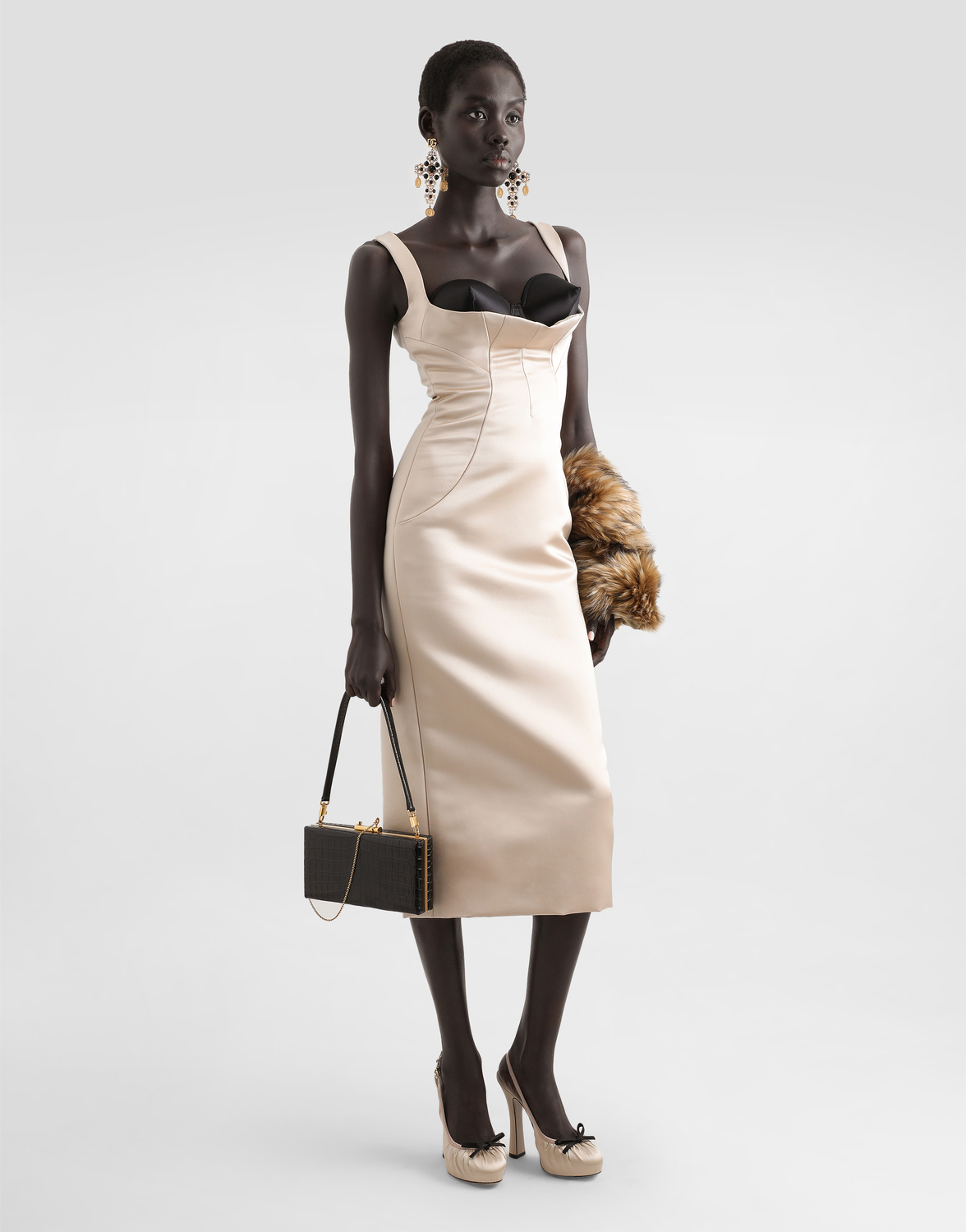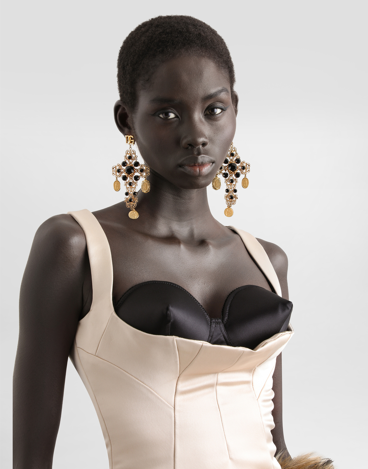 Женская коллекция весна/лето 2025 прославляет итальянскую красоту через яркую и харизматичную женственность. В центре внимания белье в стиле 50-х, сочетающееся с облегающими платьями, корсетами и объемными тренчами. Знаковые жакеты получили современное звучание за счет укороченных фасонов и актуальных вставок, а цветочные принты придают романтичность. Вечерние наряды сияют легкими тканями и кристаллами, которые дополняют аксессуары, формирующие образ: от знаковых сумок до серег-крестов.