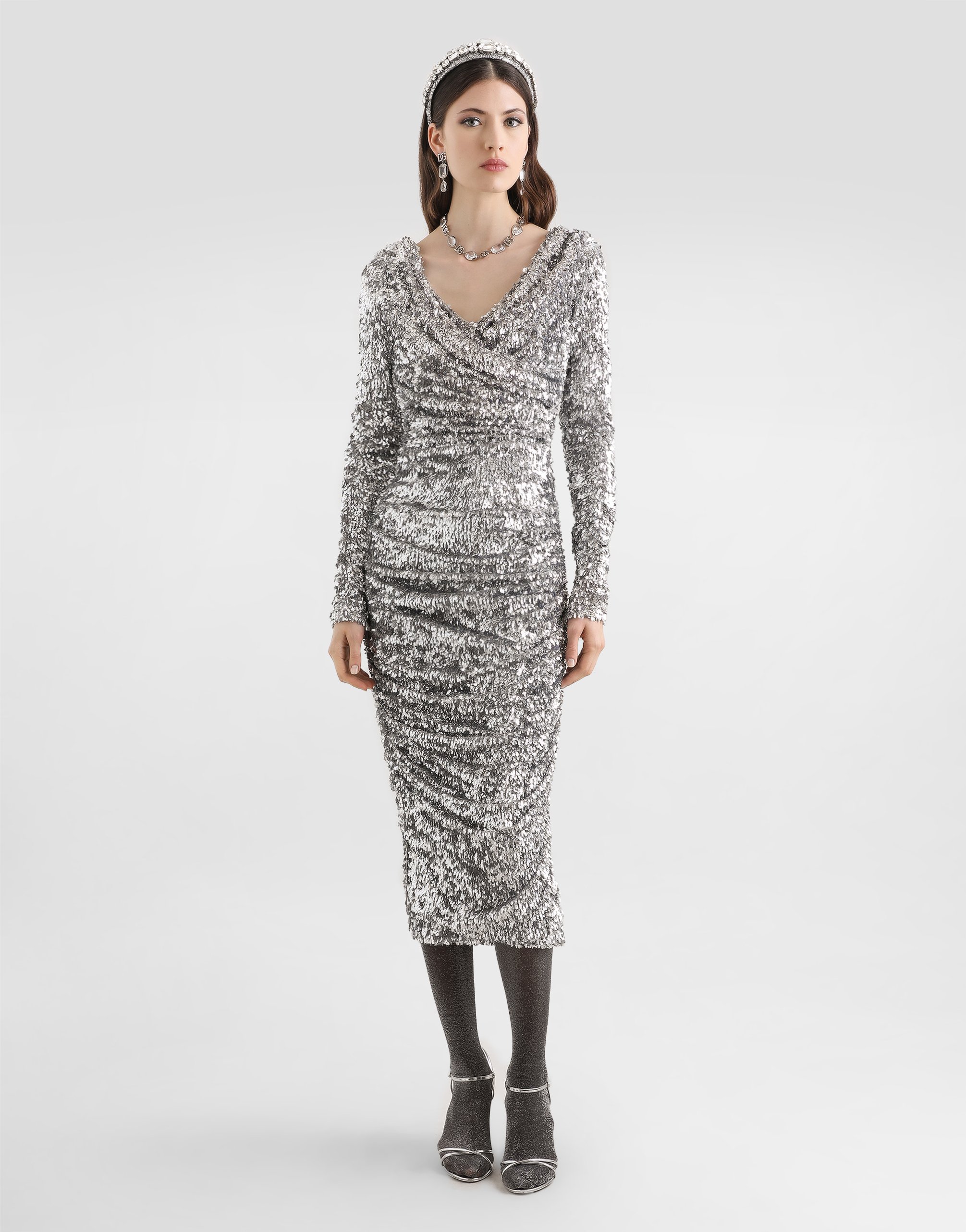 Это серебряное платье с драпировкой из пайеток - идеальный выбор для вечеринки. Благодаря своему изысканному дизайну и мерцанию пайеток, этот предмет гардероба не останется незамеченным.