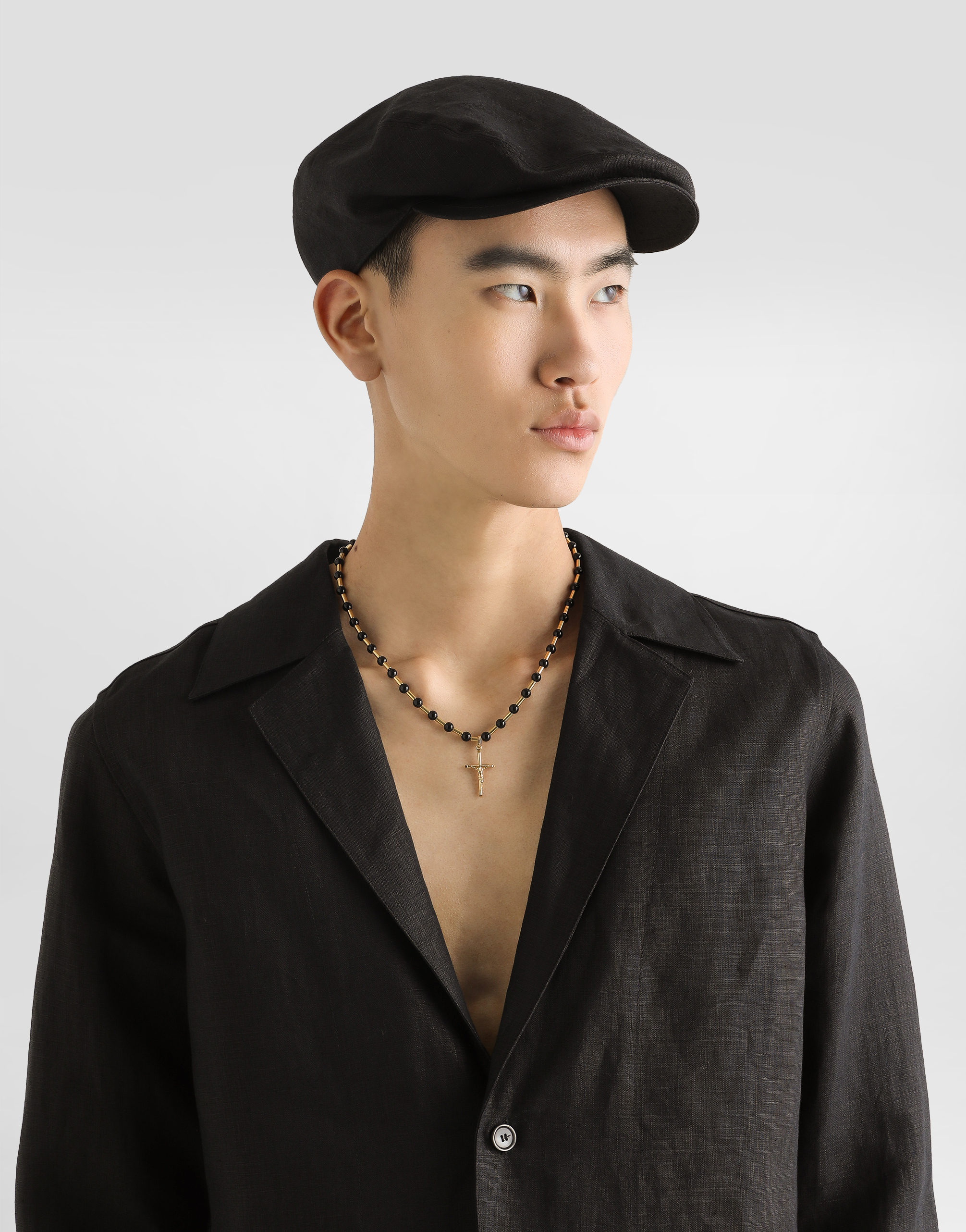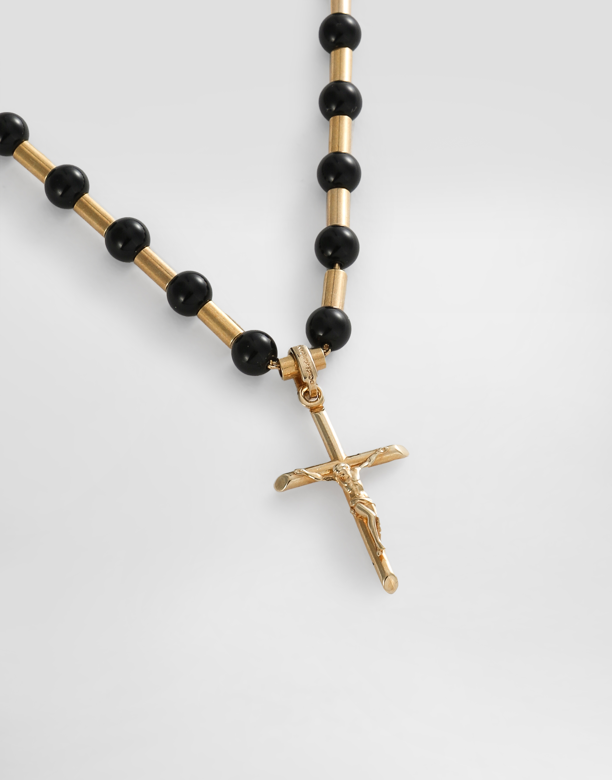 Ожерелье-четки из латуни с драгоценными камнями и подвеской в виде креста: • Черный и золотой • Застежка-карабин • Длина: 45 см + 5 см удлинитель • Гравированный логотип • Не содержит никель, гипоаллергенные материалы • Сделано в Италии