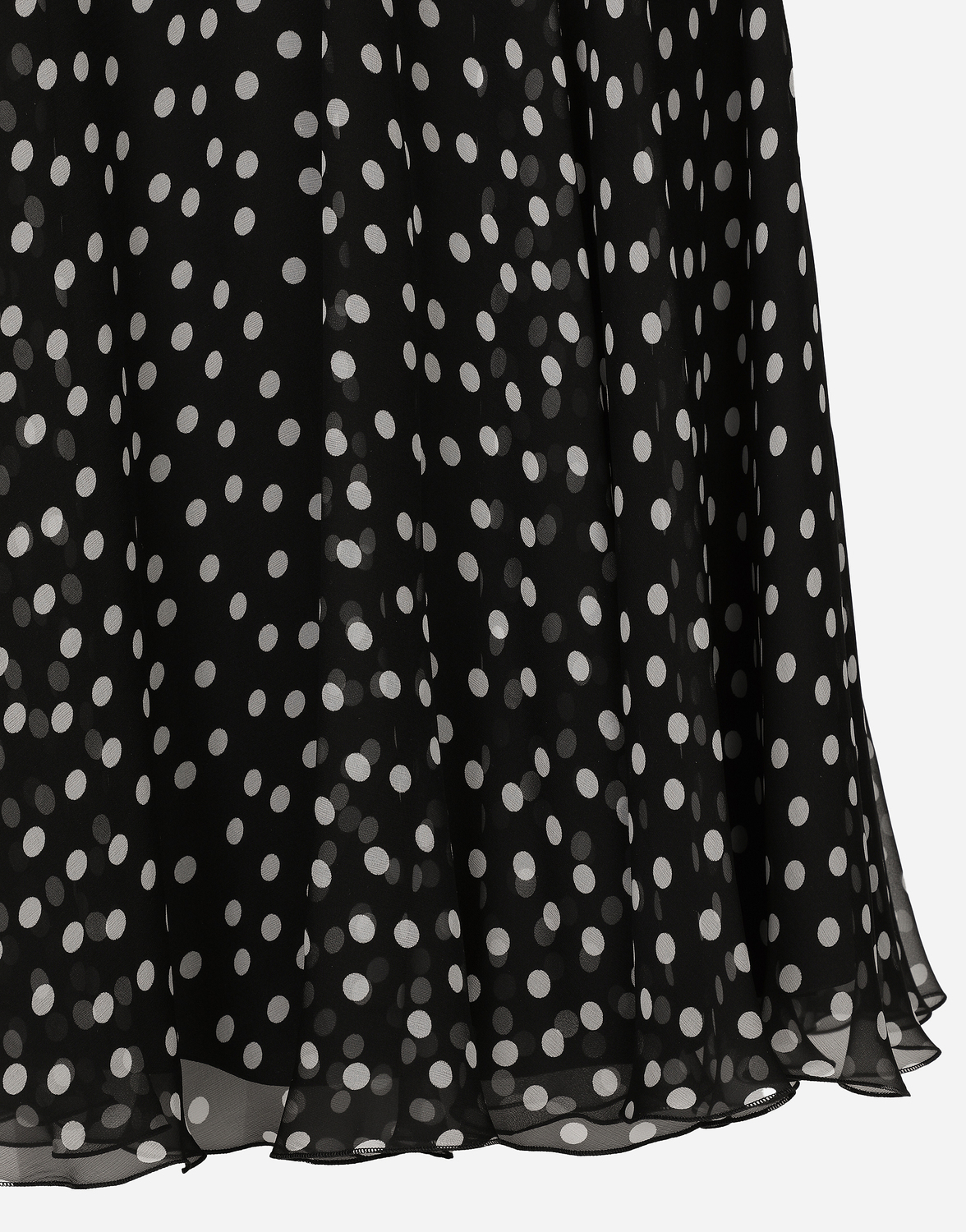 Асимметричное платье из шелкового шифона в горох: • Черный цвет • Круглый вырез • Длинные рукава-перчатки • Сборка по центру спинки • Шлица сзади • Нижняя юбка из эластичного шелкового крепдешина • Застежка сзади на молнию и крючок • Длина изделия от талии вниз - 78 см для размера IT 40 • Модель ростом 175 см, размер IT 40 • Сделано в Италии