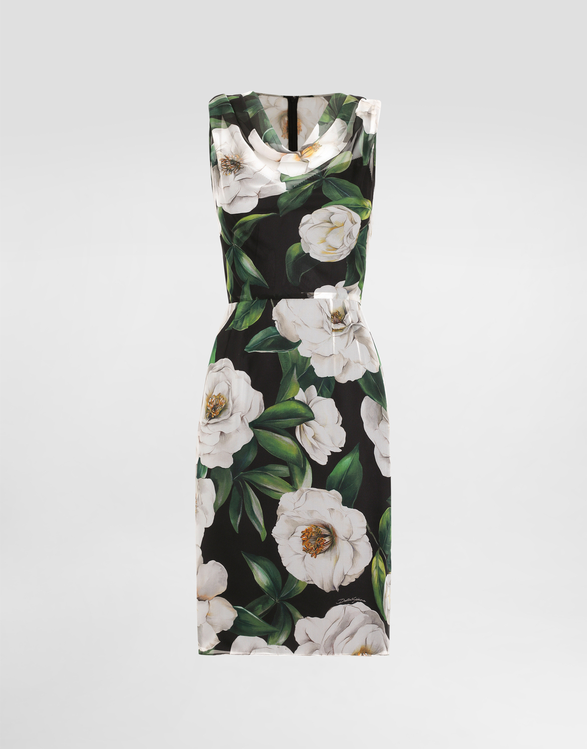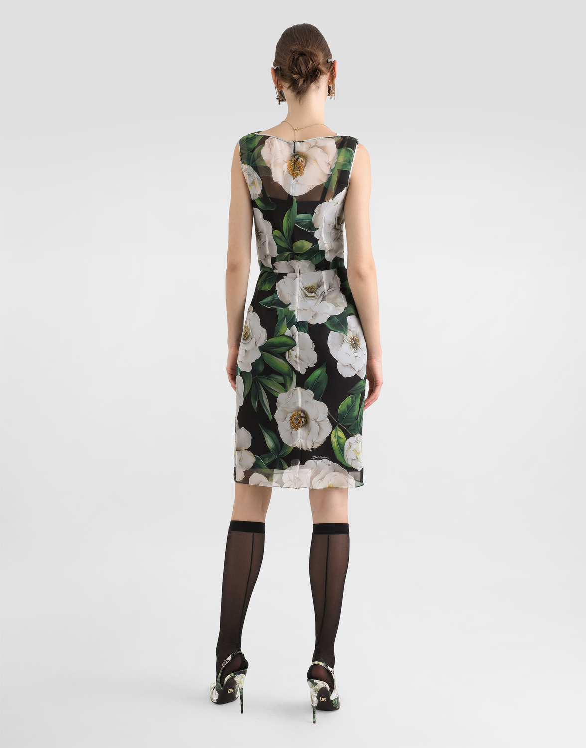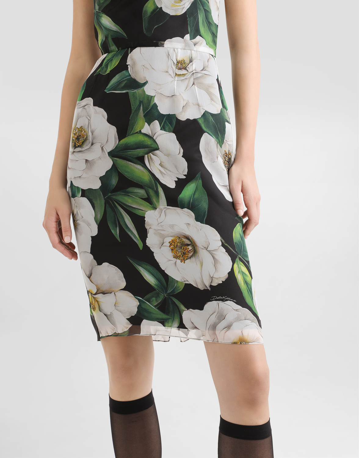 Платье-миди из шелкового шифона с принтом гардений: • Многоцветное • Вырез с капюшоном • Без рукавов • Подкладка-комбинация из эластичного шелкового крепдешина • Застежка-молния сзади • Длина изделия от талии - 60 см для размера IT 40 • Модель ростом 175 см, на ней размер IT 40 • Сделано в Италии