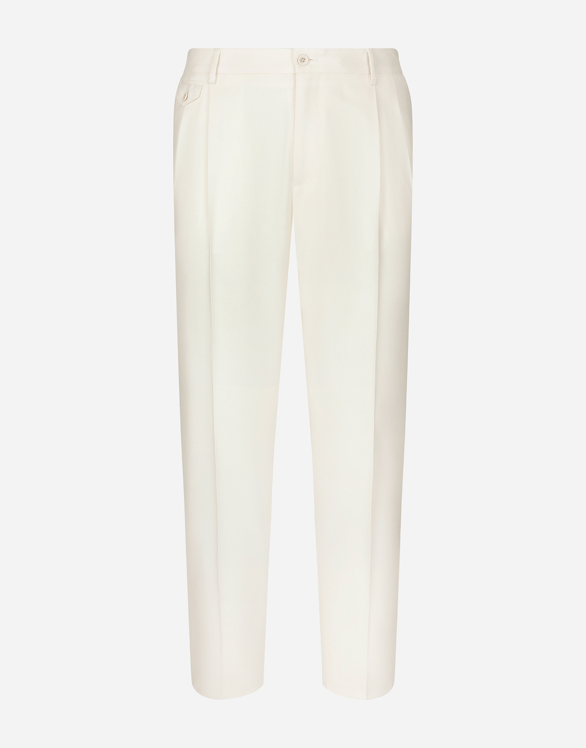 Классические брюки из фланели: • Цвет: слоновая кость • Прямой крой • Шлевки для ремня на поясе • Застежка-гульфик на молнии и пуговице • Две вытачки • Косые карманы спереди, карман для монет и прорезные карманы с пуговицами сзади • Длина по внешнему шву 105,5 см, ширина низа брючины - 18 см для размера IT 48 • Сделано в Италии