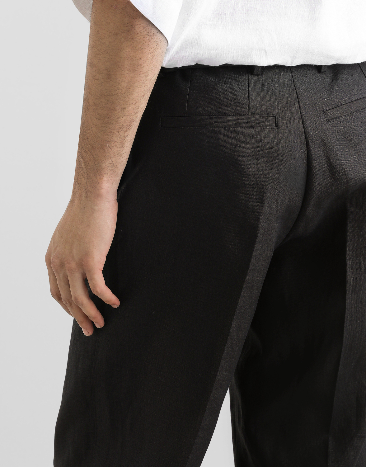 Классические брюки из льняной ткани: • Черные • Прямой крой • Шлевки для ремня на поясе • Застежка на молнию с клапаном и пуговицу • Передние карманы с наклонным входом и задние прорезные карманы • Длина изделия по внешнему шву - 100 см, ширина низа - 18 см для размера IT 48 • Сделано в Италии