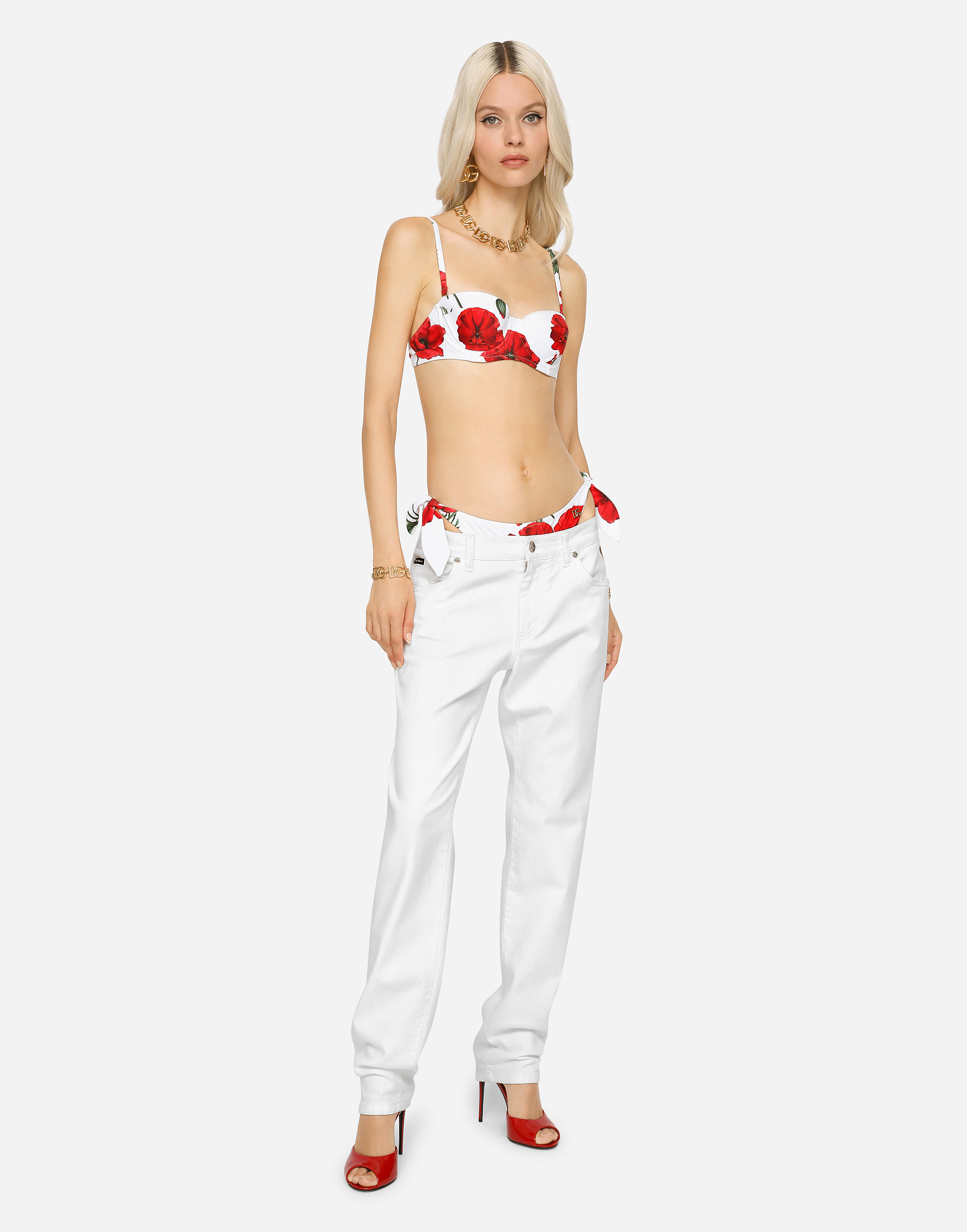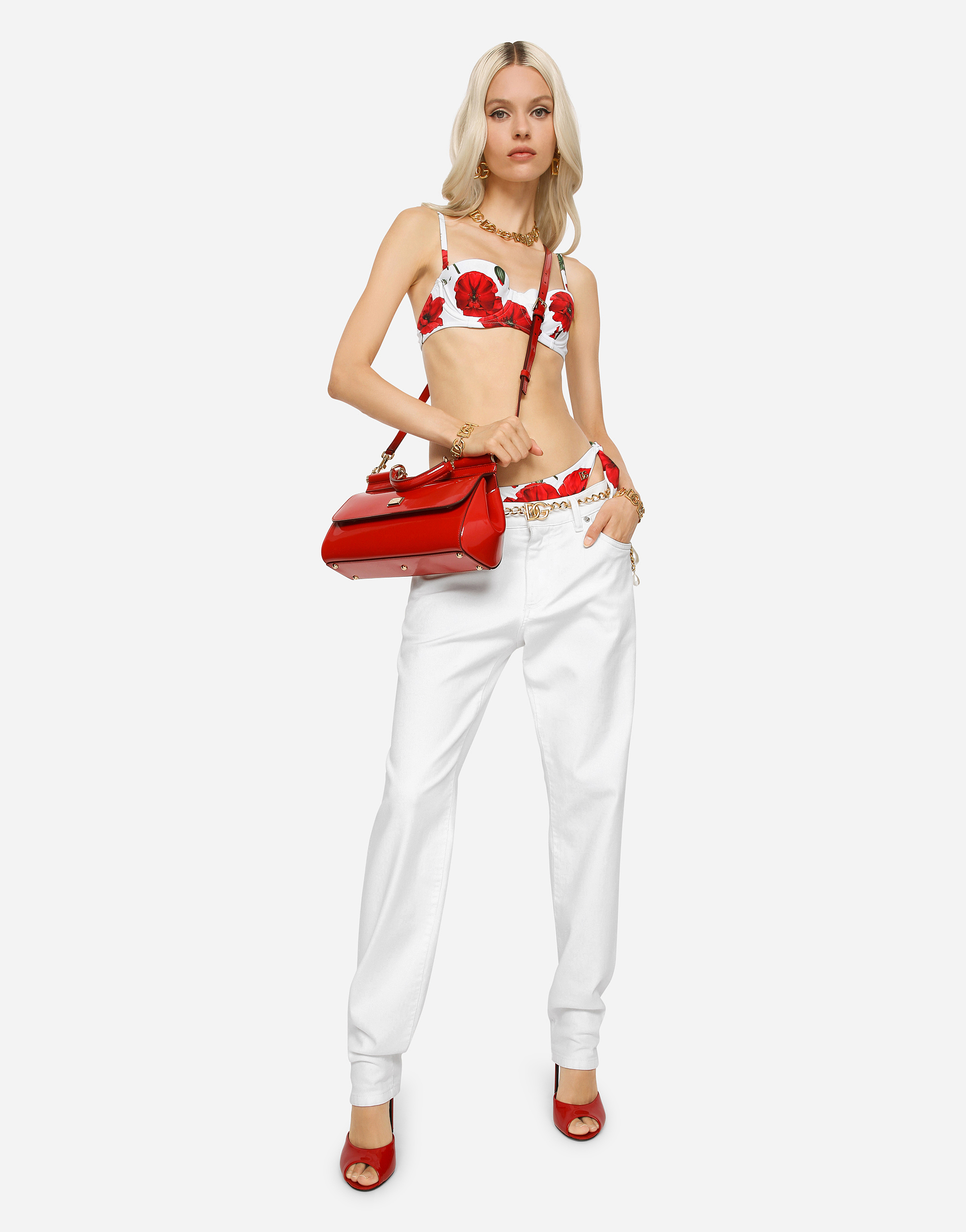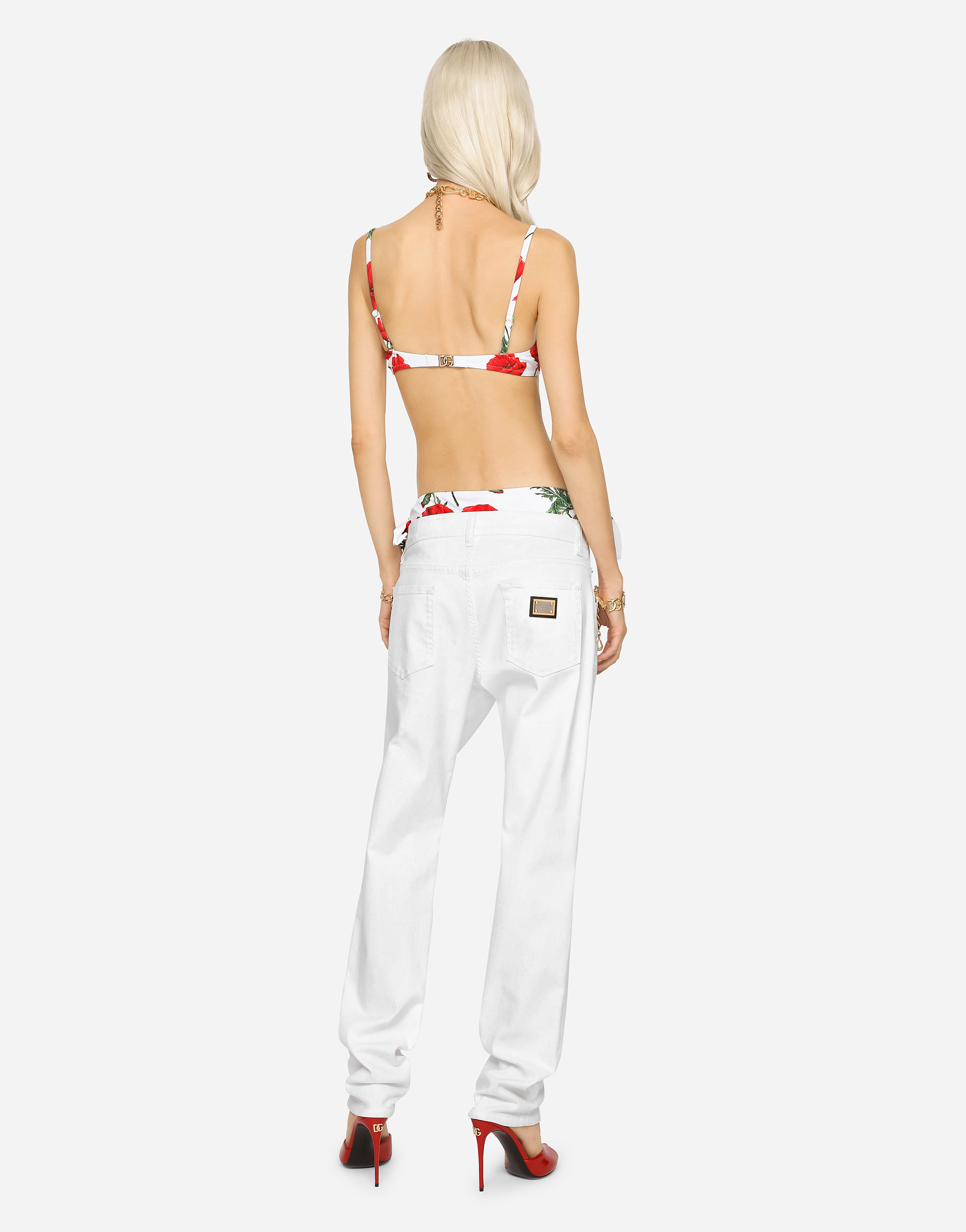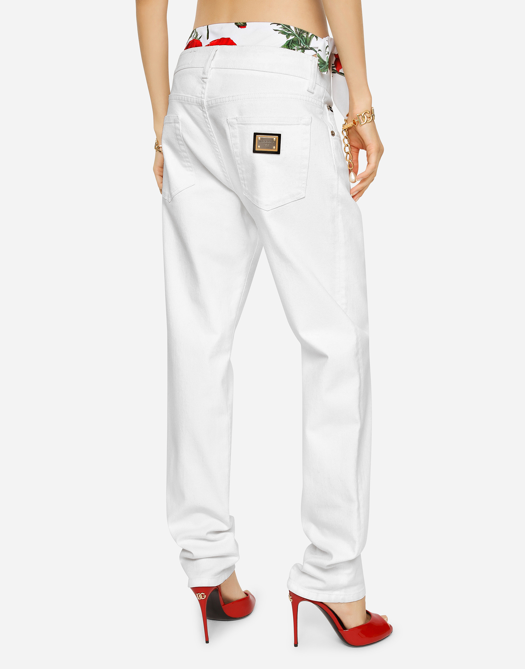 Джинсы: • Белые • Средняя посадка • 5 карманов • Фирменная металлическая и кожаная нашивка • Фирменная нашивка на часовом кармашке • Длина по внутреннему шву: 77 см • Ширина низа брючины: 16,5 см • Застежка на молнию и фирменную металлическую пуговицу • Модель ростом 175 см, размер IT 40 • Сделано в Италии