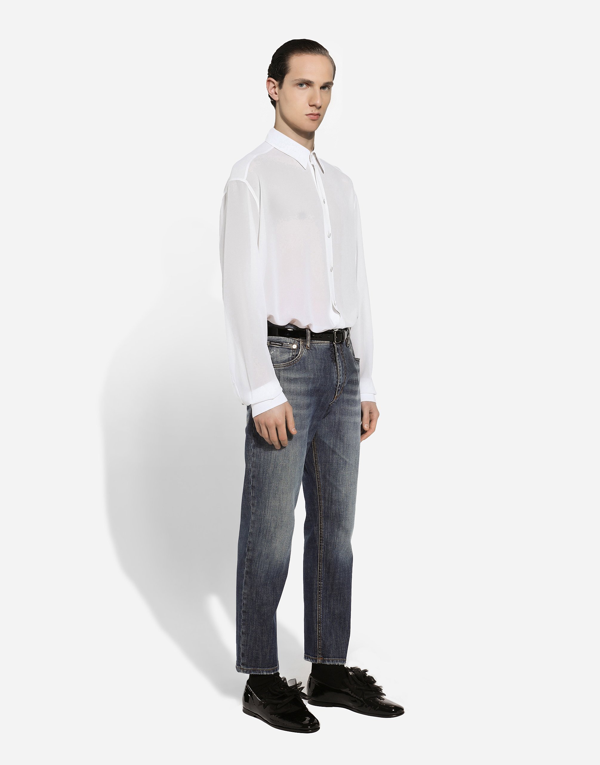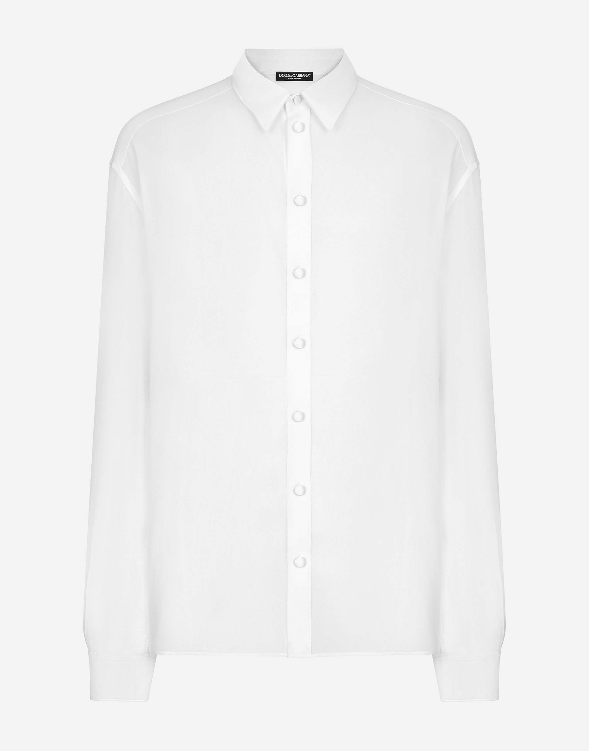 Рубашка из шелкового крепа-жоржета: • Белый цвет • Свободный крой (оверсайз) • Воротник Кент • Длинные рукава • Застегивается на пуговицы • Задняя кокетка с встречной складкой по низу • Длина рубашки 80 см от шва воротника по спинке для размера IT 40 • Сделано в Италии