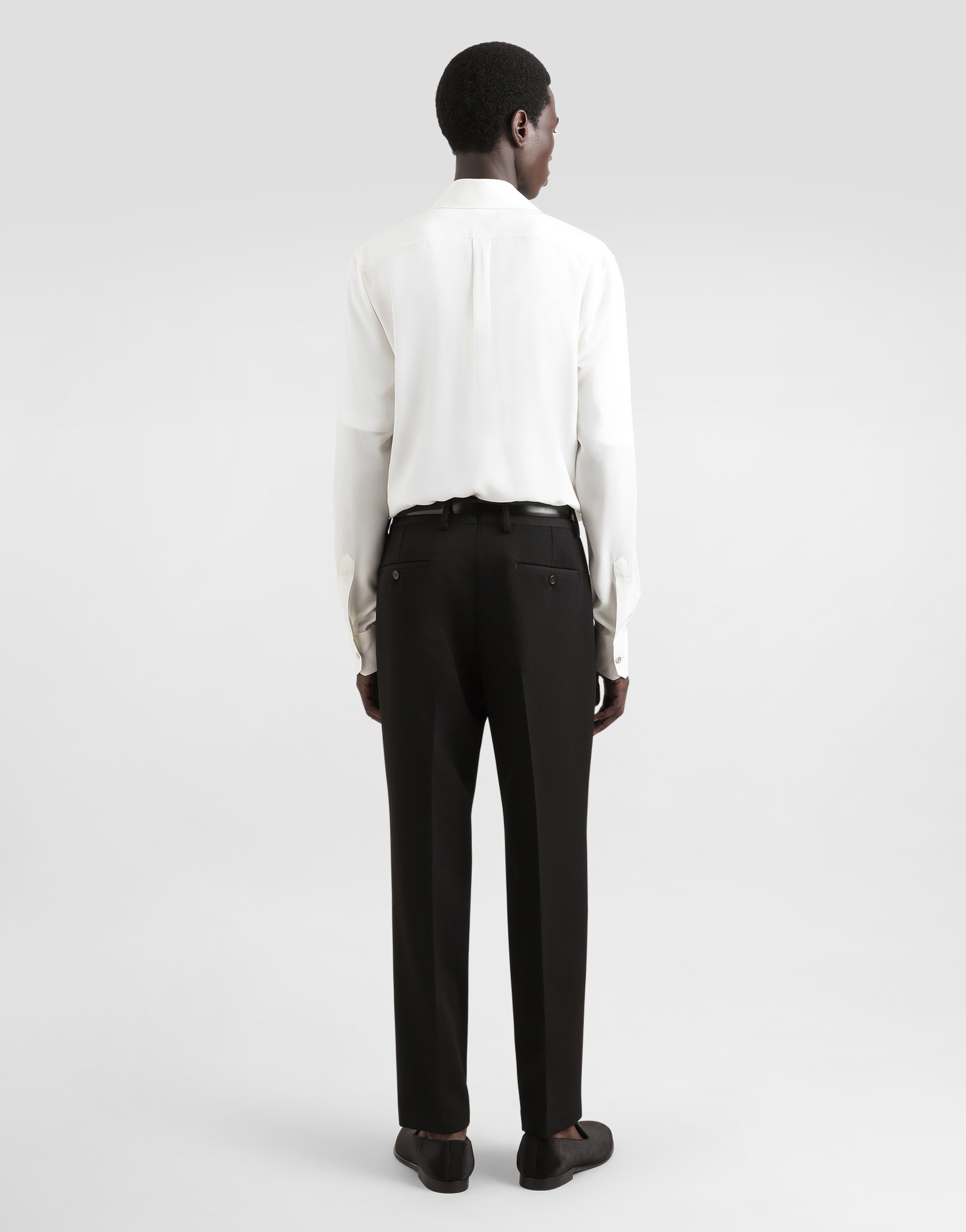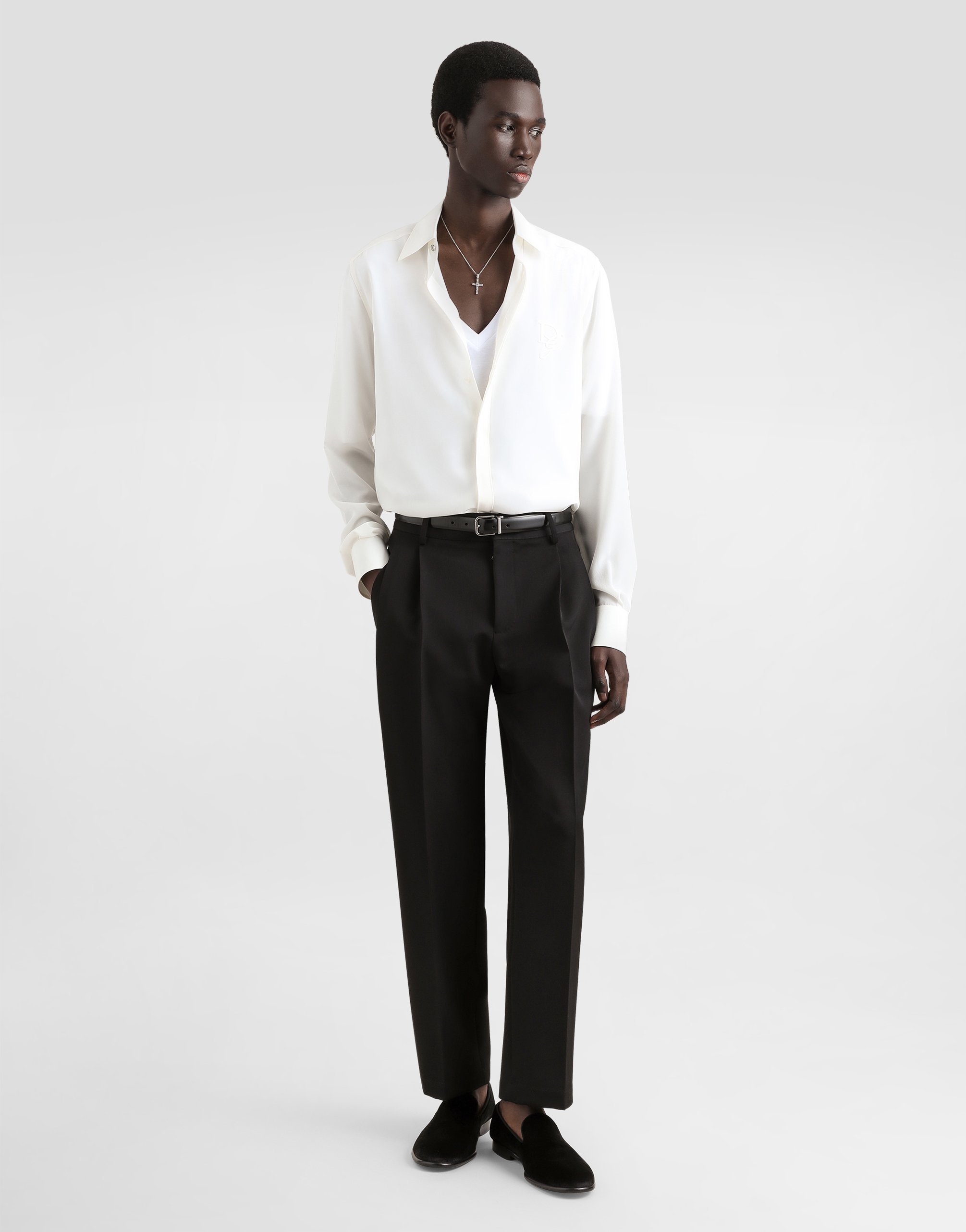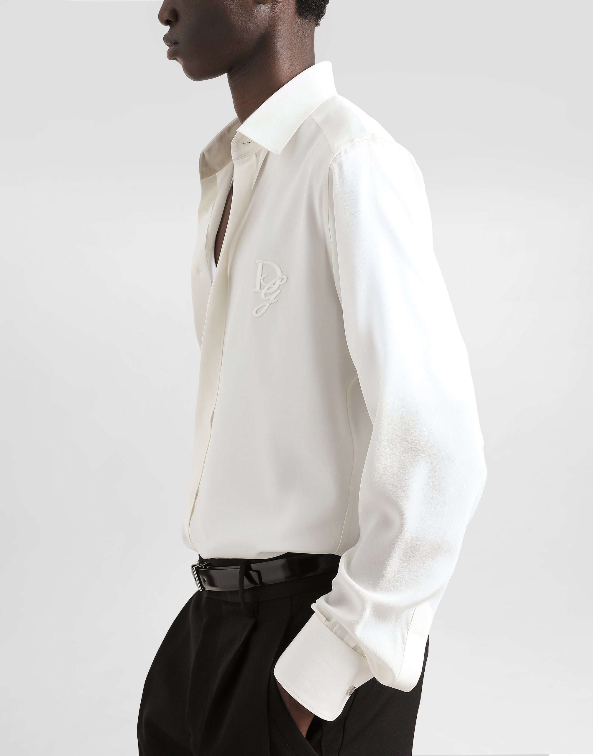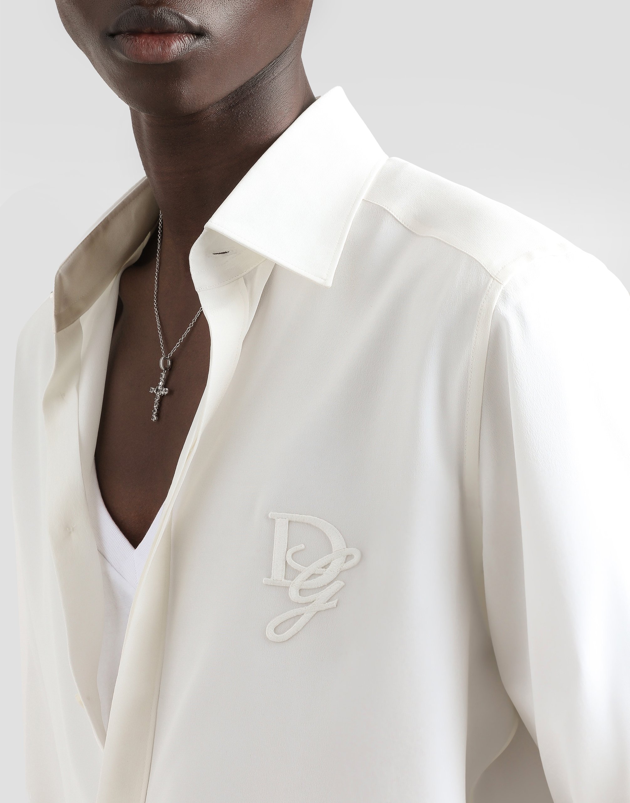 Рубашка из шелкового крепдешина с тональной вышивкой логотипа DG: • Белый цвет • Прямой крой Martini • Итальянский воротник • Застежка на пуговицы • Длинные рукава • Длина изделия от шва воротника по спинке - 80 см (размер IT 40) • Сделано в Италии