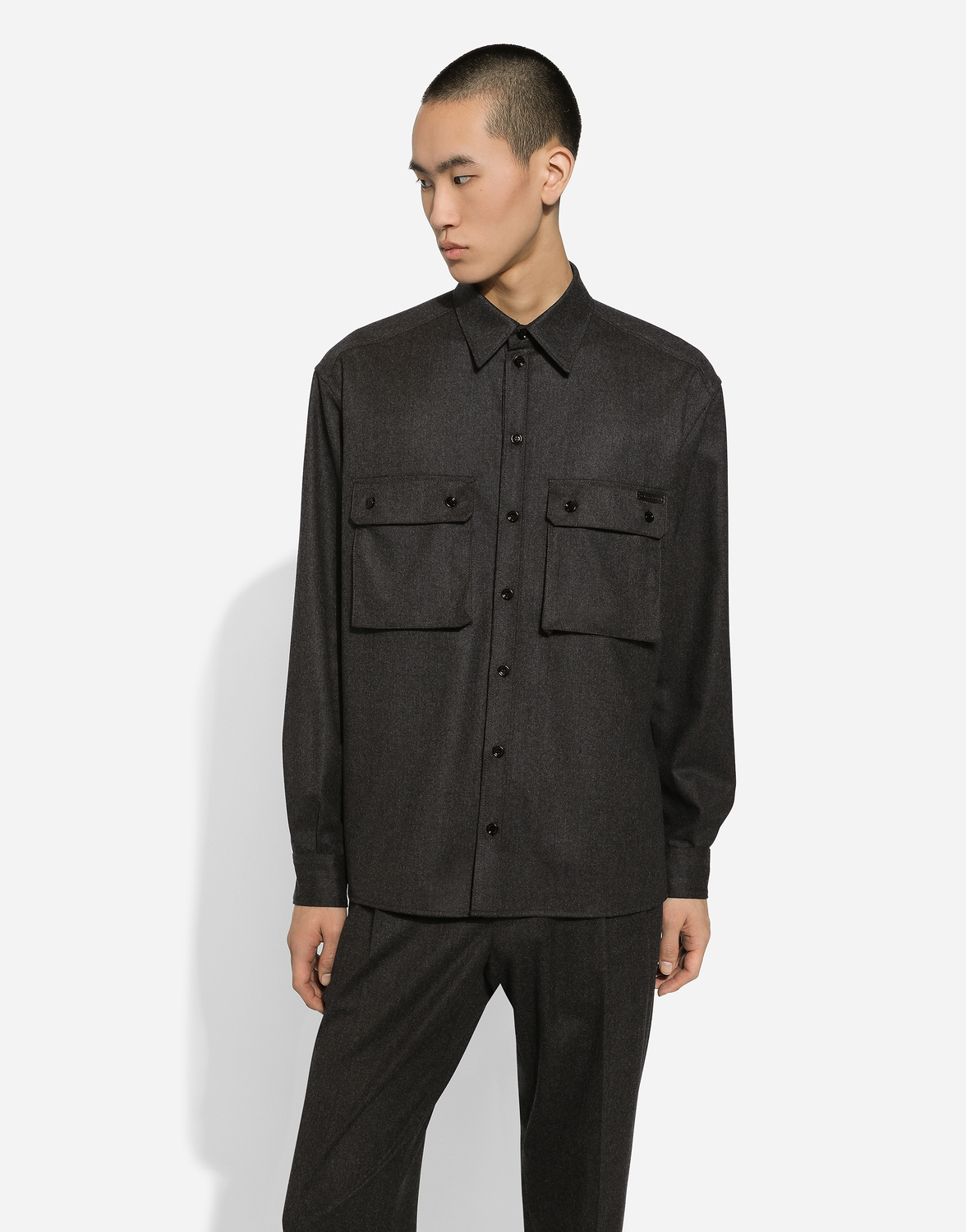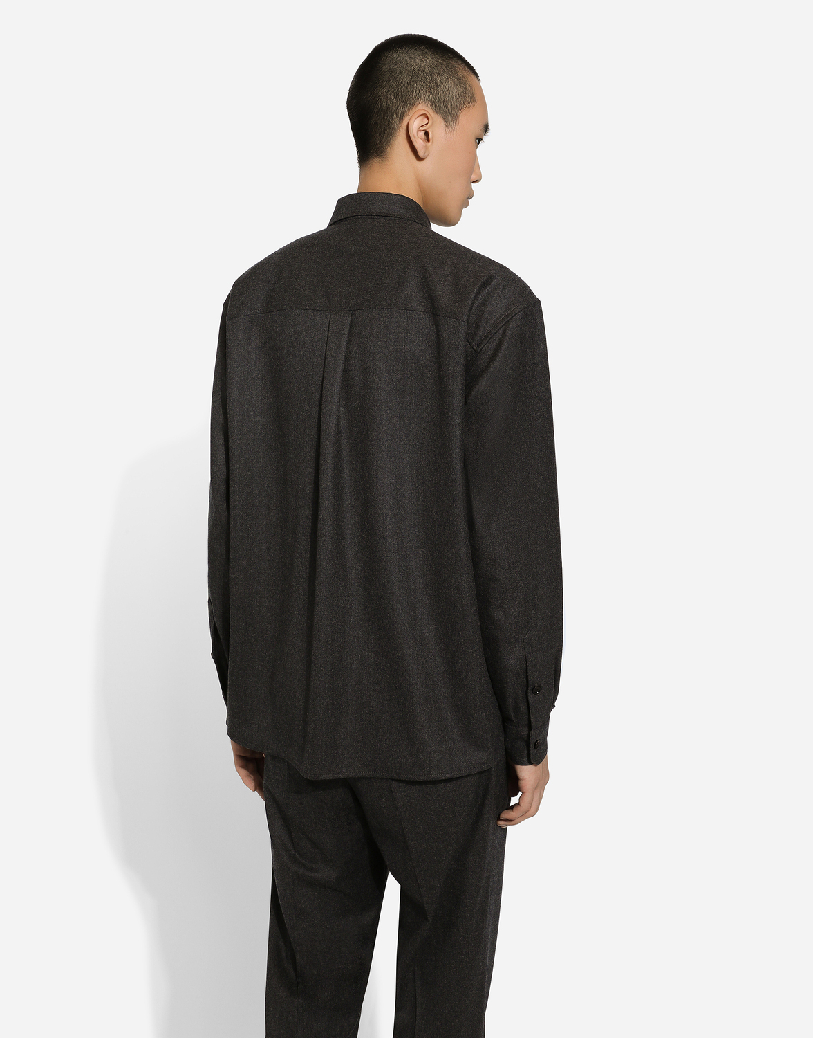 Оверсайз рубашка из шерстяной фланели: • Серый цвет • Свободный крой (оверсайз) • Воротник Кент • Накладные нагрудные карманы с клапаном • Застежка на пуговицы • Длинные рукава • Спинка с кокеткой и вытачками • Длина изделия от воротникового шва по спинке - 79 см (размер IT 40) • Сделано в Италии